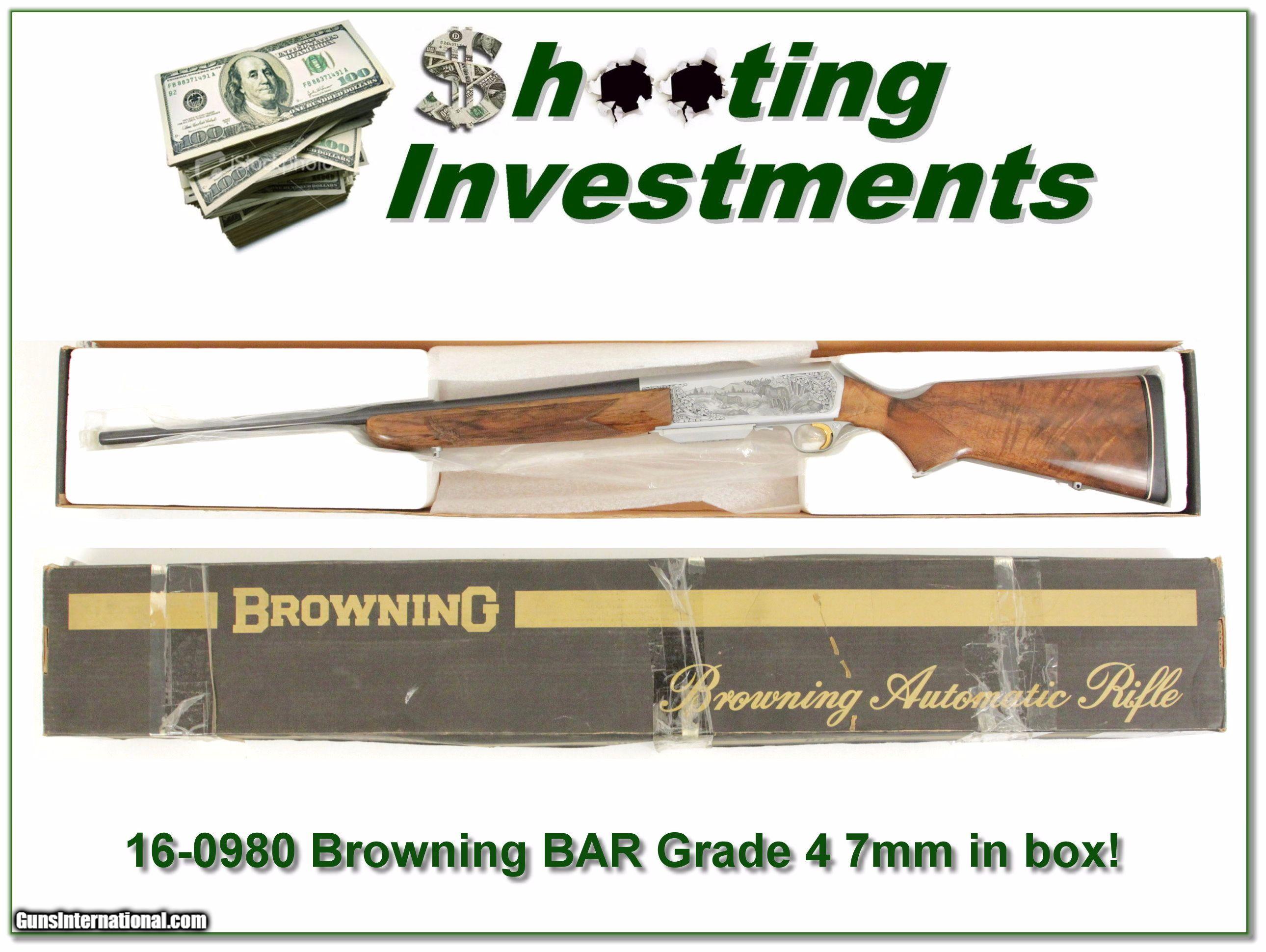 Description: Collectors, this is an unfired and beautiful Browning BAR Grade 4. These are hand engraved and this one is a 7mm Remington Magnum. It comes as shown in original box and will make a find addition to your collection. There are 3 dings on the left side of the stock otherwise perfect. I am selling this one on consignment and as such, lay-a-way can’t be used. It does of course have the standard 3-day inspection. Shipping and insurance is $35. Please email me with any questions or larger pictures. (Consign your quality firearms with Shooting Investments for only 10%! Let me know if you have any you would like to sell!) 16-0980 Payment: Payment is by Money Order, Cashiers Check or Personal Check. I can now also accept MasterCard and Visa with a 3% convenience fee. PayPal can be used for some items but never firearms. Please let us know if you would like to pay via PayPal. Shipping: The shipping charge will be listed in each description. It is $35 for most guns. Some heavy guns or those insured for over $2000 will be higher. Shipments to Alaska and Hawaii are higher because air shipment is required. Most firearms are shipped within 5 days of receipt of payment. We prefer shipping at the beginning of the week to avoid firearms in transit over weekends. We package all shipments carefully and insure them for the full purchase price, rounded up to the next $100. In the unlikely event that damage occurs, it is important that you save all packaging material for the claims process. Optics are shipped Priority Mail and most other non-firearm shipments are shipped First Class. Returns: Our return policy is simple. If for any reason you are not pleased with your purchase, you may return your item for a refund. The only exception is ammunition, it cannot be returned. It is important to us that you are happy. Guns cannot be fired or dissembled before returning them and must be returned in the same condition as received. Notification of a return must occur with-in 3 days of receipt at your dealer. Shipping, convenience and dealer fees are not refundable and are the responsibility of the buyer. Lay-a-way: If needed, we offer a 60 day lay-a-way option on most firearms. It is 1/3 now, 1/3 in 30 days and 1/3 in 60 days. Lay-a-way firearm sales are final. Consigning your firearms with Shooting Investments: We will help you get top dollar for your firearms. While most local guns shops charge 20% or more, our fee is only 10% with a minimum of $50. At your local gun shop it might take months to sell. Selling on-line provides instant access to thousands of interested buyers. You won’t find any other on-line dealer willing to sell your firearms for only 10% or listing every gun on 4 separate s. Selling through an House typically costs the seller 15% and the buyer an addition 15% (so 30%) and you have to wait several months to sell and longer to receive funds. If properly priced, we will sell your firearms in a week or two. Send us an email or give us a call and we’ll explain how easy it is for you to get top dollar. Trading: We collect guns and usually just trade for guns we want to add to our collections. We often sell guns for others wanting to purchase one of ours. We find this the most fair to both of us. Our Commission is only 10% and we hold the gun you want until yours sells. Please contact us if you want to sell one of yours to buy one of ours. Help for California Buyers: We are happy to ship to California. It is the buyer’s responsibility to make sure any item you buy is legal in your state. We are also happy to help with your purchase of a firearm from someone other than us. If you see a gun you would like to buy but the seller can’t or won’t ship to California we can help. You buy the gun and have it shipped to us. We’ll then ship it to your California dealer. The cost for this service is only $30 + shipping. Let me know if we can help! SOLD |
