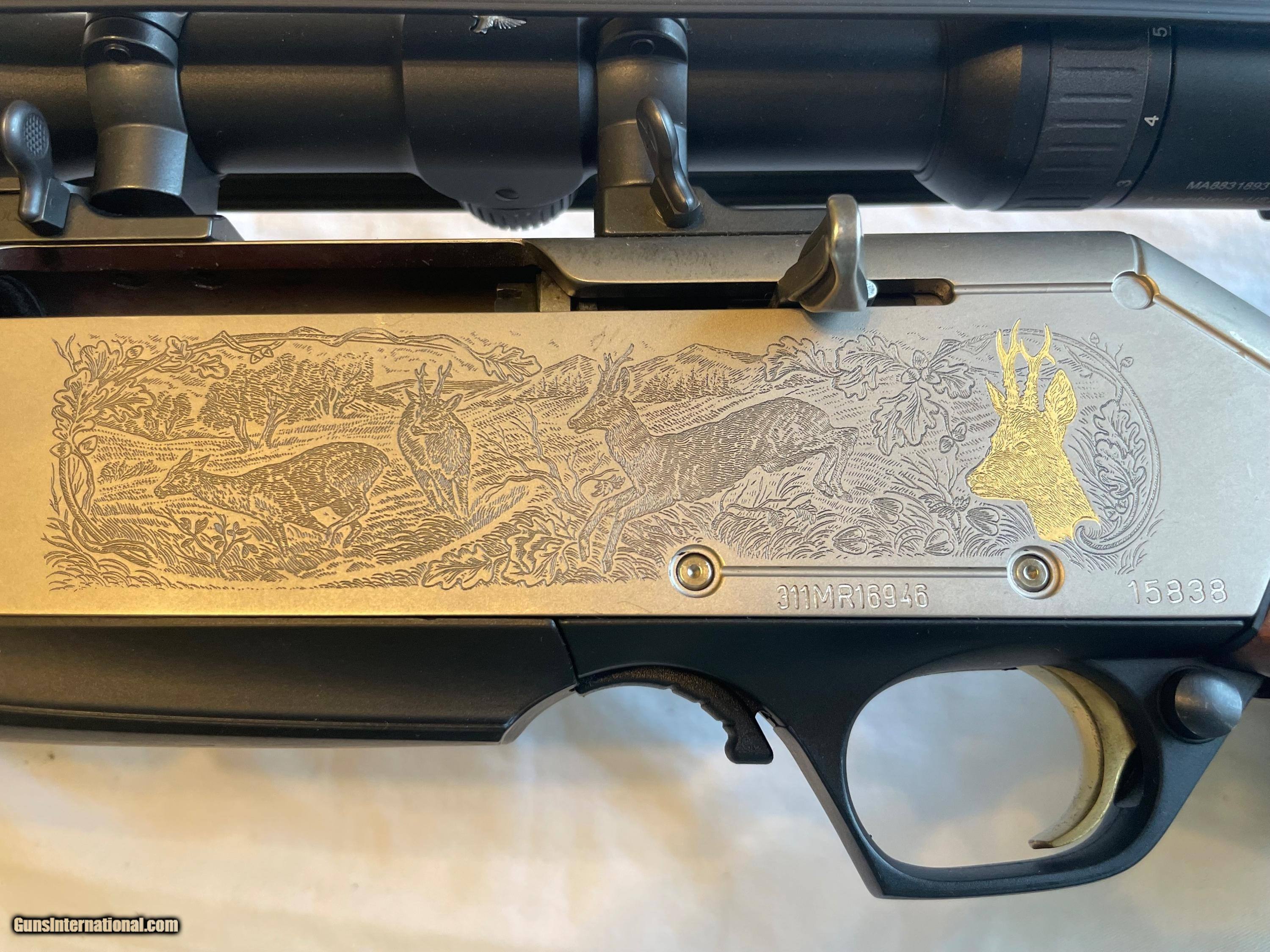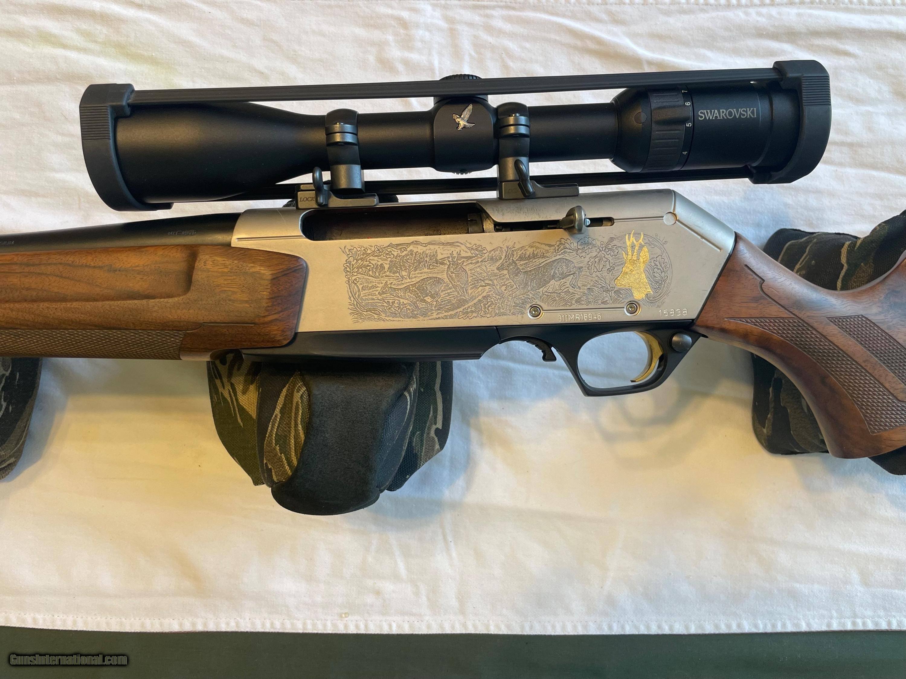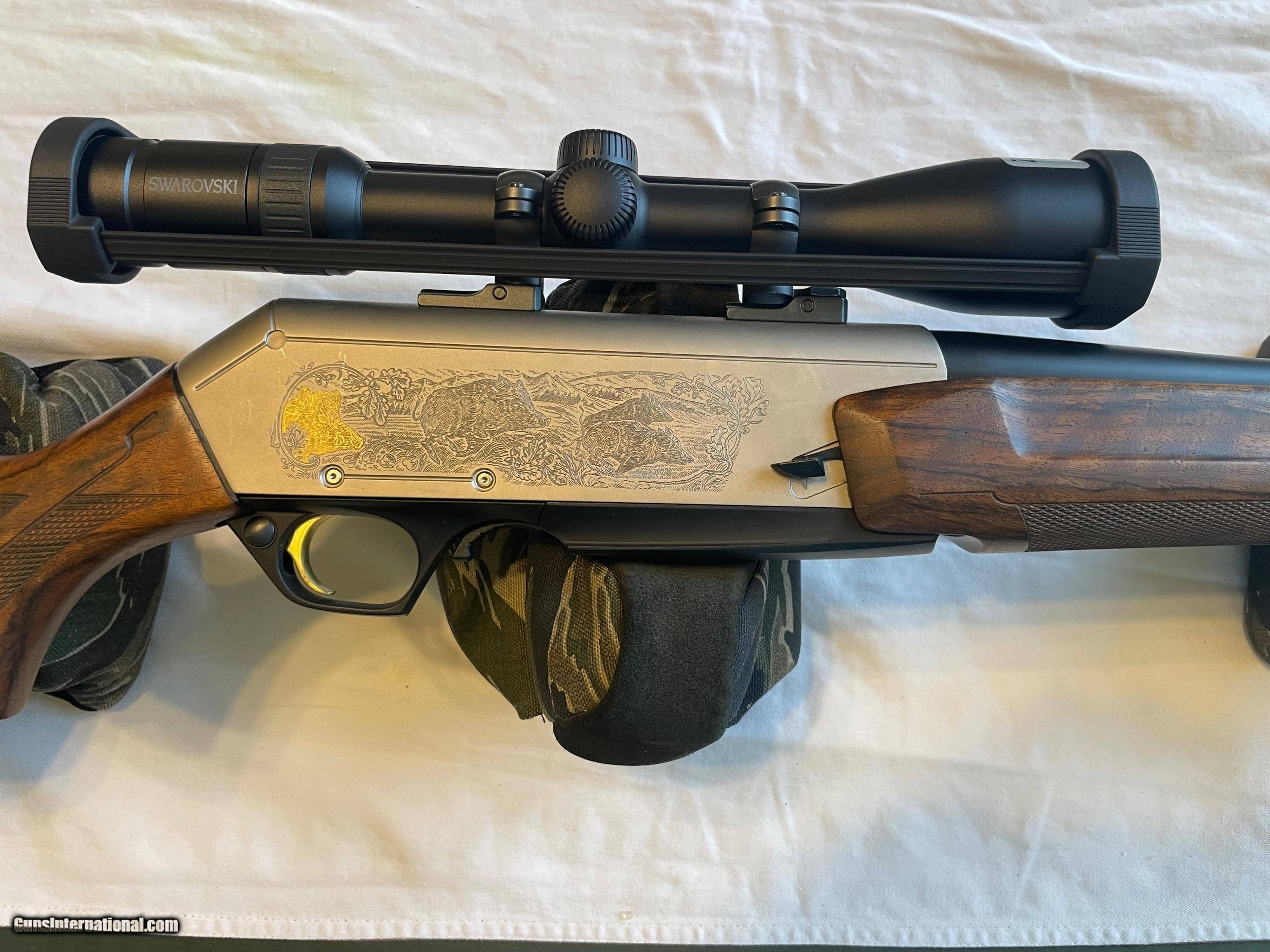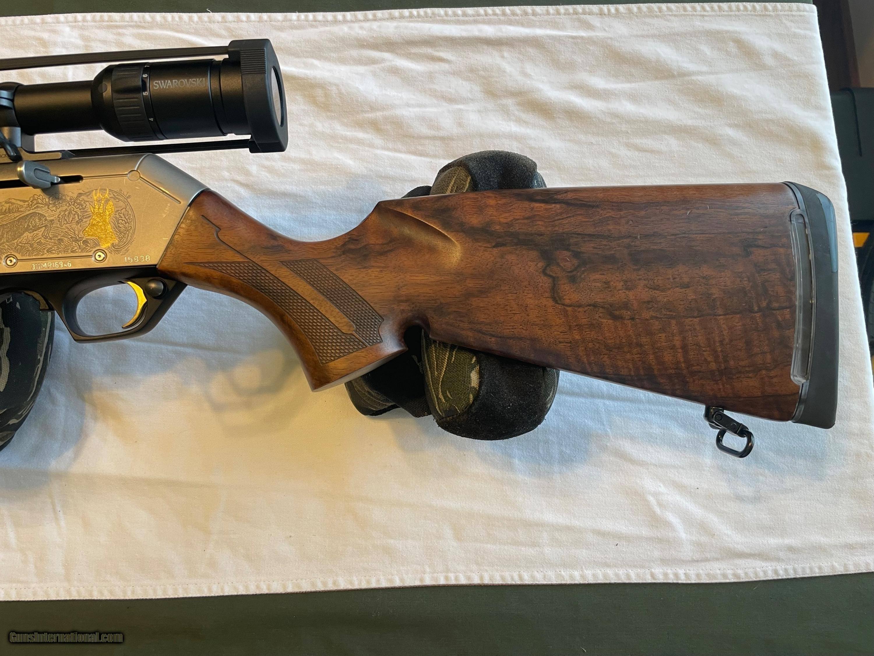 Description: From a South Texas ranch owner and hunter's personal collection, this is a left handed Belgium made Browning High Grade BAR semi-automatic Long Trac 9.3 x 62mm rifle with fancy receiver engraving and gold inlays. Comes with a Swarovski Z-3 Series 3-10 x 42mm scope with blank reticle and scope caps. Rifle is in excellent condition and comes with removable clip. Super light with scope at only 8 lbs FFL has listed separately several boxes of both Nosler and Hornady DGS ammo in both 250 gr & 286 gr rounds. SOLD Rifle Caliber: 9.3x62mm Manufacturer: Browning Belgium Model: BAR High Grade Serial Number: 311MR16946 Barrel Length: 21” Condition: Excellent Metal Condition: Excellent Wood Condition: Excellent Bore Condition: Excellent Barrel Type: Fluted Action: Semi-auto LOP: 14.25” Weight: 8lbs with scope |