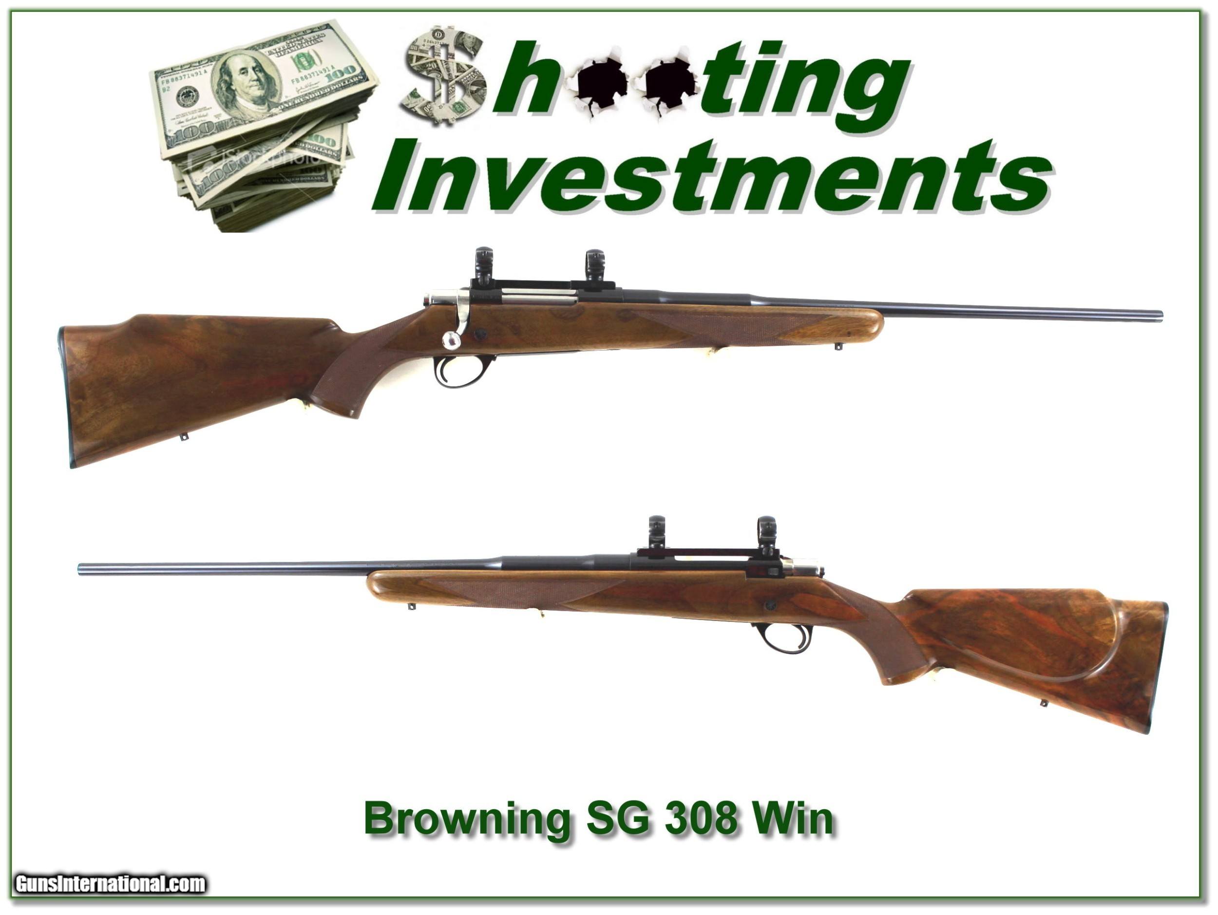Description: Collectors, this is a beautiful and I believe unfired Browning Safari Grade in 308 Winchester. It was made in 1974 after the saltwood issues so there are no worries there. It has a 22in pencil barrel and comes with period bases and rings as seen. The metal mint and look at the wood! It is nicer than some Medallion Grade Brownings. I find only a couple insignificant marks on the toe of the stock. You will look hard to find a nicer one. Shipping and insurance is $49. Please email me with any questions or larger pictures. (Consign your quality firearms with Shooting Investments for only 12%! Let me know if you have any you would like to sell!) 22-1099 Payment: Payment is by Money Order, Cashiers Check or Personal Check. I can now also accept Credit Cards (MasterCard, Visa, Discover & American Express) with a 3% convenience fee. Shipping: The shipping charge will be listed in each description. It is $49 for most long guns. Some heavy guns, over 48in boxes or those insured for over $2000 will be higher. Shipments to Alaska and Hawaii are higher because air shipment is required. Most firearms are shipped on Tuesday and Thursday and usually in 5 days of receipt of payment. We package all shipments carefully and insure them. Optics are shipped Priority Mail and most other non-firearm shipments are shipped First Class. Returns: Our return policy is simple. If for any reason you are not pleased with your purchase, you may return your item for a full refund of purchase price. Ammunition cannot be returned. It is important to us that you are happy. Guns cannot be fired or dissembled before returning them and they must be returned in the same condition as received. Notification of a return must occur with-in 3 days of receipt at your dealer. Shipping, convenience and dealer fees are not refundable and are the responsibility of the buyer. Lay-a-way: If needed, we offer a 60 day lay-a-way option on most firearms. It is 1/3 now, 1/3 in 30 days and 1/3 in 60 days. Lay-a-way firearm sales are final and if not completed the first payment cannot be returned. Consigning your firearms with Shooting Investments: We will help you get top dollar for your firearms. While most local guns shops charge 20% or more, our fee is only 12% with a minimum of $75. At your local gun shop it might take months to sell. Selling on-line provides instant access to thousands of interested buyers. You won’t find any other on-line dealer willing to sell your firearms for only 12% or listing every gun on 3 separate s. Selling through an House typically costs the seller 15% and the buyer an addition 15% (so 30%) and you have to wait several months to sell and longer to receive funds. If properly priced, we will sell your firearms in a few weeks. Send us an email or give us a call and we’ll explain how easy it is for you to get top dollar. Trading: Trading for use is really just buying your gun to re-sell. If you have a gun you want to trade, please email a picture and we will let you know what we can give or it. You will always get more if we sell it for you on consignment. Help for California Buyers: We are happy to ship to California. It is the buyer’s responsibility to make sure any item you buy is legal in your state. We are also happy to help with your purchase of a firearm from someone other than us. If you see a gun you would like to buy but the seller can’t or won’t ship to California they can ship to use and we’ll then ship it to your California dealer. The cost for this service is only $30 + shipping. Let us know if we can help! SOLD |