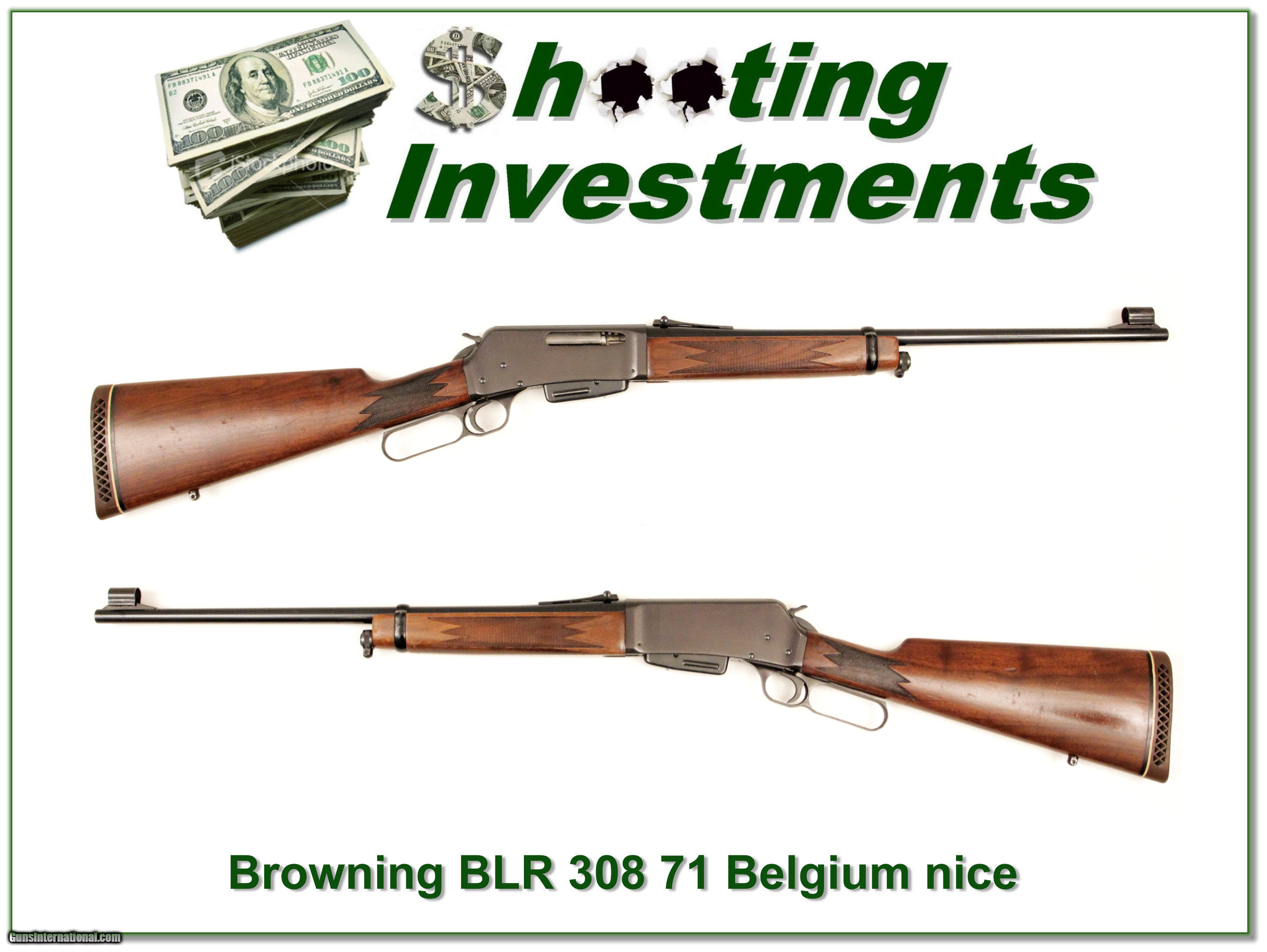 Description: Shooters and hunters, this is the original Belgium BLR in 308 Winchester. These were only made in Belgium for 4 years. This one was made in 1971. It is in very good condition with very nice blue and a few marks on the wood. It will make a classic hunting gun! It is a Shooting Investment and is a gun you can use yet still see go up in value. Shipping and insurance is $35 or $15 more if you want it shipped in a new Plano hard case. Please email me with any questions or larger pictures. (I now consign quality firearms only 10%! Let me know if you have any you would like to sell!) [16-0325] Payment: Payment is by Money Order, Cashiers Check or Personal Check. I can now also accept MasterCard and Visa with a 3% convenience fee. PayPal can be used for some items but never firearms. Please let us know if you would like to pay via PayPal. Shipping: The shipping charge will be listed in each description. It is $35 for most guns. Some heavy guns or those insured for over $2000 will be higher. Shipments to Alaska and Hawaii are higher because air shipment is required. Most firearms are shipped within 5 days of receipt of payment. We prefer shipping at the beginning of the week to avoid firearms in transit over weekends. We package all shipments carefully and insure them for the full purchase price, rounded up to the next $100. In the unlikely event that damage occurs, it is important that you save all packaging material for the claims process. Optics are shipped Priority Mail and most other non-firearm shipments are shipped First Class. Returns: Our return policy is simple. If for any reason you are not pleased with your purchase, you may return your item for a refund. The only exception is ammunition, it cannot be returned. It is important to us that you are happy. Guns cannot be fired or dissembled before returning them and must be returned in the same condition as received. Notification of a return must occur with-in 3 days of receipt at your dealer. Shipping, convenience and dealer fees are not refundable and are the responsibility of the buyer. Lay-a-way: If needed, we offer a 60 day lay-a-way option on most firearms. It is 1/3 now, 1/3 in 30 days and 1/3 in 60 days. Lay-a-way firearm sales are final. Consigning your firearms with Shooting Investments: We will help you get top dollar for your firearms. While most local guns shops charge 20% or more, our fee is only 10% with a minimum of $50. At your local gun shop it might take months to sell. Selling on-line provides instant access to thousands of interested buyers. You won’t find any other on-line dealer willing to sell your firearms for only 10% or listing every gun on 4 separate s. Selling through an House typically costs the seller 15% and the buyer an addition 15% (so 30%) and you have to wait several months to sell and longer to receive funds. If properly priced, we will sell your firearms in a week or two. Send us an email or give us a call and we’ll explain how easy it is for you to get top dollar. Trading: We collect guns and usually just trade for guns we want to add to our collections. We often sell guns for others wanting to purchase one of ours. We find this the most fair to both of us. Our Commission is only 10% and we hold the gun you want until yours sells. Please contact us if you want to sell one of yours to buy one of ours. Help for California Buyers: We are happy to ship to California. It is the buyer’s responsibility to make sure any item you buy is legal in your state. We are also happy to help with your purchase of a firearm from someone other than us. If you see a gun you would like to buy but the seller can’t or won’t ship to California we can help. You buy the gun and have it shipped to us. We’ll then ship it to your California dealer. The cost for this service is only $30 + shipping. Let me know if we can help! SOLD |