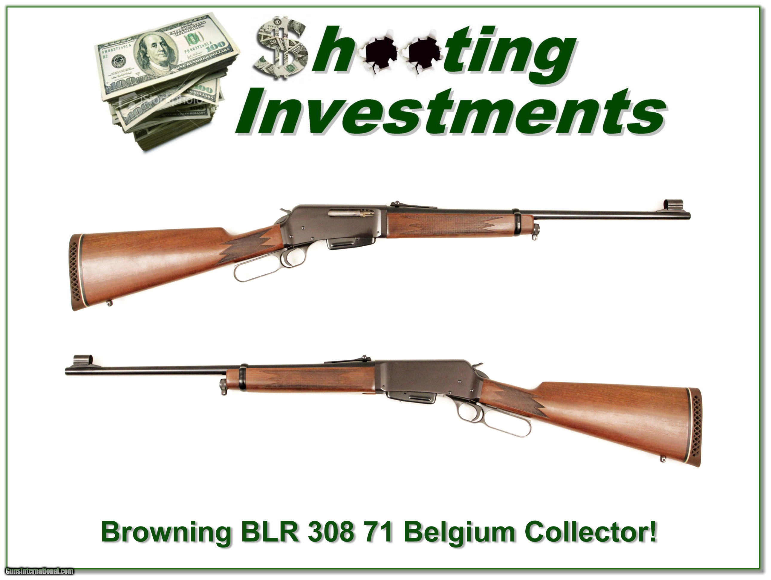 Description: Collectors, this is the original Belgium BLR in 308 Winchester. These were only made in Belgium for 4 years. This one was made in 1971 and is in near new collector condition. It may be unfired. You will look hard to find one as nice. It is a Shooting Investment and is a gun you can expect to increase in value over time. Shipping and insurance is $35 or $15 more if you want it shipped in a new Plano hard case. Please email me with any questions or larger pictures. (I now consign quality firearms only 10%! Let me know if you have any you would like to sell!) [16-0329] Payment: Payment is by Money Order, Cashiers Check or Personal Check. I can now also accept MasterCard and Visa with a 3% convenience fee. PayPal can be used for some items but never firearms. Please let us know if you would like to pay via PayPal. Shipping: The shipping charge will be listed in each description. It is $35 for most guns. Some heavy guns or those insured for over $2000 will be higher. Shipments to Alaska and Hawaii are higher because air shipment is required. Most firearms are shipped within 5 days of receipt of payment. We prefer shipping at the beginning of the week to avoid firearms in transit over weekends. We package all shipments carefully and insure them for the full purchase price, rounded up to the next $100. In the unlikely event that damage occurs, it is important that you save all packaging material for the claims process. Optics are shipped Priority Mail and most other non-firearm shipments are shipped First Class. Returns: Our return policy is simple. If for any reason you are not pleased with your purchase, you may return your item for a refund. The only exception is ammunition, it cannot be returned. It is important to us that you are happy. Guns cannot be fired or dissembled before returning them and must be returned in the same condition as received. Notification of a return must occur with-in 3 days of receipt at your dealer. Shipping, convenience and dealer fees are not refundable and are the responsibility of the buyer. Lay-a-way: If needed, we offer a 60 day lay-a-way option on most firearms. It is 1/3 now, 1/3 in 30 days and 1/3 in 60 days. Lay-a-way firearm sales are final. Consigning your firearms with Shooting Investments: We will help you get top dollar for your firearms. While most local guns shops charge 20% or more, our fee is only 10% with a minimum of $50. At your local gun shop it might take months to sell. Selling on-line provides instant access to thousands of interested buyers. You won’t find any other on-line dealer willing to sell your firearms for only 10% or listing every gun on 4 separate s. Selling through an House typically costs the seller 15% and the buyer an addition 15% (so 30%) and you have to wait several months to sell and longer to receive funds. If properly priced, we will sell your firearms in a week or two. Send us an email or give us a call and we’ll explain how easy it is for you to get top dollar. Trading: We collect guns and usually just trade for guns we want to add to our collections. We often sell guns for others wanting to purchase one of ours. We find this the most fair to both of us. Our Commission is only 10% and we hold the gun you want until yours sells. Please contact us if you want to sell one of yours to buy one of ours. Help for California Buyers: We are happy to ship to California. It is the buyer’s responsibility to make sure any item you buy is legal in your state. We are also happy to help with your purchase of a firearm from someone other than us. If you see a gun you would like to buy but the seller can’t or won’t ship to California we can help. You buy the gun and have it shipped to us. We’ll then ship it to your California dealer. The cost for this service is only $30 + shipping. Let me know if we can help! SOLD |