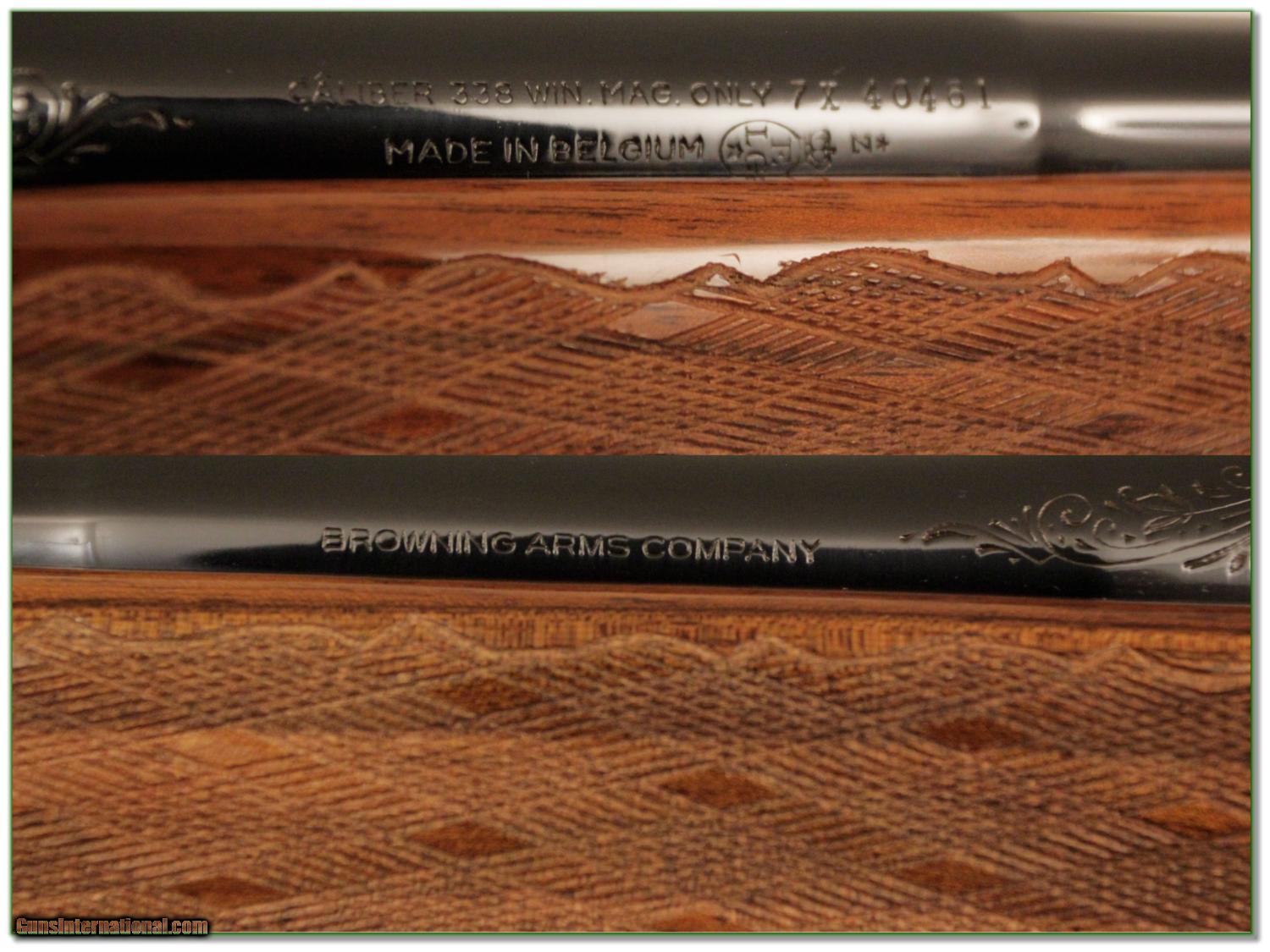 Description: Collectors, this is a Belgium made Browning Medallion Grade 338 Win Mag Long Extractor in as new condition. I believe never fired and look at the wood. It is even better than most of these high grade guns. I am certain this is not a saltwood gun. It will surely increase in value over time and that makes it a real Shooting Investment. Shipping and insurance is $40 or $18 more if you want it shipped in a new Plano hard case. Please email me with any questions or larger pictures. (I now consign quality firearms only 10%! Let me know if you have any you would like to sell!) [14-0865] Payment: Payment is by Money Order, Cashiers Check or Personal Check. I can now also accept MasterCard and Visa with a 3% convenience fee. PayPal can be used for some items but never firearms. Please let us know if you would like to pay via PayPal. Shipping: The shipping charge will be listed in each description. It is $30 for most guns. Some heavy guns or those insured for over $2000 may be higher. Shipments to Alaska and Hawaii are higher because air shipment is required. Most firearms are shipped within 5 days of receipt of payment. We prefer shipping at the beginning of the week to avoid firearms in transit over weekends. We package all shipments carefully and insure them for the full purchase price, rounded up to the next $100. In the unlikely event that damage occurs, it is important that you save all packaging material for the claims process. Optics are shipped Priority Mail and most other non-firearm shipments are shipped First Class. Returns: Our return policy is simple. If for any reason you are not pleased with your purchase, you may return your item for a refund. The only exception is ammunition, it cannot be returned. It is important to us that you are happy. Guns cannot be fired or dissembled before returning them and must be returned in the same condition as received. Notification of a return must occur with-in 3 days of receipt at your dealer. Shipping, convenience and dealer fees are not refundable and are the responsibility of the buyer. Lay-a-way: If needed, we offer a 60 day lay-a-way option on most firearms. It is 1/3 now, 1/3 in 30 days and 1/3 in 60 days. Lay-a-way firearm sales are final. Consigning your firearms with Shooting Investments: We will help you get top dollar for your firearms. While most local guns shops charge 20% or more, our fee is only 10% with a minimum of $50. At your local gun shop it might take months to sell. Selling on-line provides instant access to thousands of interested buyers. You won’t find any other on-line dealer willing to sell your firearms for only 10% or listing every gun on 4 separate s. Selling through an House typically costs the seller 15% and the buyer an addition 15% (so 30%) and you have to wait several months to sell and longer to receive funds. If properly priced, we will sell your firearms in a week or two. Send us an email or give us a call and we’ll explain how easy it is for you to get top dollar. Trading: We collect guns and usually just trade for guns we want to add to our collections. We often sell guns for others wanting to purchase one of ours. We find this the most fair to both of us. Our Commission is only 10% and we hold the gun you want until yours sells. Please contact us if you want to sell one of yours to buy one of ours. Help for California Buyers: We are happy to ship to California. It is the buyer’s responsibility to make sure any item you buy is legal in your state. We are also happy to help with your purchase of a firearm from someone other than us. If you see a gun you would like to buy but the seller can’t or won’t ship to California we can help. You buy the gun and have it shipped to us. We’ll then ship it to your California dealer. The cost for this service is only $30 + shipping. Let me know if we can help! SOLD |