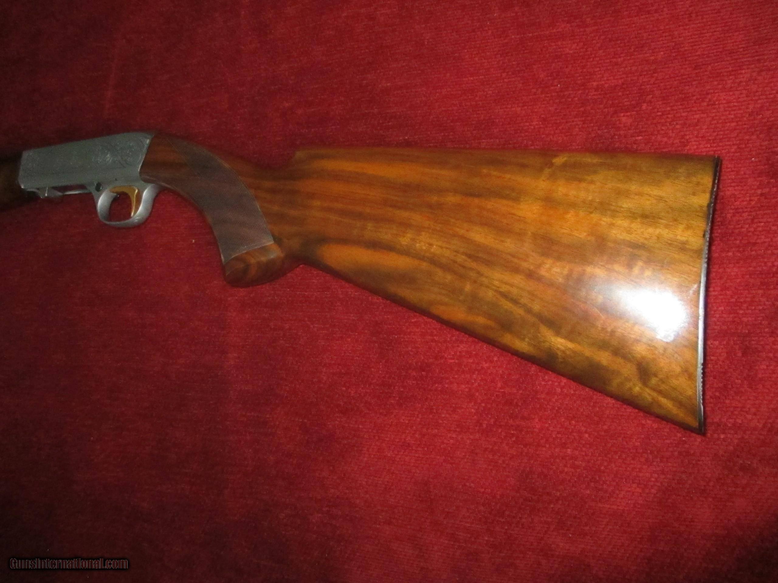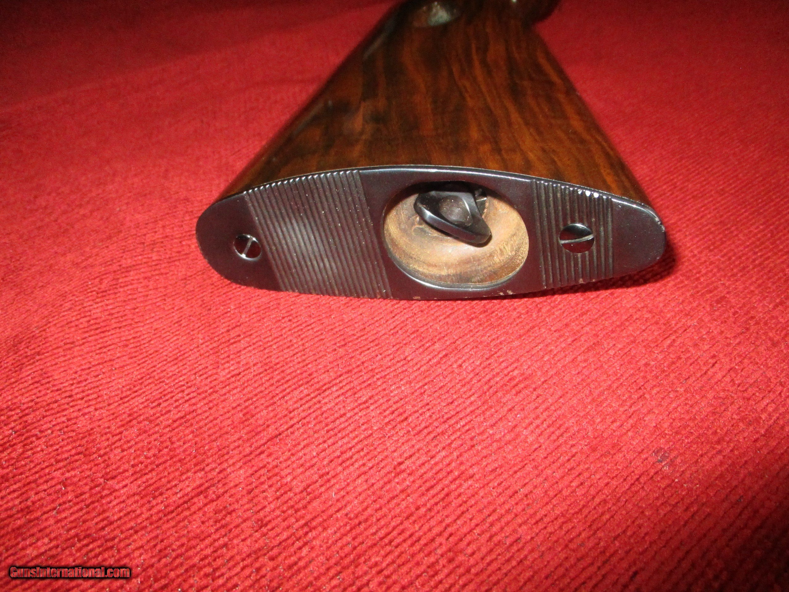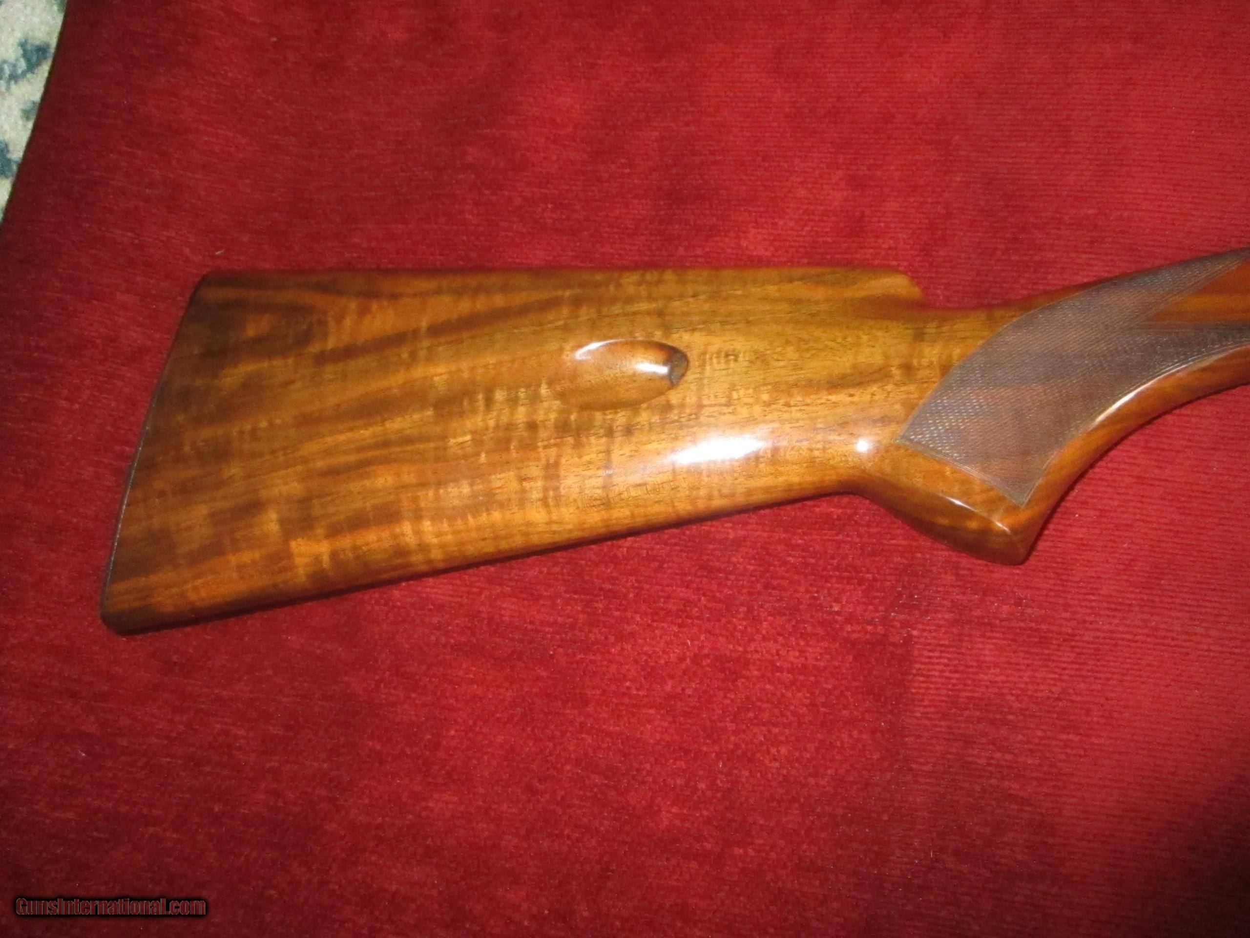 Description: 19 1/4" bbl., blade front, pop-up rear, tube magazine rear load or side stock loadedm checkered exotic European Circasian walnut stock & forearm, checkered steel buttplate case ,manual 99% as new SOLD |