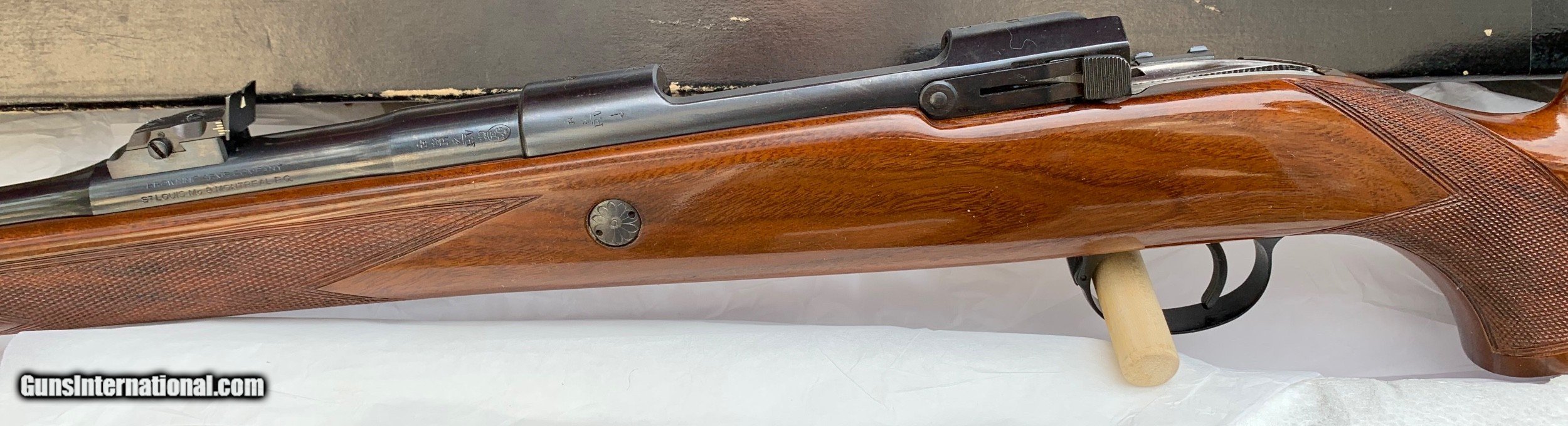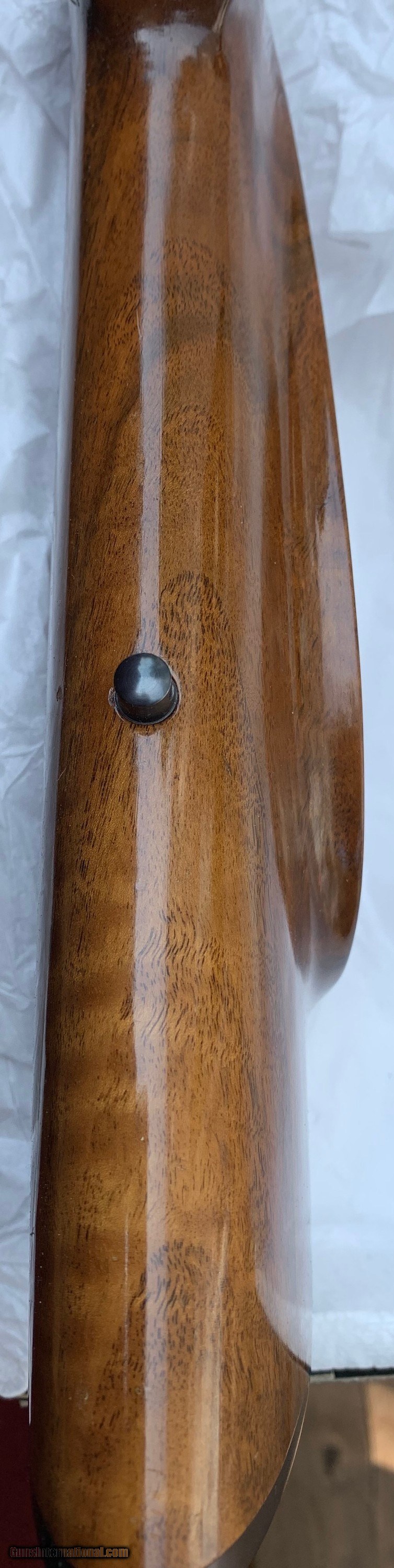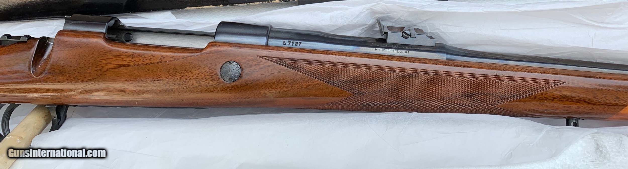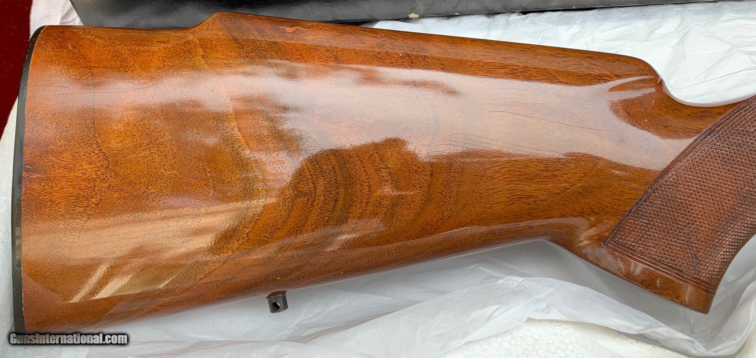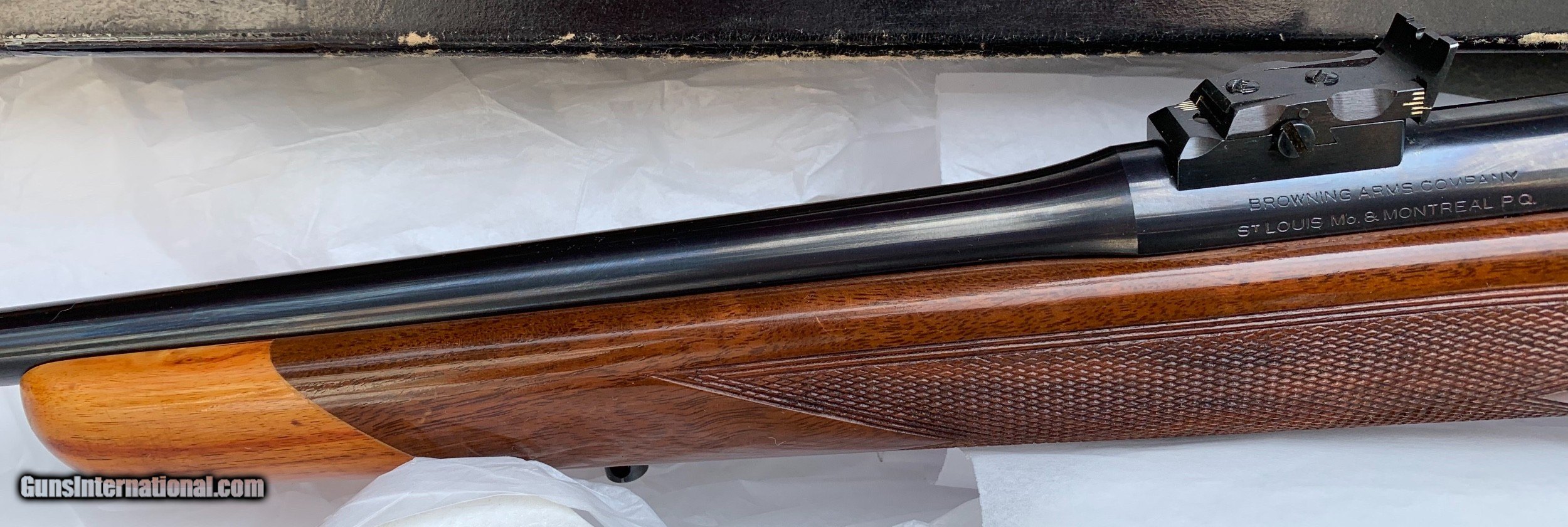 Description: BROWNING SAFARI 243. Small ring Mauser action. Made 1960. These smsll ring 243's were only made until 1964.Has what appears to be the correct box but there is no end label. Has the more desirable early square bridge rear sight. Gun appears all original and is rare for a couple of reasons. It has a 22" pencil barrel instead of the standard contour 22" barrel usually found on these guns and it has a fore end tip which is rarely seen on a Safari grade Browning. Blue and metal is 99%, wood is 97-98% overall with nice color and figure. Nice collectable and rare Safari. C. & R.-FFL-OK. Shipping and insurance $40. SOLD Curio/Relic: Yes Rifle Caliber: .243 Winchester |