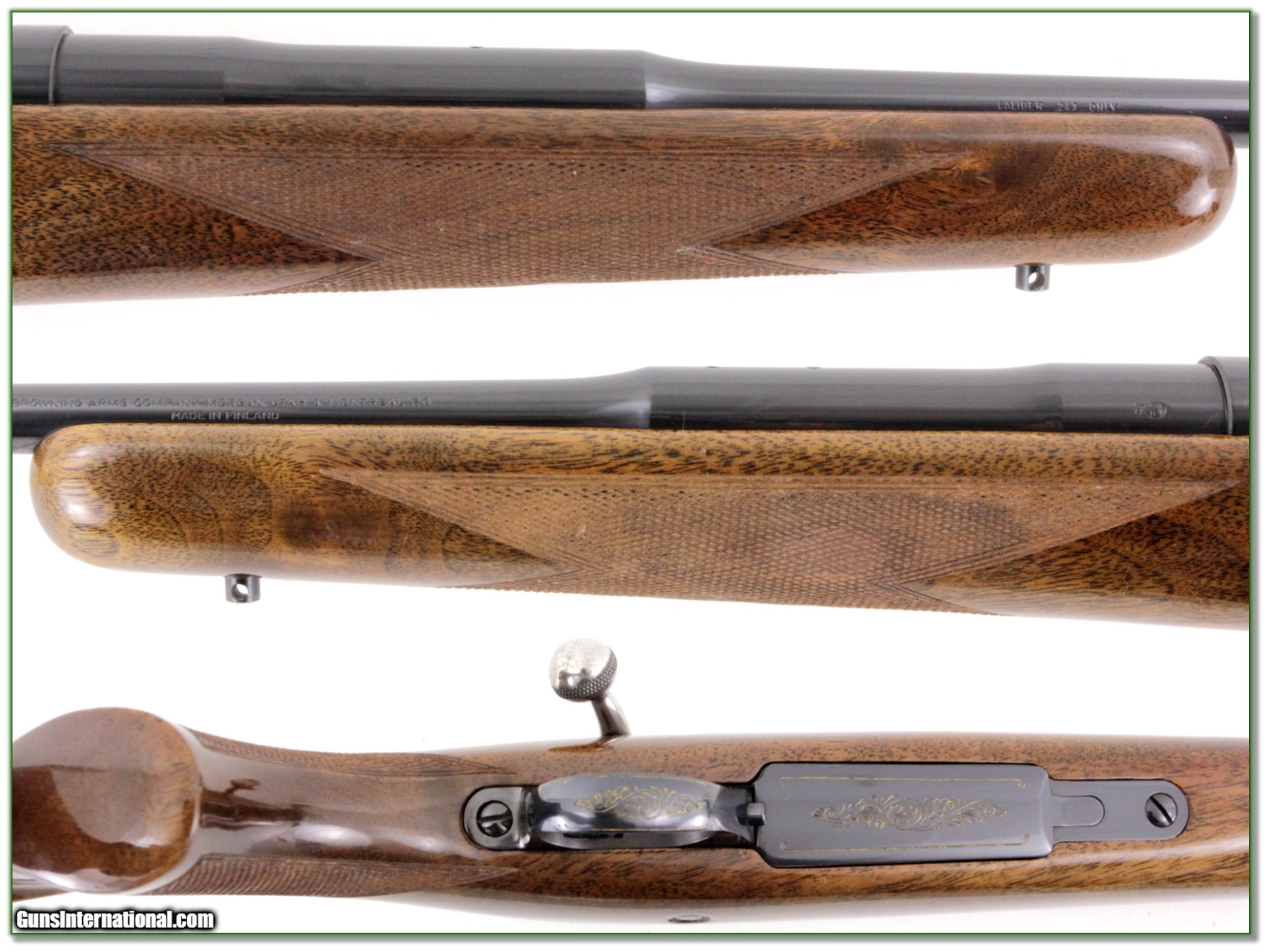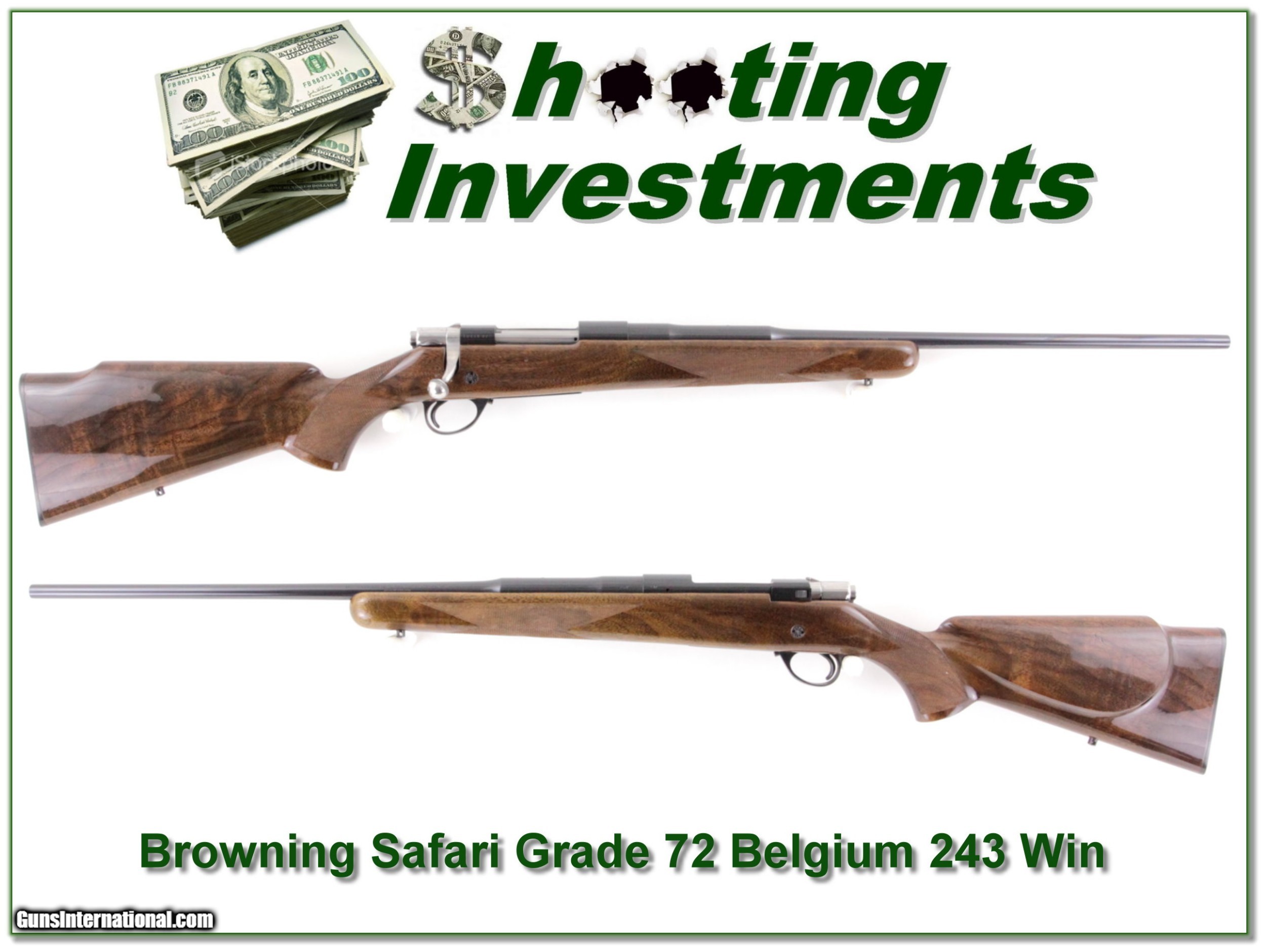 Description: This is a beautiful Browning Safari Grade. These were built on Sako actions are known for superior accuracy. This one was made in 1972 past any saltwood issue. The wood has outstanding grain and colors. The blue is excellent and the wood has a few marks and rubs I expect more from storage than use. Shipping with insurance is $39. Please email me with any questions or larger pictures. (Consign your quality firearms with Shooting Investments for only 12%! Let me know if you have any you would like to sell!) 18-1230 Payment: Payment is by Money Order, Cashiers Check or Personal Check. I can now also accept Credit Cards (MasterCard, Visa, Discover & American Express) with a 3% convenience fee. PayPal can be used for some items but never for firearms. Shipping: The shipping charge will be listed in each description. It is $39 for most firearms. Some heavy guns or those insured for over $2000 will be higher. Shipments to Alaska and Hawaii are higher because air shipment is required. Most firearms are shipped on Tuesday and Thursday and usually in 5 days of receipt of payment. We package all shipments carefully and insure them. Optics are shipped Priority Mail and most other non-firearm shipments are shipped First Class. Returns: Our return policy is simple. If for any reason you are not pleased with your purchase, you may return your item for a full refund of purchase price. Ammunition cannot be returned. It is important to us that you are happy. Guns cannot be fired or dissembled before returning them and they must be returned in the same condition as received. Notification of a return must occur with-in 3 days of receipt at your dealer. Shipping, convenience and dealer fees are not refundable and are the responsibility of the buyer. Lay-a-way: If needed, we offer a 60 day lay-a-way option on most firearms. It is 1/3 now, 1/3 in 30 days and 1/3 in 60 days. Lay-a-way firearm sales are final and if not completed the first payment cannot be returned. Consigning your firearms with Shooting Investments: We will help you get top dollar for your firearms. While most local guns shops charge 20% or more, our fee is only 12% with a minimum of $75. At your local gun shop it might take months to sell. Selling on-line provides instant access to thousands of interested buyers. You won’t find any other on-line dealer willing to sell your firearms for only 12% or listing every gun on 3 separate s. Selling through an House typically costs the seller 15% and the buyer an addition 15% (so 30%) and you have to wait several months to sell and longer to receive funds. If properly priced, we will sell your firearms in a few weeks. Send us an email or give us a call and we’ll explain how easy it is for you to get top dollar. Trading: Trading for use is really just buying your gun to re-sell. If you have a gun you want to trade, please email a picture and we will let you know what we can give or it. You will always get more if we sell it for you on consignment. Help for California Buyers: We are happy to ship to California. It is the buyer’s responsibility to make sure any item you buy is legal in your state. We are also happy to help with your purchase of a firearm from someone other than us. If you see a gun you would like to buy but the seller can’t or won’t ship to California they can ship to use and we’ll then ship it to your California dealer. The cost for this service is only $30 + shipping. Let us know if we can help! SOLD |