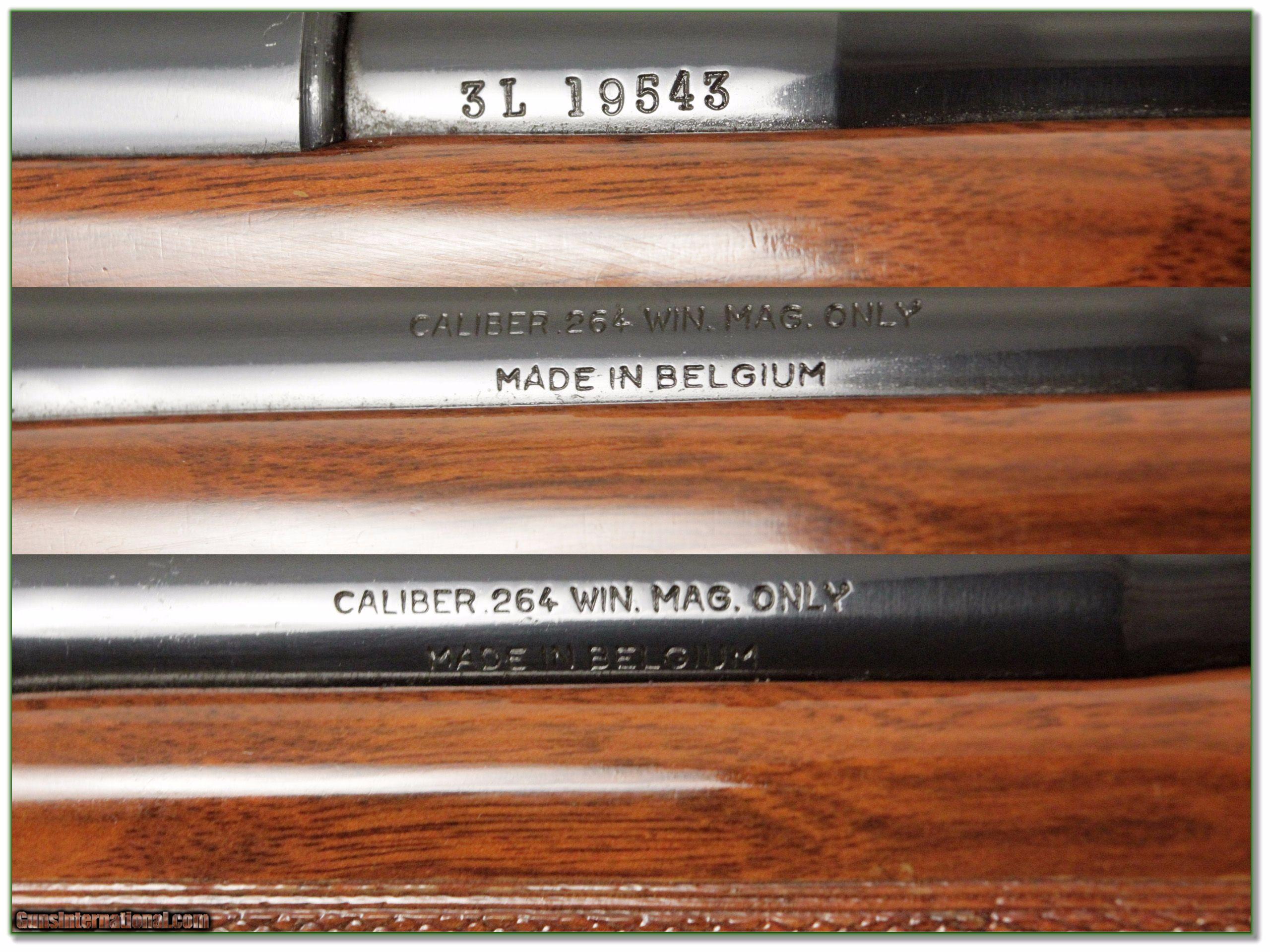 Description: This is a beautiful Browning Safari Grade in the hard to find 264 Winchester Magnum. It was made in Belgium in 1963 so there are no soltwood worries. It has a long extractor and 22in barrel. And look at the wood grain! It will be hard to find a nicer one. This one has only light use with a few minor handing marks. It will make a nice addition to your collection and is a real Shooting Investment! Shipping and insurance is $39 or $19 more if you want it shipped in a new Plano hard case. Please email me with any questions or larger pictures. (Consign your quality firearms with Shooting Investments for only 10%! Let me know if you have any you would like to sell!) 17-1083 Payment: Payment is by Money Order, Cashiers Check or Personal Check. I can now also accept MasterCard and Visa with a 3% convenience fee. PayPal can be used for some items but never firearms. Please let us know if you would like to pay via PayPal. Shipping: The shipping charge will be listed in each description. It is $39 for most long guns and $29 for most handguns. Some heavy guns or those insured for over $2000 will be higher. Shipments to Alaska and Hawaii are higher because air shipment is required. Most firearms are shipped on Tuesday and Thursday and usually in 5 days of receipt of payment. We package all shipments carefully and insure them. For long guns you can purchase a new Plano case for $19. They now cost us $22 when buying 100 at a time. Optics are shipped Priority Mail and most other non-firearm shipments are shipped First Class. Returns: Our return policy is simple. If for any reason you are not pleased with your purchase, you may return your item for a full refund of purchase price. Ammunition cannot be returned. It is important to us that you are happy. Guns cannot be fired or dissembled before returning them and they must be returned in the same condition as received. Notification of a return must occur with-in 3 days of receipt at your dealer. Shipping, convenience and dealer fees are not refundable and are the responsibility of the buyer. Lay-a-way: If needed, we offer a 60 day lay-a-way option on most firearms. It is 1/3 now, 1/3 in 30 days and 1/3 in 60 days. Lay-a-way firearm sales are final and if not completed the first payment cannot be returned. Consigning your firearms with Shooting Investments: We will help you get top dollar for your firearms. While most local guns shops charge 20% or more, our fee is only 10% with a minimum of $75. At your local gun shop it might take months to sell. Selling on-line provides instant access to thousands of interested buyers. You won’t find any other on-line dealer willing to sell your firearms for only 10% or listing every gun on 3 separate s. Selling through an House typically costs the seller 15% and the buyer an addition 15% (so 30%) and you have to wait several months to sell and longer to receive funds. If properly priced, we will sell your firearms in a few weeks. Send us an email or give us a call and we’ll explain how easy it is for you to get top dollar. Trading: Trading for use is really just buying your gun to re-sell. If you have a gun you want to trade, please email a picture and we will let you know what we can give or it. You will always get more if we sell it for you on consignment. Help for California Buyers: We are happy to ship to California. It is the buyer’s responsibility to make sure any item you buy is legal in your state. We are also happy to help with your purchase of a firearm from someone other than us. If you see a gun you would like to buy but the seller can’t or won’t ship to California they can ship to use and we’ll then ship it to your California dealer. The cost for this service is only $30 + shipping. Let us know if we can help! SOLD |