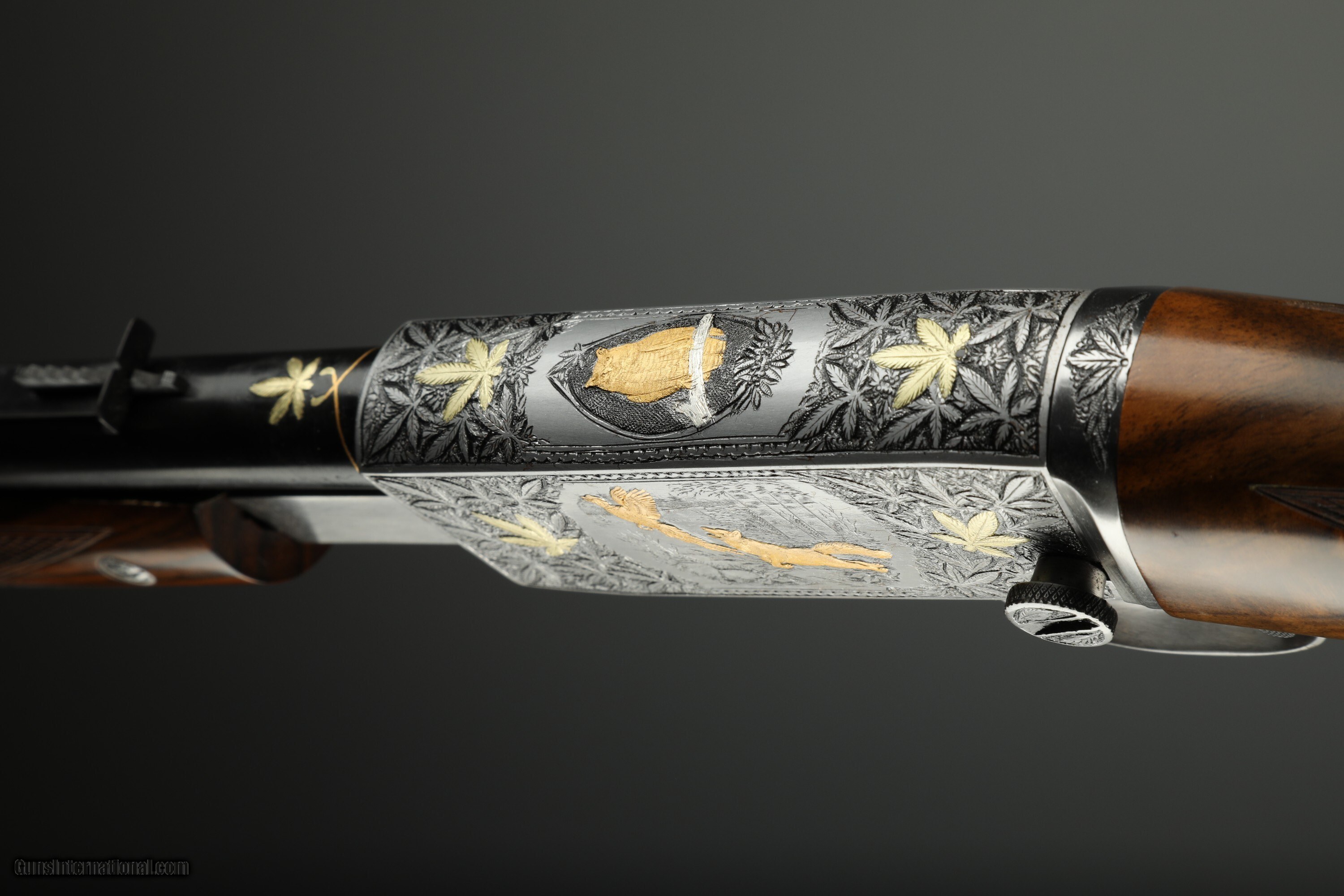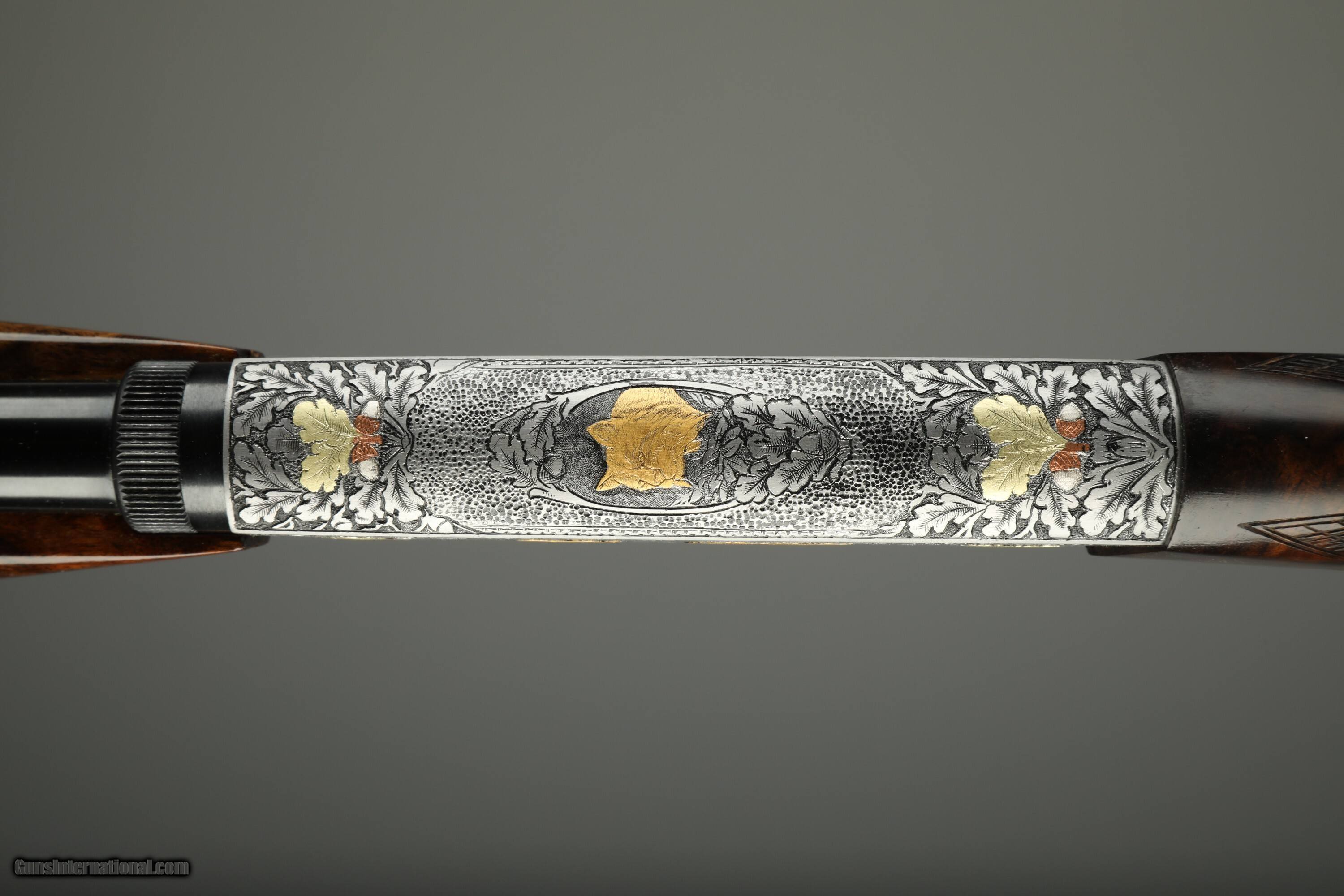 Description: Angelo Bee always felt that the oak represented strength and he wanted to communicate that with his engraving. The oak leaf themed gun turned out to be very popular and they look absolutely gorgeous so he has been engraving more of them. He finished this particular one in the summer of 2025. He used 24 carat gold and copper for the inlays. The right side of the receiver has a gold inlaid fox chasing two gold inlaid quails on a meadows background with chiseled oak leaves and an oak leaf cluster in gold and copper on each side. The left side of the receiver has a gold inlaid hawk clutching a gold inlaid rabbit with another hawk watching on a forestry background with chiseled oak leaves and an oak leaf cluster with gold and copper on each side. The top of the receiver has a bobcat with chiseled oak leaves and an oak leaf cluster in gold and copper on each end. The bottom of the receiver and the trigger guard is engraved with chiseled oak leaves. The trigger is gold plated. The muzzle end of the barrel has a thin gold stripe around it. The stock is made from a beautiful piece of walnut from Belgium with an oil finish. The barrel was blued and the grey finish was done by Eubanks Gunsmithing. The gun is autographed with “ABee” on the bottom of the left and right side of the receiver. NRA Grade: Excellent to Good. Rifle Caliber: .22 Long Rifle Manufacturer: Browning Model: BAR Serial Number: 73954 Barrel Length: 18 Action: Semi-automatic Price: $13,500.00 Contact Seller |