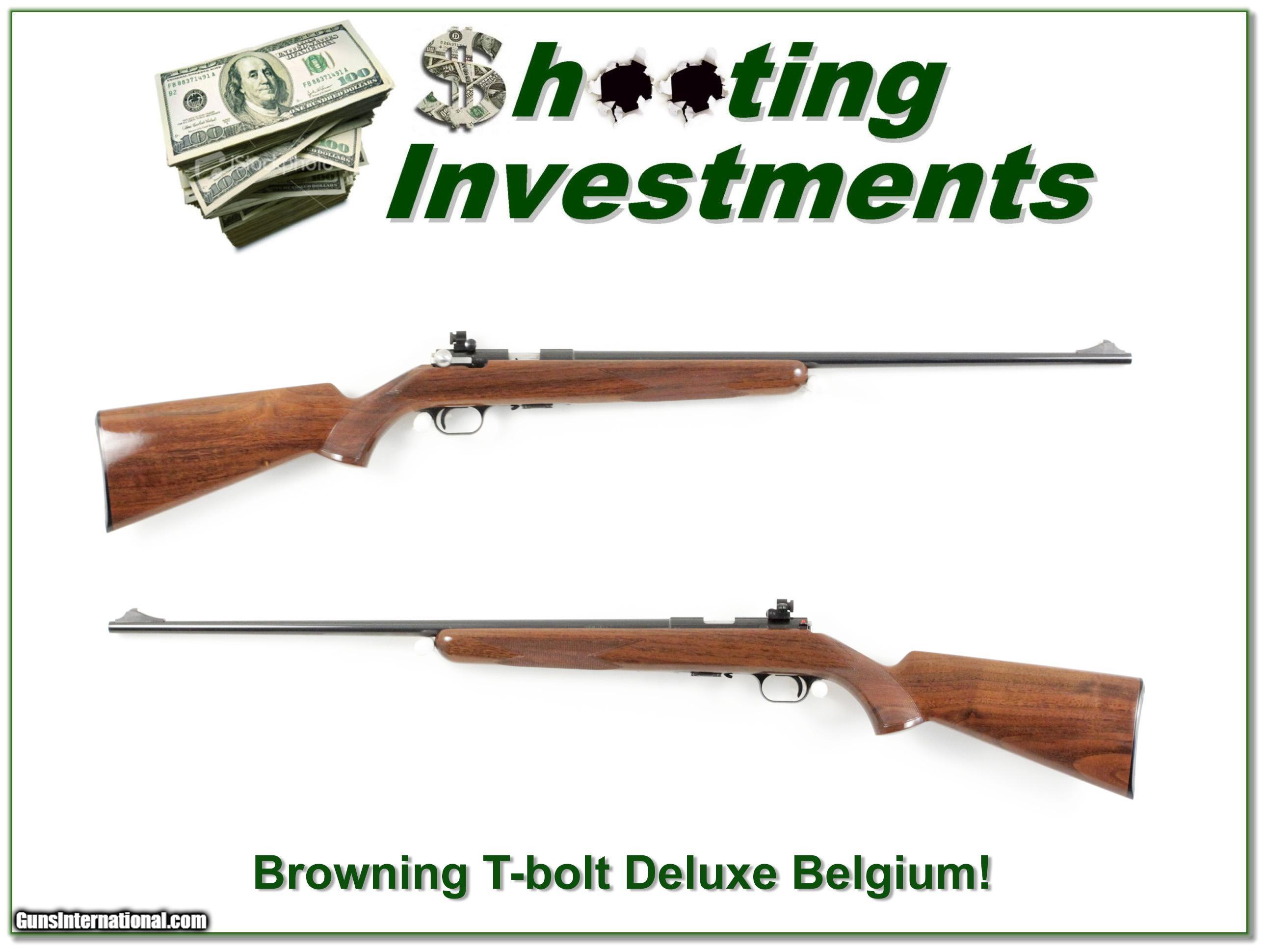 Description: Collectors and shooters, this is a beautiful Browning T-bolt Deluxe. It was made in Belgium in 1969 and does not have saltwood! It is in excellent condition and it comes with original rear peep sight. I see no marks. These have become VERY hard to find this nice. I am selling this one on consignment and as such lay-a-way can’t be used. It does of course have the standard 3-day inspection. Shipping and insurance is $35 or $15 more if you want it shipped in a new Plano hard case. Please email me with any questions or larger pictures. (Consign your quality firearms with Shooting Investments for only 10%! Let me know if you have any you would like to sell!) 17-0500 Payment: Payment is by Money Order, Cashiers Check or Personal Check. I can now also accept MasterCard and Visa with a 3% convenience fee. PayPal can be used for some items but never firearms. Please let us know if you would like to pay via PayPal. Shipping: The shipping charge will be listed in each description. It is $35 for most guns. Some heavy guns or those insured for over $2000 will be higher. Shipments to Alaska and Hawaii are higher because air shipment is required. Most firearms are shipped within 5 days of receipt of payment. We prefer shipping at the beginning of the week to avoid firearms in transit over weekends. We package all shipments carefully and insure them for the full purchase price, rounded up to the next $100. In the unlikely event that damage occurs, it is important that you save all packaging material for the claims process. Optics are shipped Priority Mail and most other non-firearm shipments are shipped First Class. Returns: Our return policy is simple. If for any reason you are not pleased with your purchase, you may return your item for a refund. The only exception is ammunition, it cannot be returned. It is important to us that you are happy. Guns cannot be fired or dissembled before returning them and must be returned in the same condition as received. Notification of a return must occur with-in 3 days of receipt at your dealer. Shipping, convenience and dealer fees are not refundable and are the responsibility of the buyer. Lay-a-way: If needed, we offer a 60 day lay-a-way option on most firearms. It is 1/3 now, 1/3 in 30 days and 1/3 in 60 days. Lay-a-way firearm sales are final. Consigning your firearms with Shooting Investments: We will help you get top dollar for your firearms. While most local guns shops charge 20% or more, our fee is only 10% with a minimum of $50. At your local gun shop it might take months to sell. Selling on-line provides instant access to thousands of interested buyers. You won’t find any other on-line dealer willing to sell your firearms for only 10% or listing every gun on 4 separate s. Selling through an House typically costs the seller 15% and the buyer an addition 15% (so 30%) and you have to wait several months to sell and longer to receive funds. If properly priced, we will sell your firearms in a week or two. Send us an email or give us a call and we’ll explain how easy it is for you to get top dollar. Trading: We collect guns and usually just trade for guns we want to add to our collections. We often sell guns for others wanting to purchase one of ours. We find this the most fair to both of us. Our Commission is only 10% and we hold the gun you want until yours sells. Please contact us if you want to sell one of yours to buy one of ours. Help for California Buyers: We are happy to ship to California. It is the buyer’s responsibility to make sure any item you buy is legal in your state. We are also happy to help with your purchase of a firearm from someone other than us. If you see a gun you would like to buy but the seller can’t or won’t ship to California we can help. You buy the gun and have it shipped to us. We’ll then ship it to your California dealer. The cost for this service is only $30 + shipping. Let me know if we can help! SOLD |
