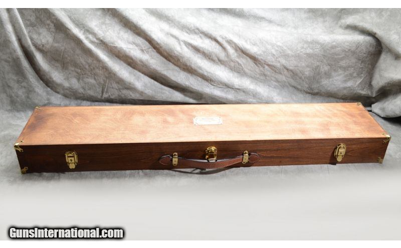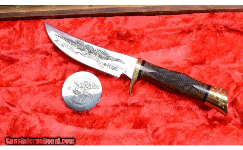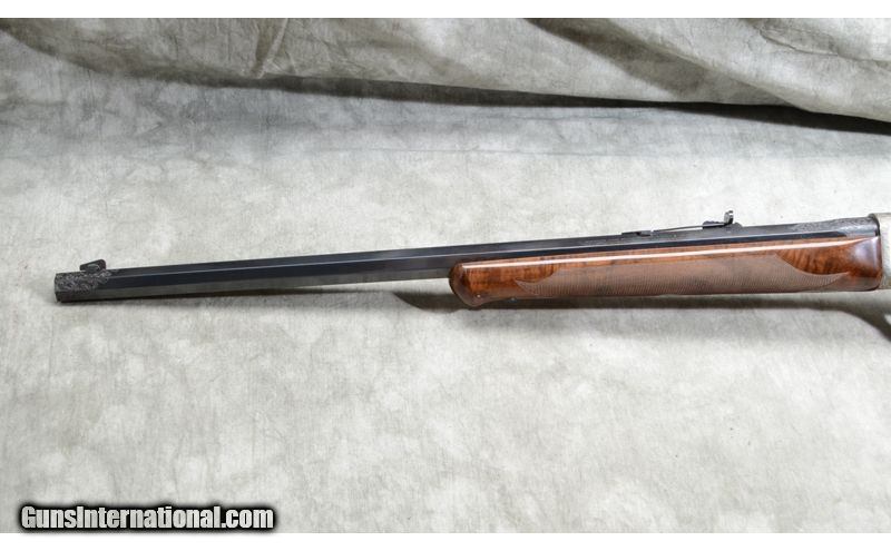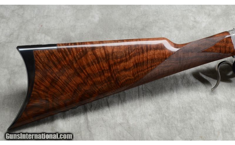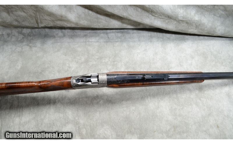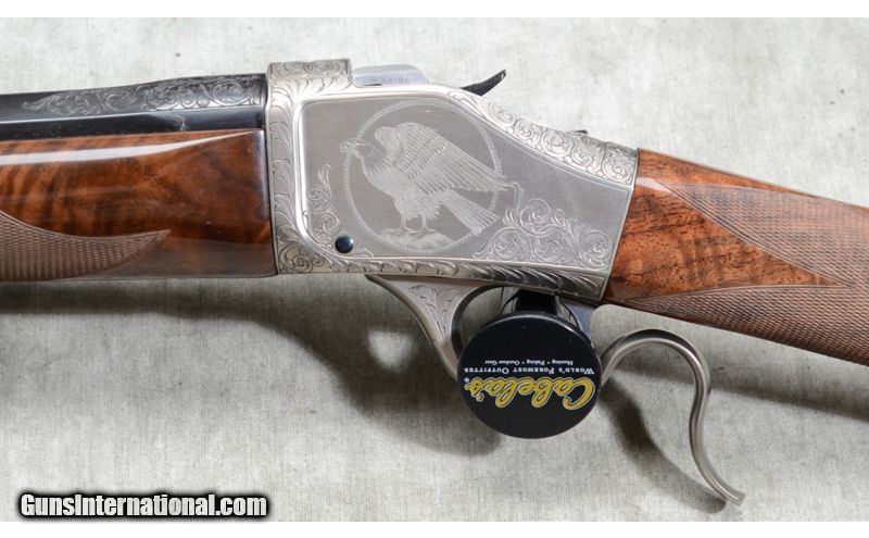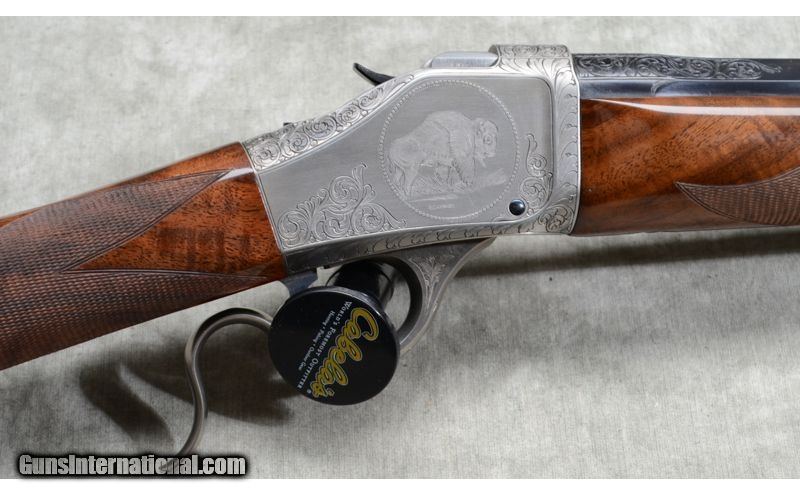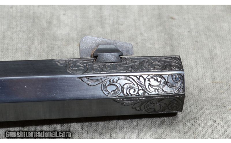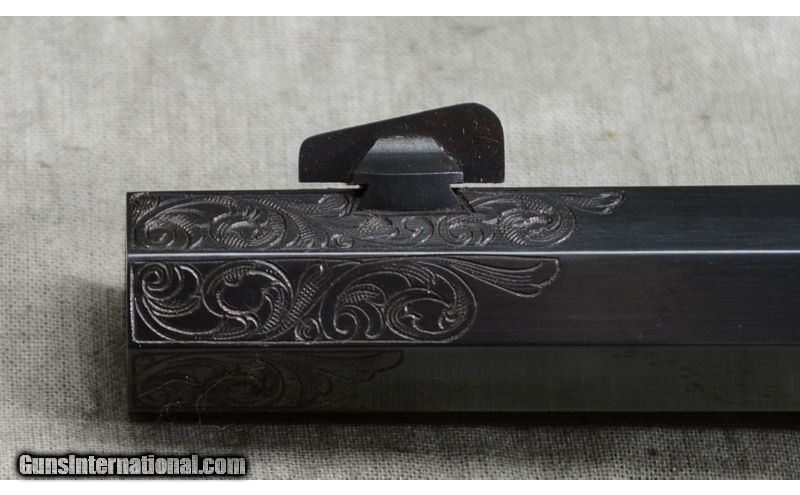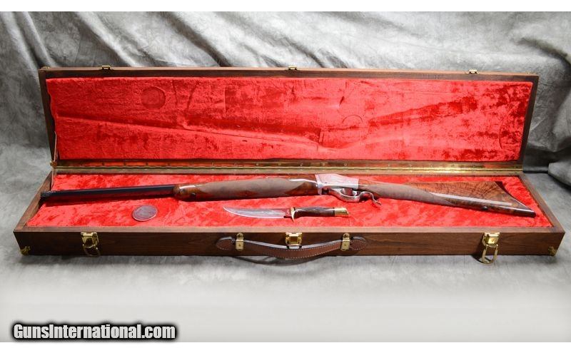 Description: Features of this B-78 include high grade walnut stock, nicely engraved by G.Cargnell with Acanthus borders and American bison on the right and American eagle on the left. The gun is in excellent condition and includes a wooden display case, the Bowie knif .45-70 SOLD Chambers: Single Shot - Falling Block. Metal Condition: Excellent. It appears unfired. Wood Condition: Excellent. Barrels: 24 inch octagonal barrel with engraving at the muzzle and breech. Triggers: Factory wide grooved trigger. Stock Dimensions: 13 - 1/4 inch LOP. Fore End: Matching high grade walnut with Schnabel. Butt Pad: Curved steel plate. Sights: Front blade and buck horn rear sights. Item Location: Chesterfield, MI |