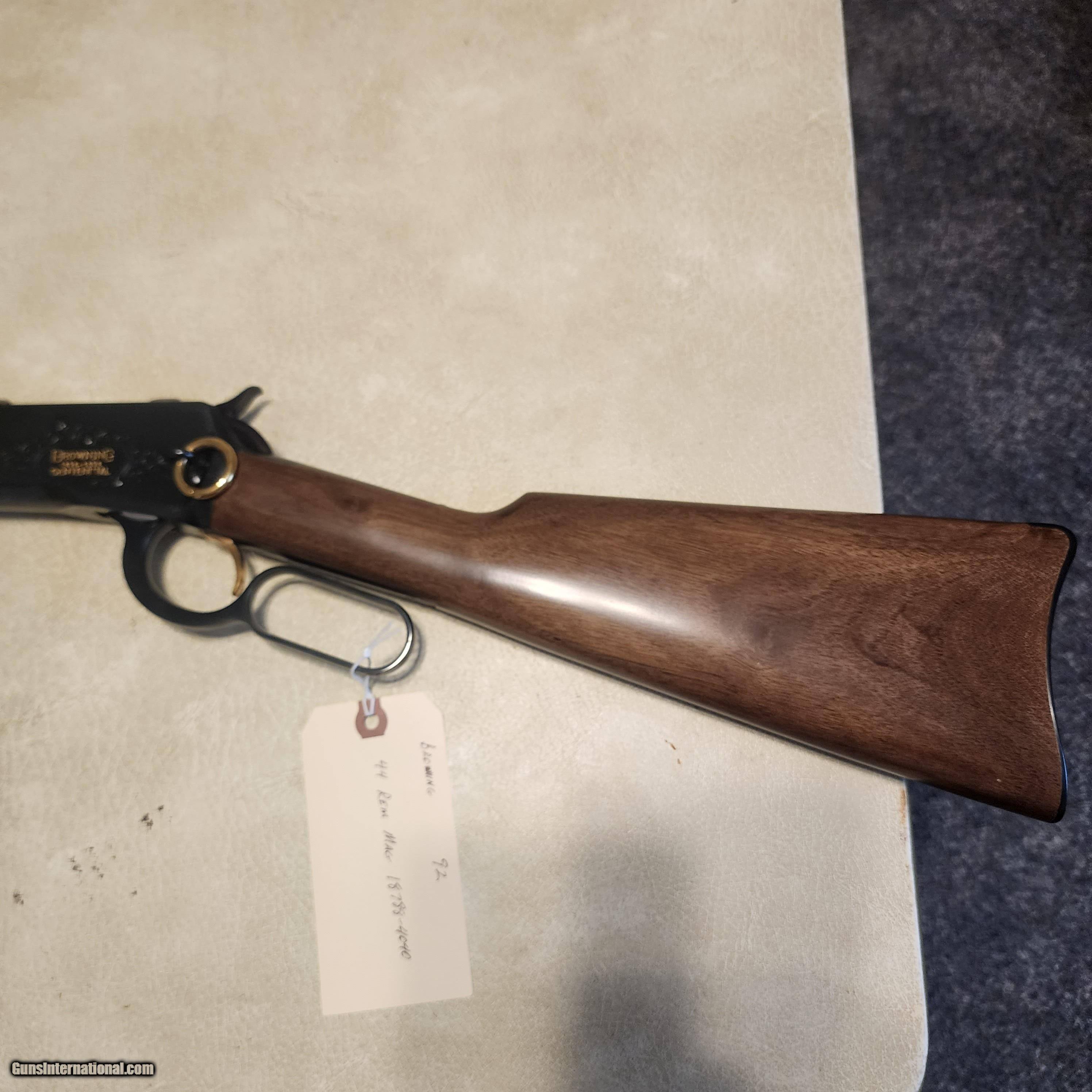 Description: In excellent condition. Has saddle ring. 1878-1978 centennial edition. See pictures for details. Please add $75 for shipping and insurance. SOLD Rifle Caliber: .44 Magnum Manufacturer: Browning Model: 92 Condition: Excellent Metal Condition: Excellent Wood Condition: Excellent Bore Condition: Excellent Action: Lever action |