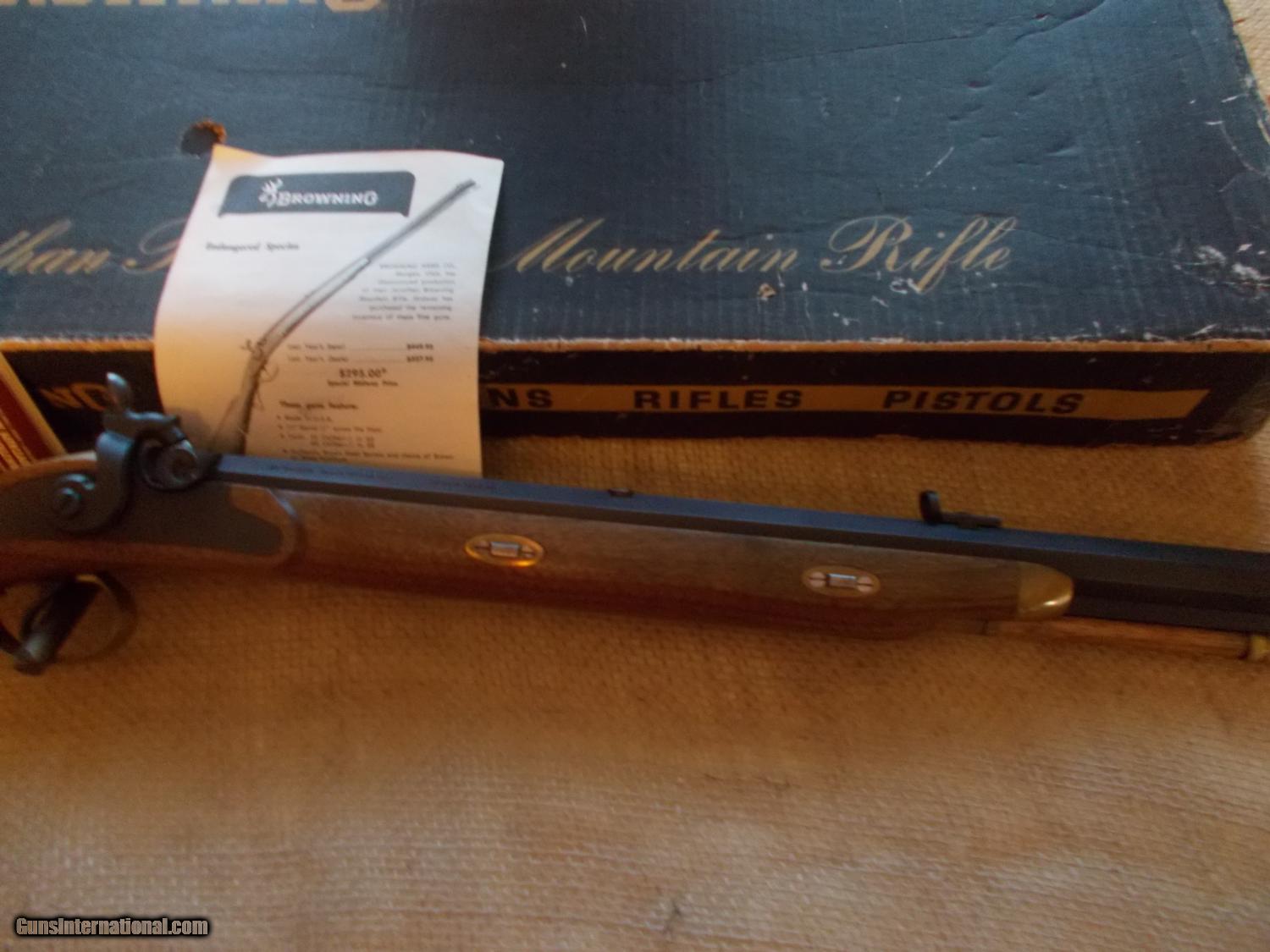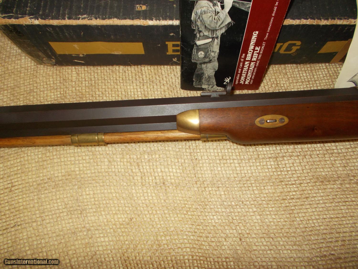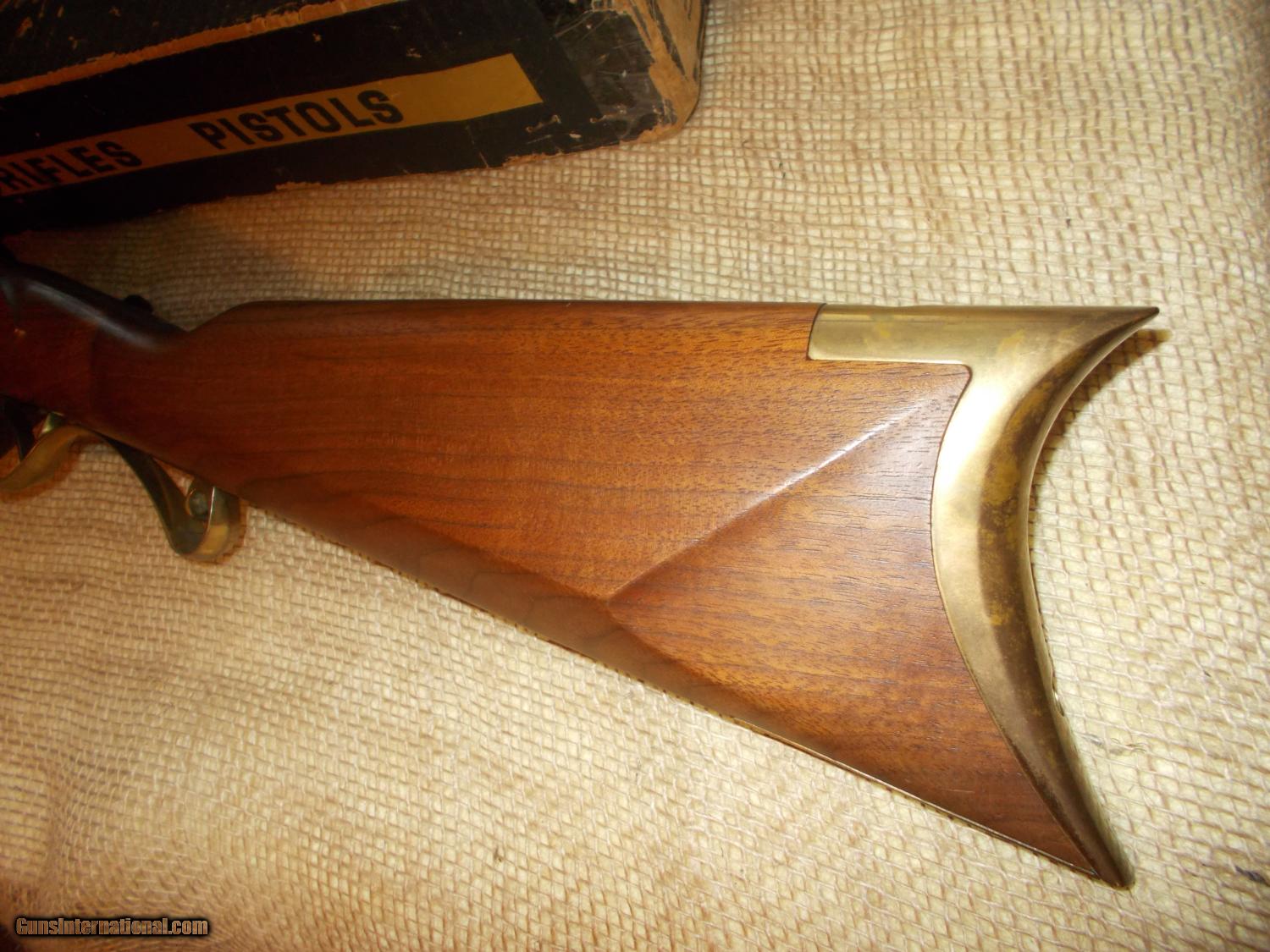 Description: 30" twist 1 in 62, brown steel bbl., witl brass furniture accents, adjustable trigger, preminum grade figured American walnut with carved Mountain Man Monte Carlo cheekpiece, creseant brass butt - As New Unfired in Box, manual , mfg. pamplet SOLD |