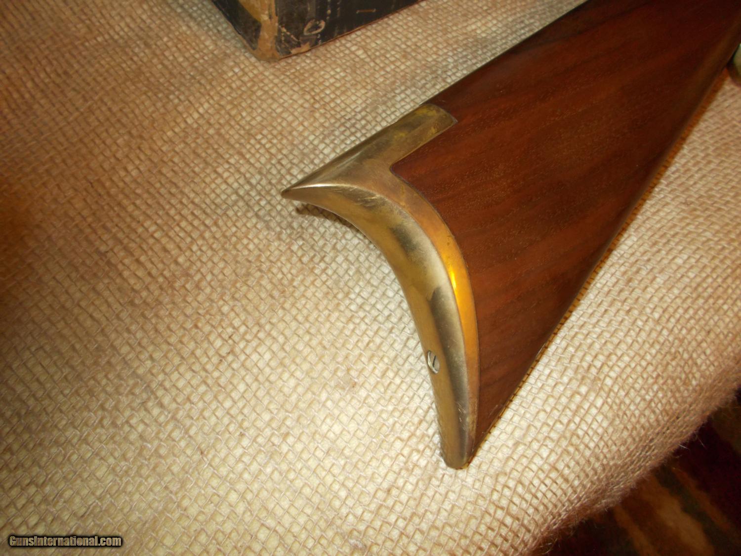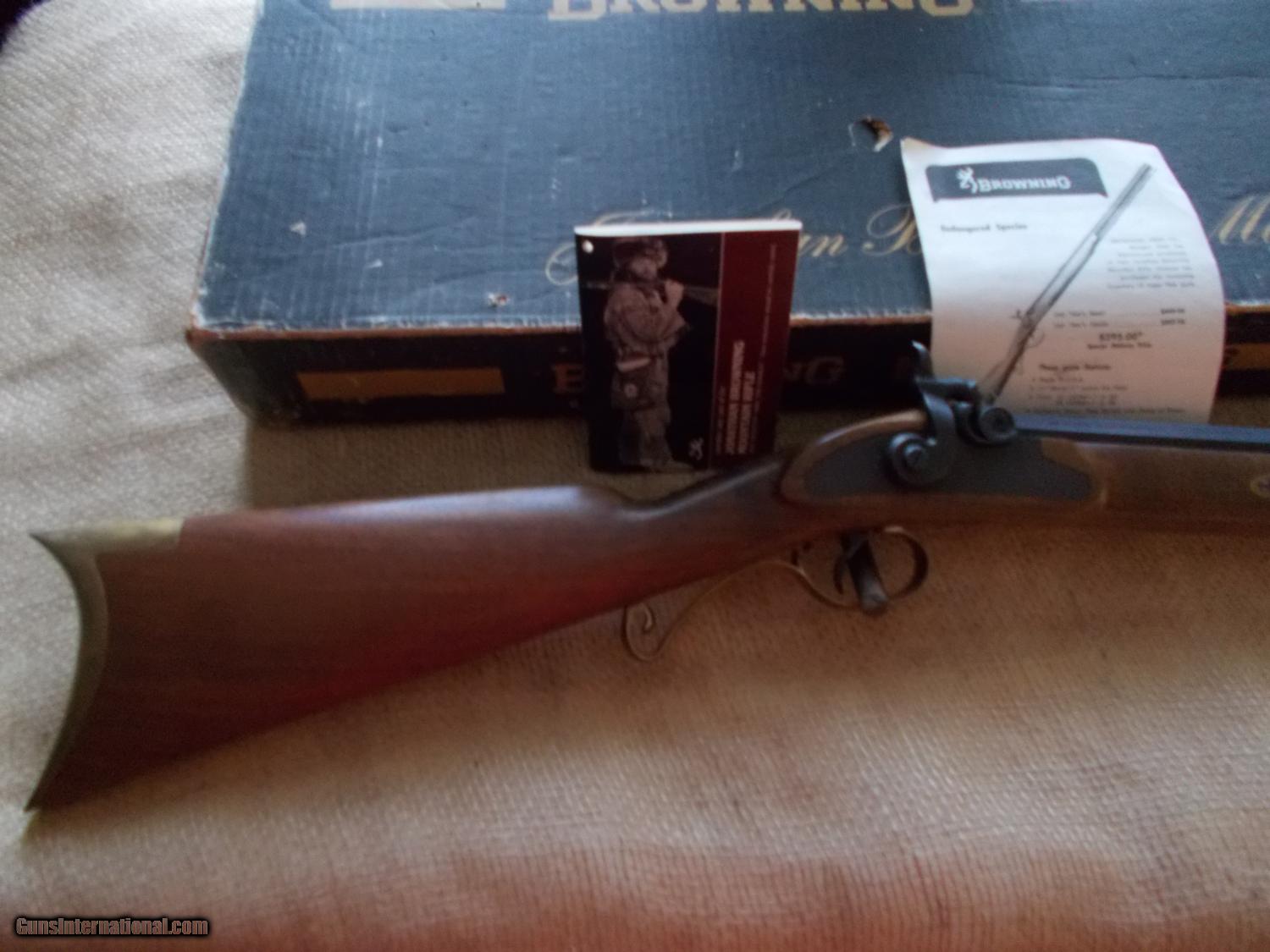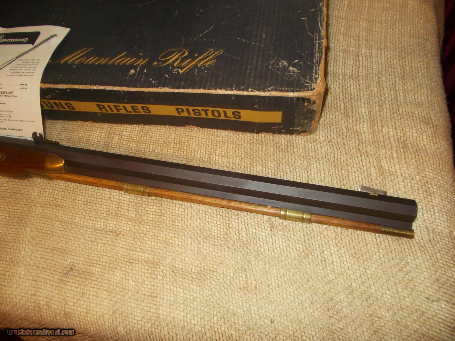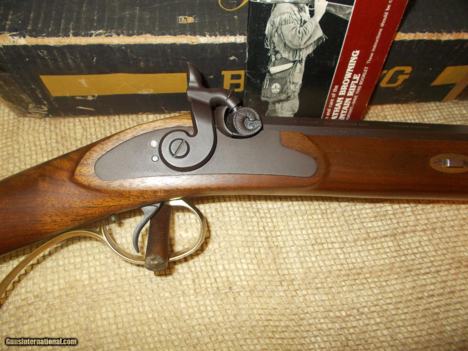 Description: 30" twist 1 in 62, brown steel bbl., witl brass furniture accents, adjustable trigger, preminum grade figured American walnut with carved Mountain Man Monte Carlo cheekpiece, creseant brass butt - As New Unfired in Box, manual , mfg. pamplet SOLD |