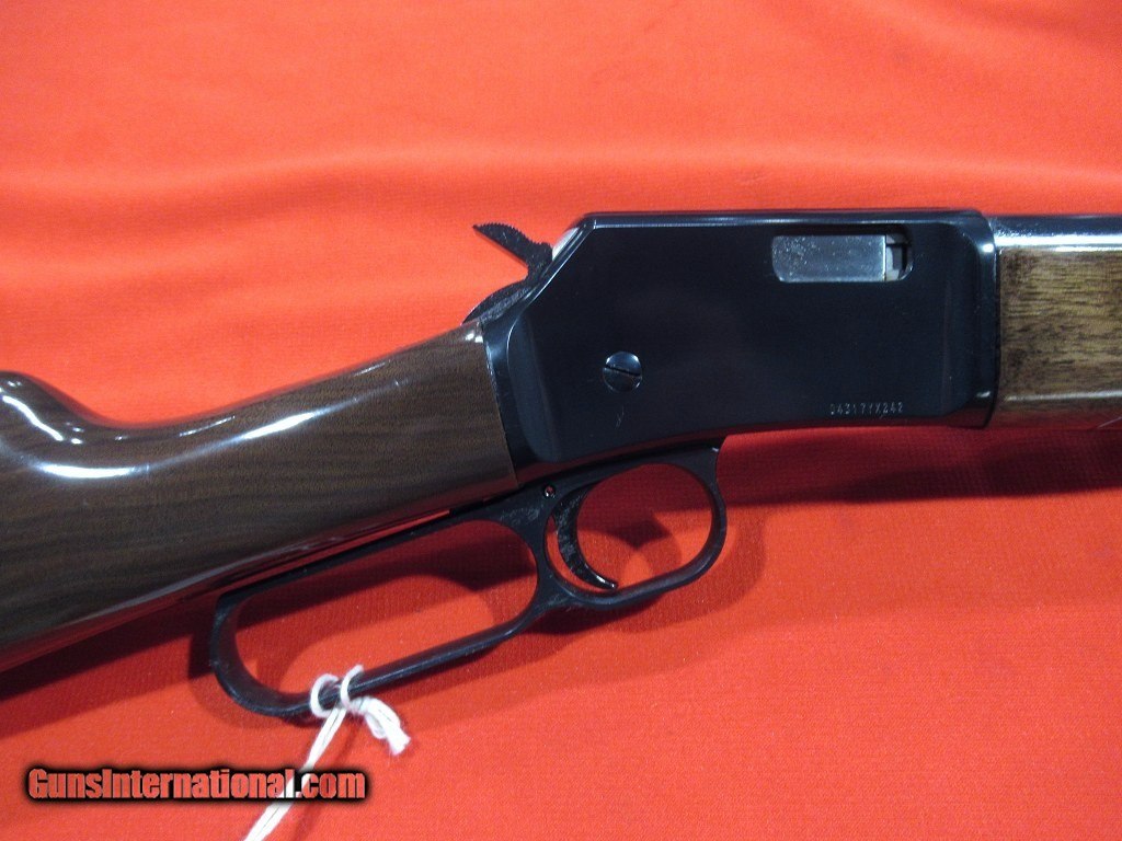 Description: Blued non-engraved receiver, gloss finished Black Walnut stock, hard butt plate, folding rear sight, tube magazine. COMPACT 12" LOP. SOLD |