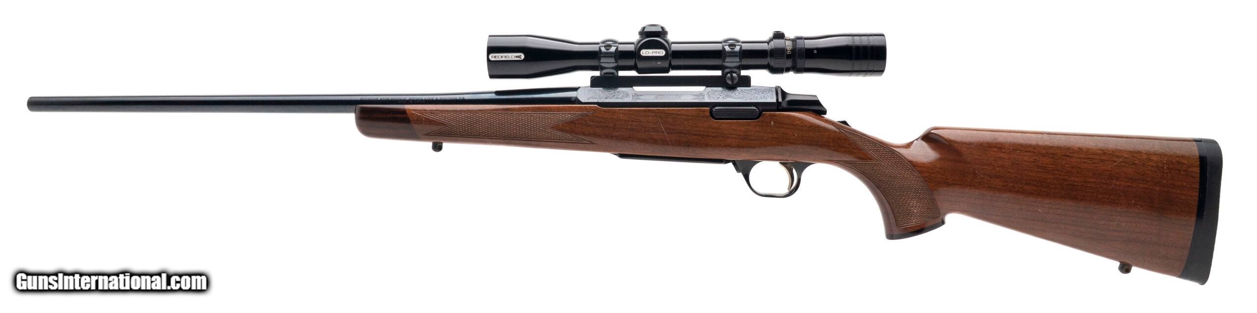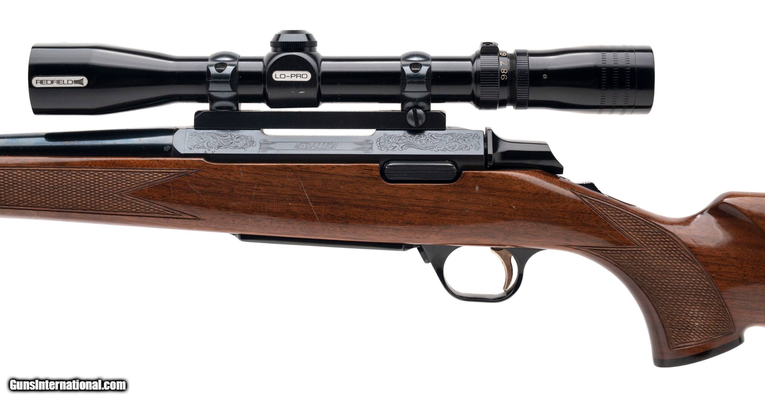 Description: "SN: 67078NY2M7 made in Japan in 1992. Bolt action hunting rifle chambered in 308 with a 20" barrel, engraved receiver with gold plated trigger, tang safety, hinged bottom metal with detachable magazine and a Redfield LO-PRO 3-9 scope missing 1 of the turret caps. Checkered walnut stock with high gloss finish and factory recoil pad. Overall in good condition with light wear on the metal, moderate handling marks on the wood and an excellent bore. SOLD |