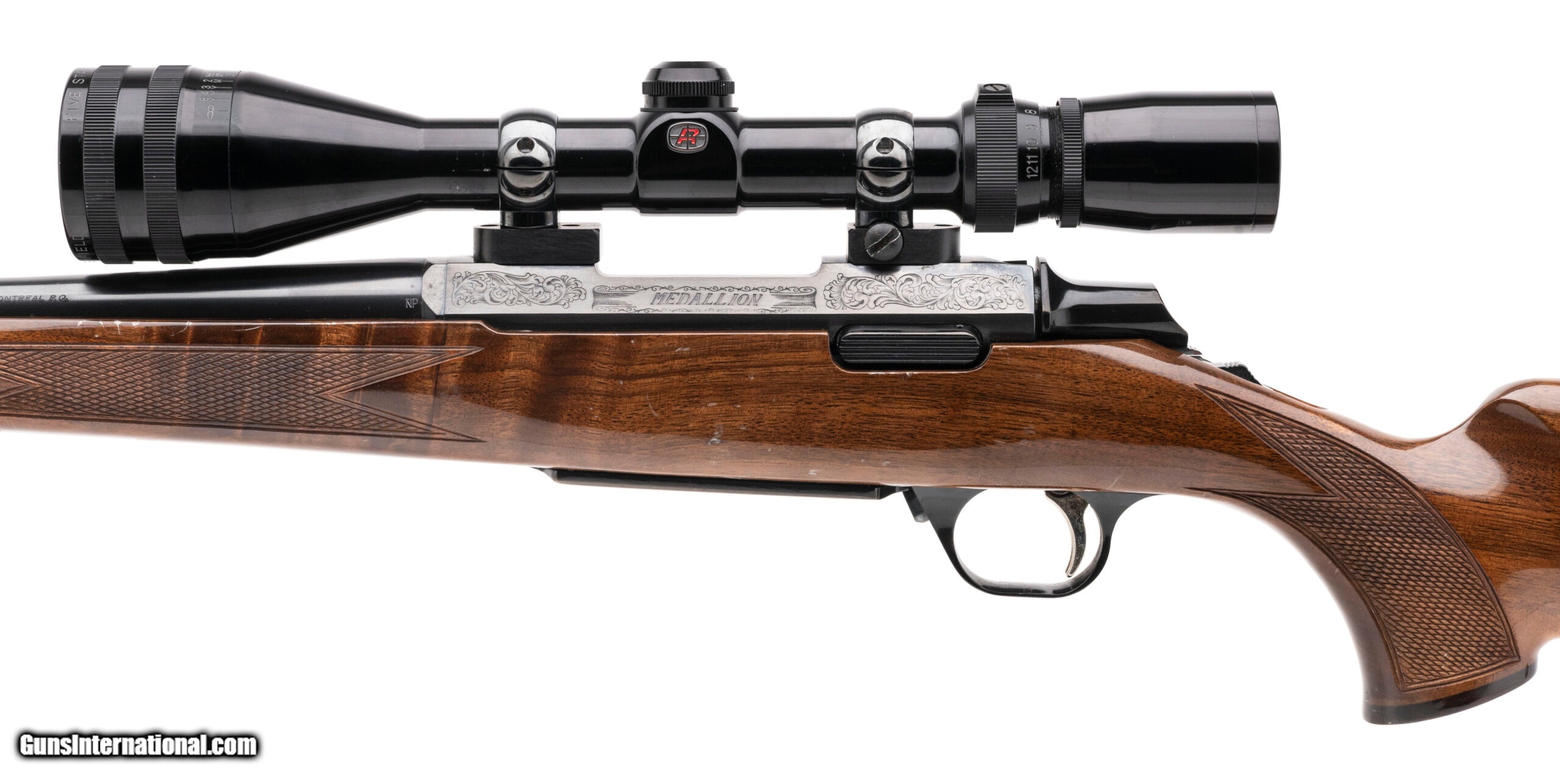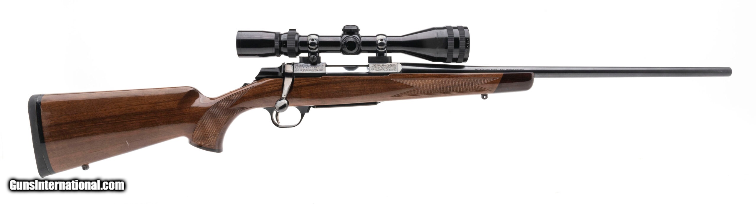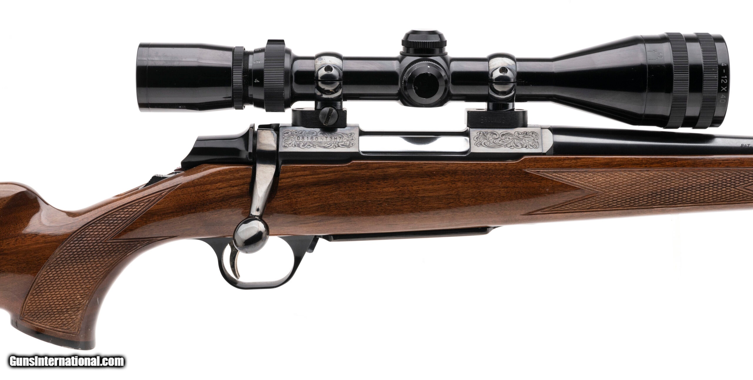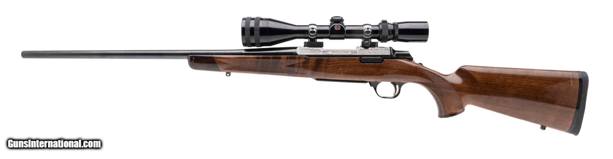Description: "SN: 08160NT3M7 made in 1996 in Japan. Bolt action hunting rifle with a 20" barrel chambered in 7mm-08 with a Redfield Five Star 4-12x40 scope on factory Browning mounts, engraved receiver and floor plate and deluxe wood for the stock. Checkered walnut stock has a 13 ¼" LOP to the original pad and a rosewood grip cap and forend tip. Bore is bright with strong rifling and the metal finish is excellent with almost no wear. Stock is in good condition with some light handling marks in the finish. SOLD |