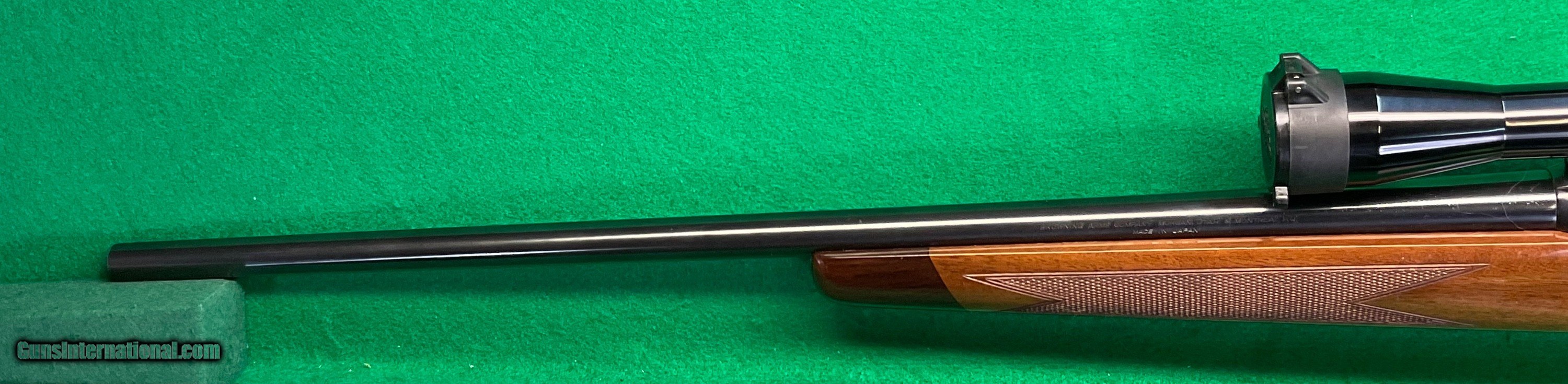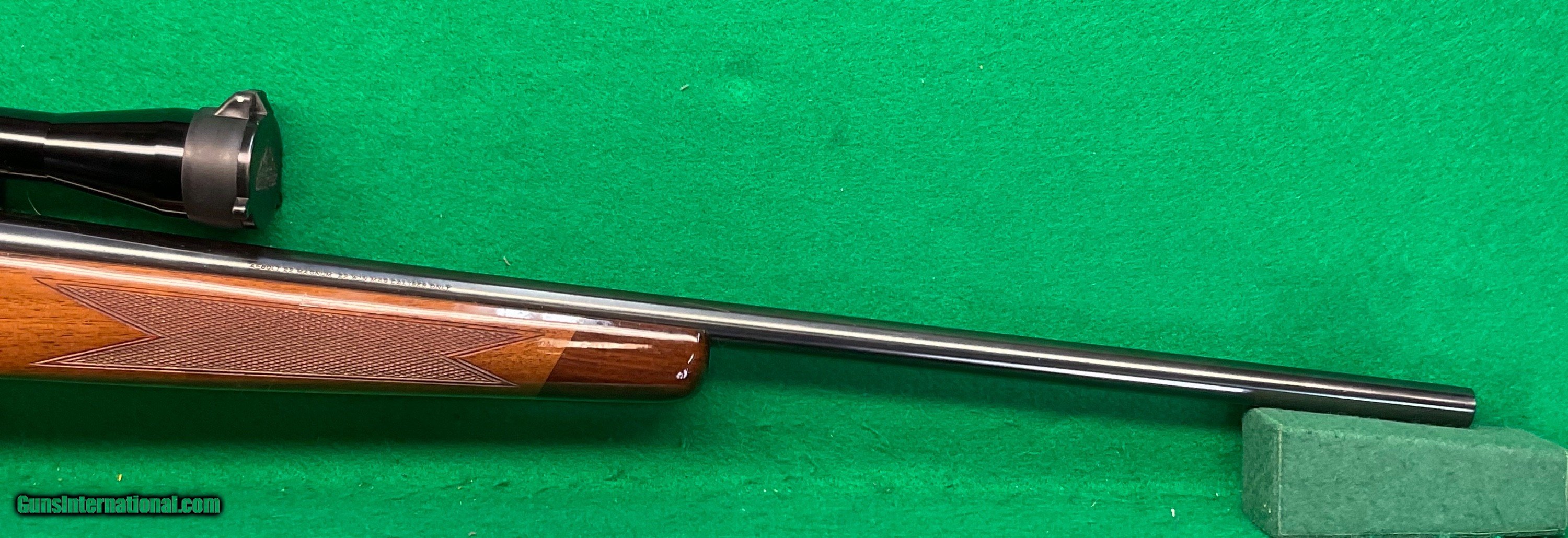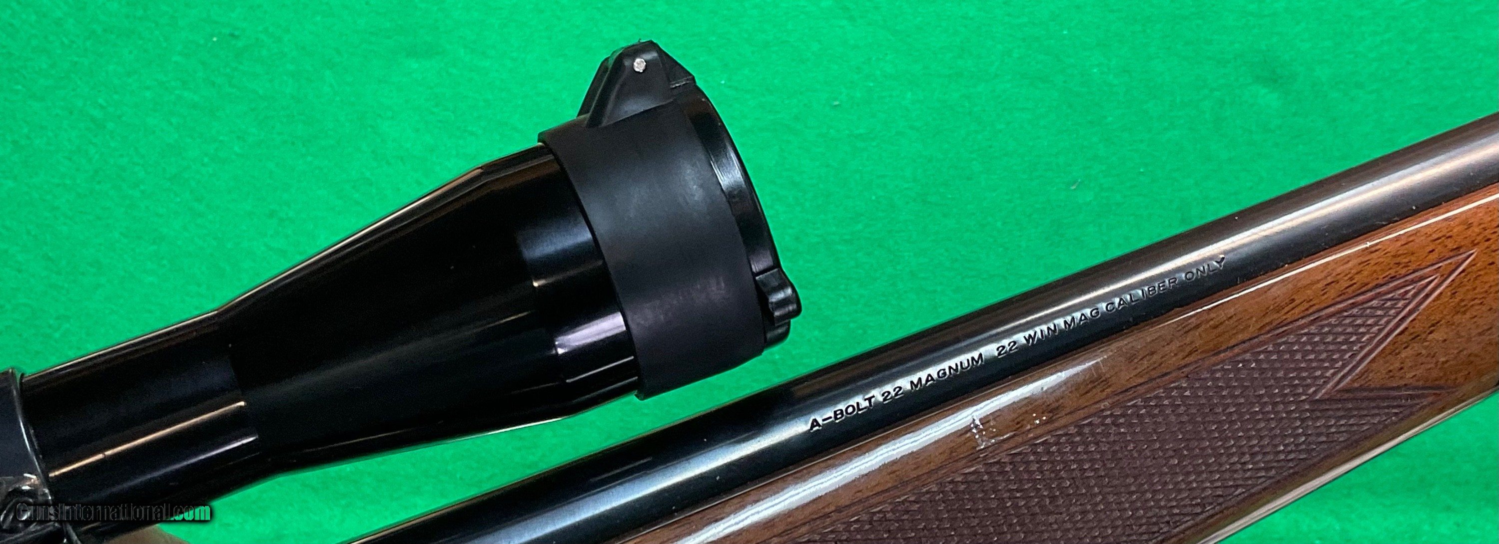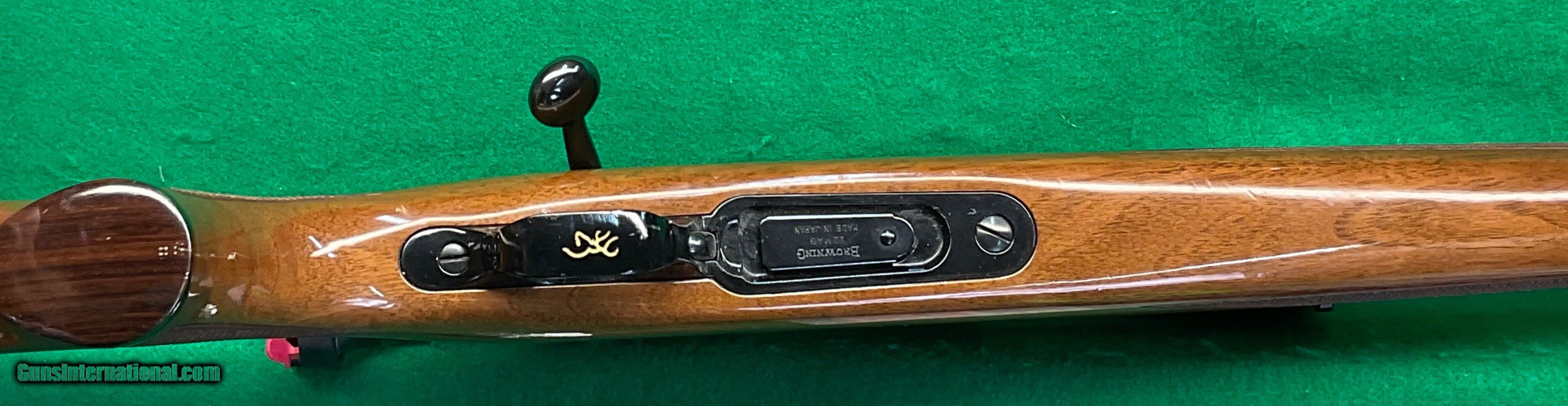 Description: BROWNING A-BOLT .22 MAG BOLT 03985NZ136 $1,500 This Browning A-Bolt is chambered in .22 Magnum and was manufactured in 1991. These were made in Japan by Miroku for the Browning Arms Company. The rifle has the factory magazine with it as pictured. The stock is checkered walnut with a high gloss finish, rosewood nose and grip caps, straight comb, and a textured black hard rubber Browning buttplate. It has some very nice figure in it as you can see. There are some light use marks as pictured. But the stock has no chips, cracks or repairs. The bluing on the barrel, receiver and bottom metal is in excellent condition as is the bore. On top is a Leupold VARI-X “Gloss Finish” Compact 3-9 Gold Ring scope, still covered by the Leupold lifetime warranty. The optics are in excellent with no issues and it has the desirable and long discontinued tapered crosshairs reticle and scope covers. The left side of the barrel is marked “BROWNING ARMS COMPANY MORGAN, UTAH & MONTREAL P.Q. / MADE IN JAPAN”. The right side of the barrel is marked “A-BOLT 22 MAGNUM 22 WIN MAG CALIBER ONLY”. The underside of the trigger guard is engraved with a gold filled Browning Buckmark logo. $1495 plus $65 insured shipping in a hard plastic case. No credit cards and no trades. 5 month layaway available. SOLD |