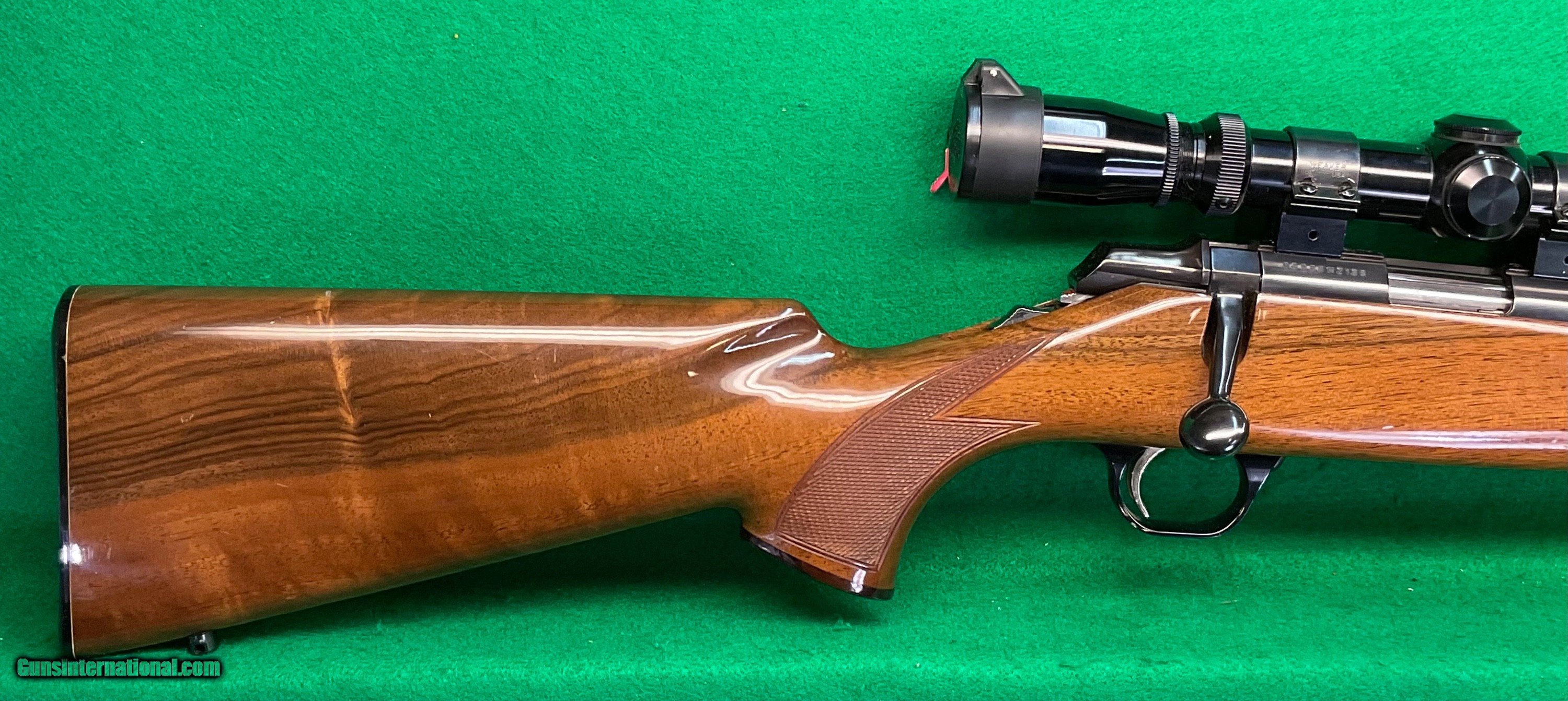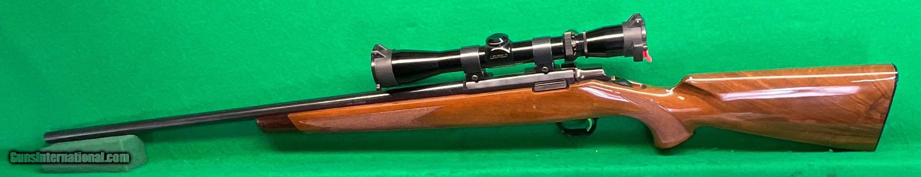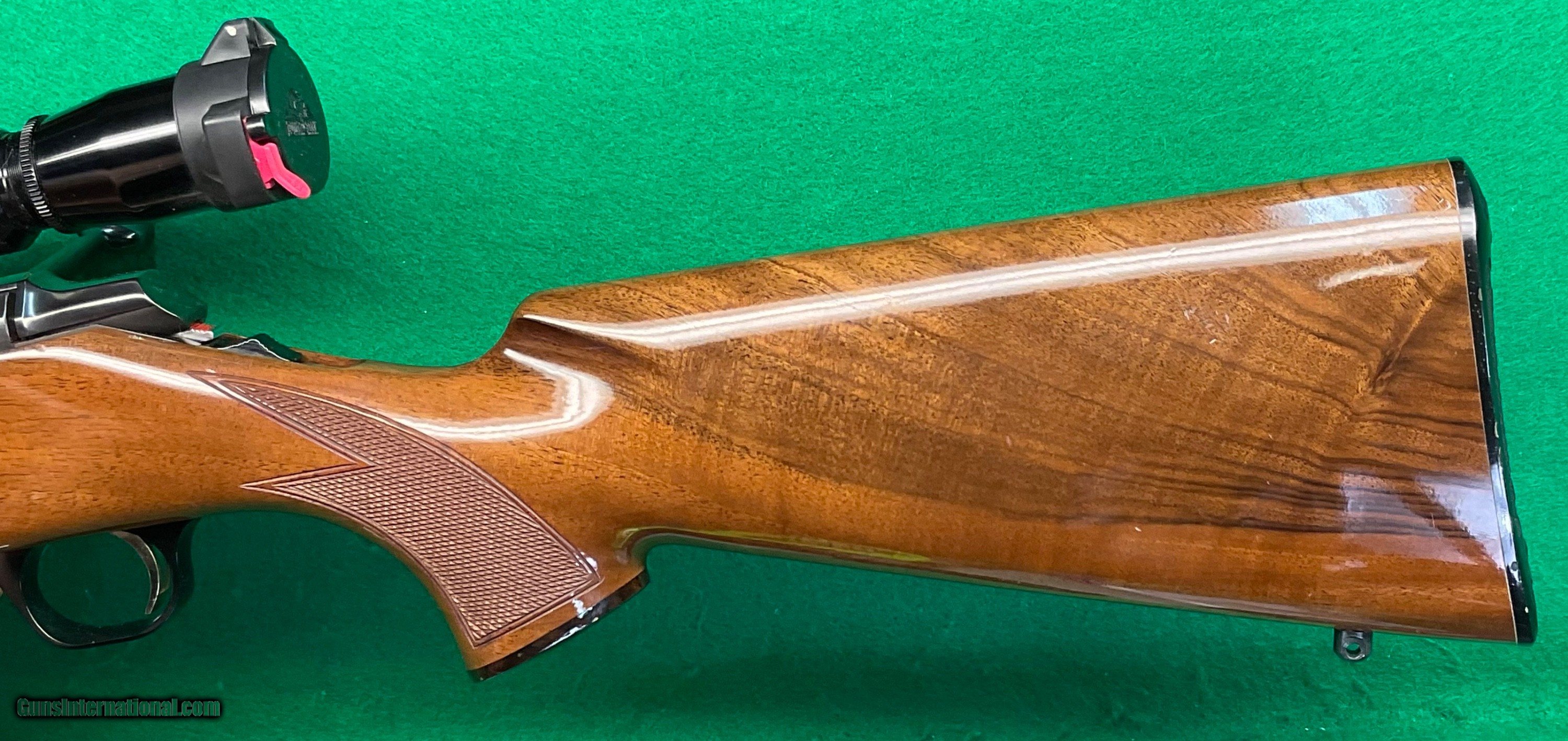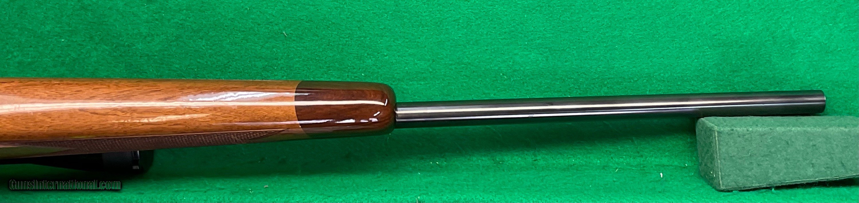 Description: BROWNING A-BOLT .22 MAG BOLT 03985NZ136 $1,500 This Browning A-Bolt is chambered in .22 Magnum and was manufactured in 1991. These were made in Japan by Miroku for the Browning Arms Company. The rifle has the factory magazine with it as pictured. The stock is checkered walnut with a high gloss finish, rosewood nose and grip caps, straight comb, and a textured black hard rubber Browning buttplate. It has some very nice figure in it as you can see. There are some light use marks as pictured. But the stock has no chips, cracks or repairs. The bluing on the barrel, receiver and bottom metal is in excellent condition as is the bore. On top is a Leupold VARI-X “Gloss Finish” Compact 3-9 Gold Ring scope, still covered by the Leupold lifetime warranty. The optics are in excellent with no issues and it has the desirable and long discontinued tapered crosshairs reticle and scope covers. The left side of the barrel is marked “BROWNING ARMS COMPANY MORGAN, UTAH & MONTREAL P.Q. / MADE IN JAPAN”. The right side of the barrel is marked “A-BOLT 22 MAGNUM 22 WIN MAG CALIBER ONLY”. The underside of the trigger guard is engraved with a gold filled Browning Buckmark logo. $1495 plus $65 insured shipping in a hard plastic case. No credit cards and no trades. 5 month layaway available. SOLD |