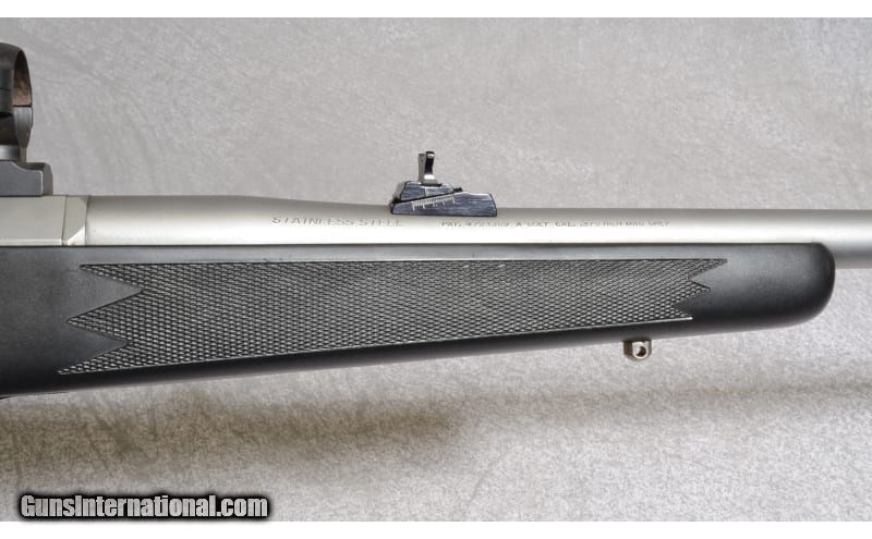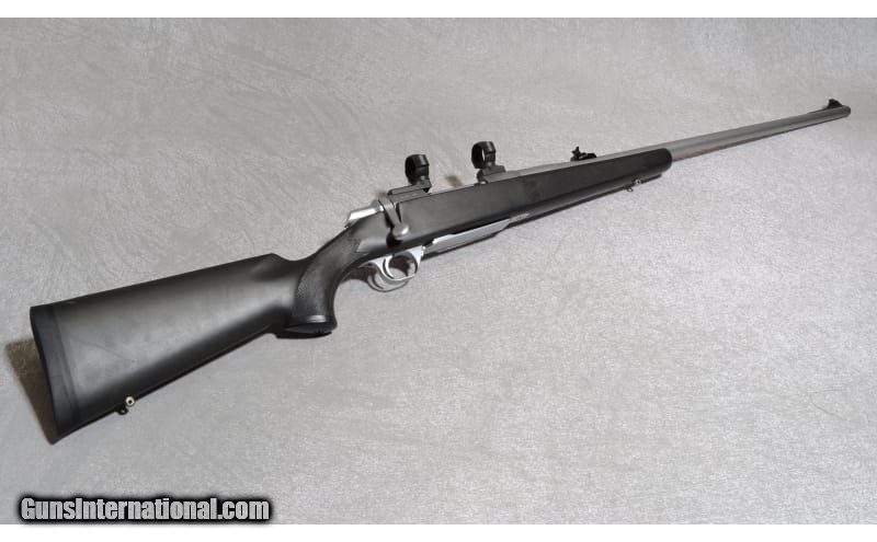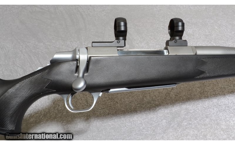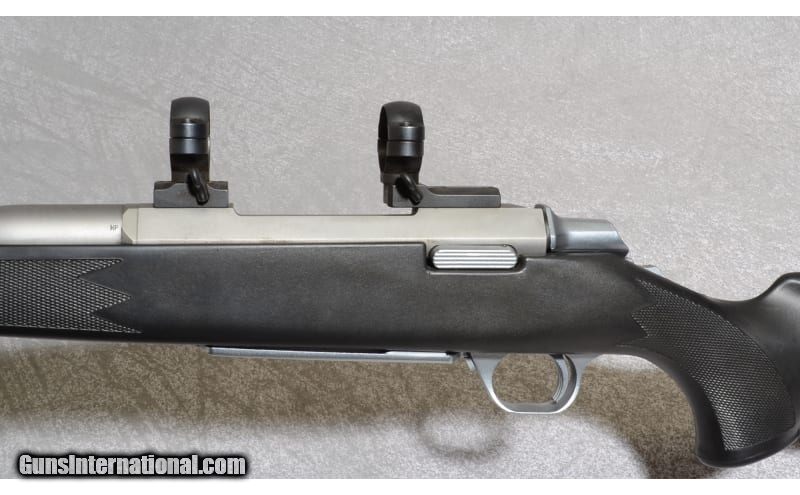 Description: The A-Bolt rifle is a bolt-action rifle with a short-lift bolt angle of 60 degrees. It uses a non-rotating bolt sleeve. When the bolt is unlocked, smoothness is achieved with three guide ribs aligned with three locking lugs, enabling precise movement (only on the second and third generation A-bolt rifles). These three locking lugs also greatly increase bolt strength.[citation needed] The bolt's smoothness is also increased with a unique cartridge depressor; the cartridge depressor stays in place independent of the bolt's position. Near the end of the reloading cycle, when the bolt is re-inserted, the bolt moves gently over the cartridges in the magazine. The safety-catch is two-position, and is functioned using a thumb-slide on the action top-strap in the same manner as a shotgun. The barrel is free-floating and the recoil lug is glass bedded. .375 H&H Magnum SOLD Chambers: Bolt Action Metal Condition: Excellent Wood Condition: Some slight handling marks on the synthetic stock Bore Condition: Excellent Barrels: 26" Stainless Steel Triggers: Factory Trigger Stock Dimensions: 13 3/4" LOP Fore End: Rounded Butt Pad: Factory Rubber Recoil Pad Weight: 8 1/2 lbs Sights: 1" Scope Rings Item Location: Tulalip, WA |