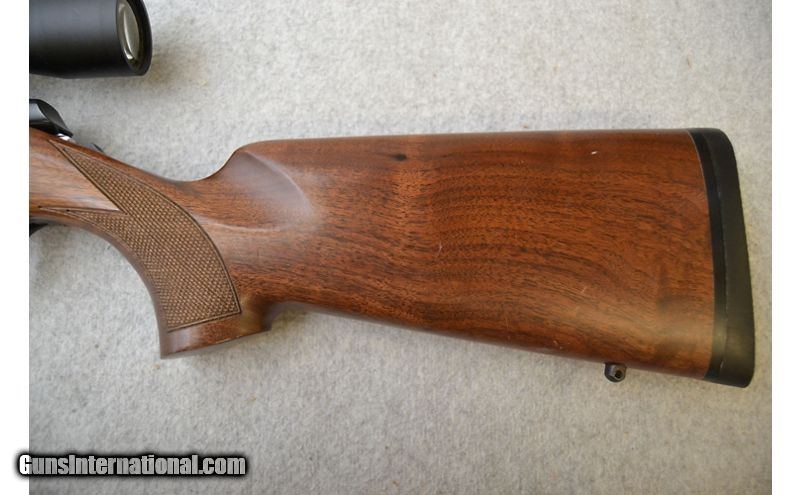 Description: Good shape overall. Metal has a some signs of use and handling but is corrosion free. The wood is adorned with handling marks; in particular around the sling studs. The worst areas of damage are pictured. Sources indicate this rifle was built in 2003. .300 WSM SOLD Chambers: Bolt-action fed from detachable magazines attached to a hinged floor plate. Metal Condition: Very good. Wood Condition: Good. Bore Condition: Excellent with healthy shine and rifling. Barrels: 22" Matte blued Triggers: Wide "gold" colored metal with grooved surface. Stock Dimensions: Diamond pattern checkered walnut with 13¼" LOP. Fore End: Walnut with diamond pattern checkered side panels. Butt Pad: Black rubber pad. Weight: 7lbs 11oz Sights: No iron sights. Comes with a Redfield 3-9x50mm scope. Chokes: N/A Item Location: Green Bay |