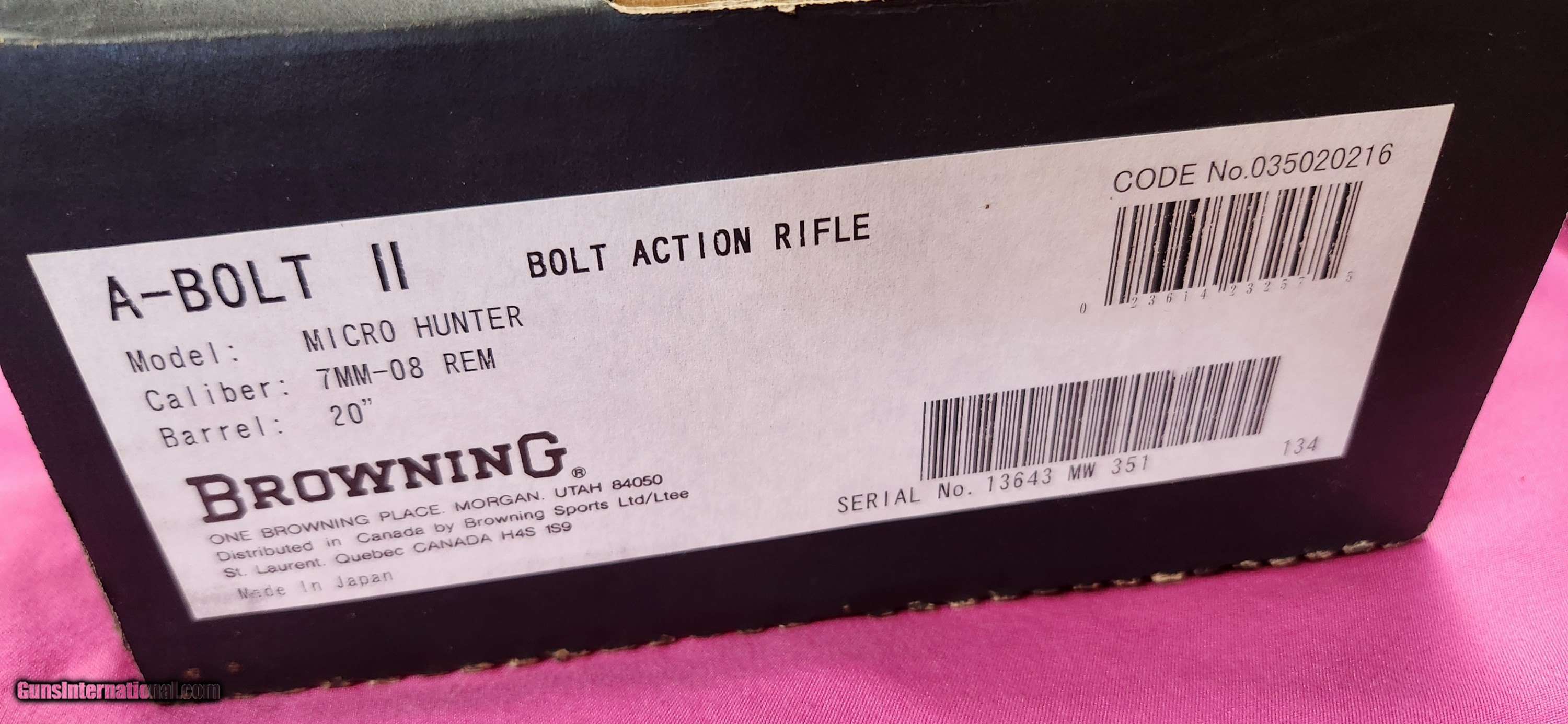 Description: Browning A-Bolt II Micro Hunter. 7mm-08 caliber. 20 inch barrel. 13 3/8 inc LOP. Decelerator recoil pad. Leupold scope ring bases. Made in 2004. Nearly new condition, with box. No manual. $1150 includes shipping to FFL Only. E-MAIL PLEASE. SOLD Rifle Caliber: 7mm-08 Remington Manufacturer: BROWNING Model: A BOLT II Serial Number: 13643MW351 Barrel Length: 20 INCH LOP: 13 3/8 INCHES |
