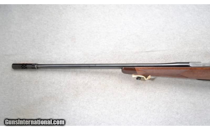 Description: This Browning Model A-Bolt Medallion is a right hand bolt action rifle in .338 Win. Mag. Cal. Only. It has a 24 inch barrel plus a Boss System. It is drilled and tapped for a scope mount. No sights are present. The butt stock is a checkered grip walnut pistol grip with a rosewood cap. The forearm is a checkered grip walnut with a rosewood tip. .338 Winchester Magnum SOLD Chambers: Hidden detachable magazine. Metal Condition: Excellent. Wood Condition: Very Good. Some minor handling marks. Bore Condition: Excellent. Barrels: 24 inch barrel with a Boss System. Stock Dimensions: LOP 13 1/2 inches. Fore End: Checkered grip walnut with a rosewood tip. Butt Pad: Browning black rubber recoil pad. Weight: 7 Lb. 6 Oz. Sights: Drilled and tapped for a scope mount. No sights are present. Item Location: Richfield, WI |