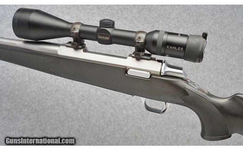 Description: A-Bolt stainless action with synthetic stock. Overall shows a fair amount of handling, few freckles. Quality optics installed. .300 Winchester Magnum SOLD Metal Condition: Stainless steel Bore Condition: Bright Sharp Barrels: 26 Inch Tapered Stainless Triggers: Single Stage Stock Dimensions: 13 3/4" LOP Butt Pad: Browning Recoil Pad Weight: 9 lbs 1 oz Sights: "Kahles 3.5-10 x 50 mm, 4A Style Reticle Item Location: Buda, TX |