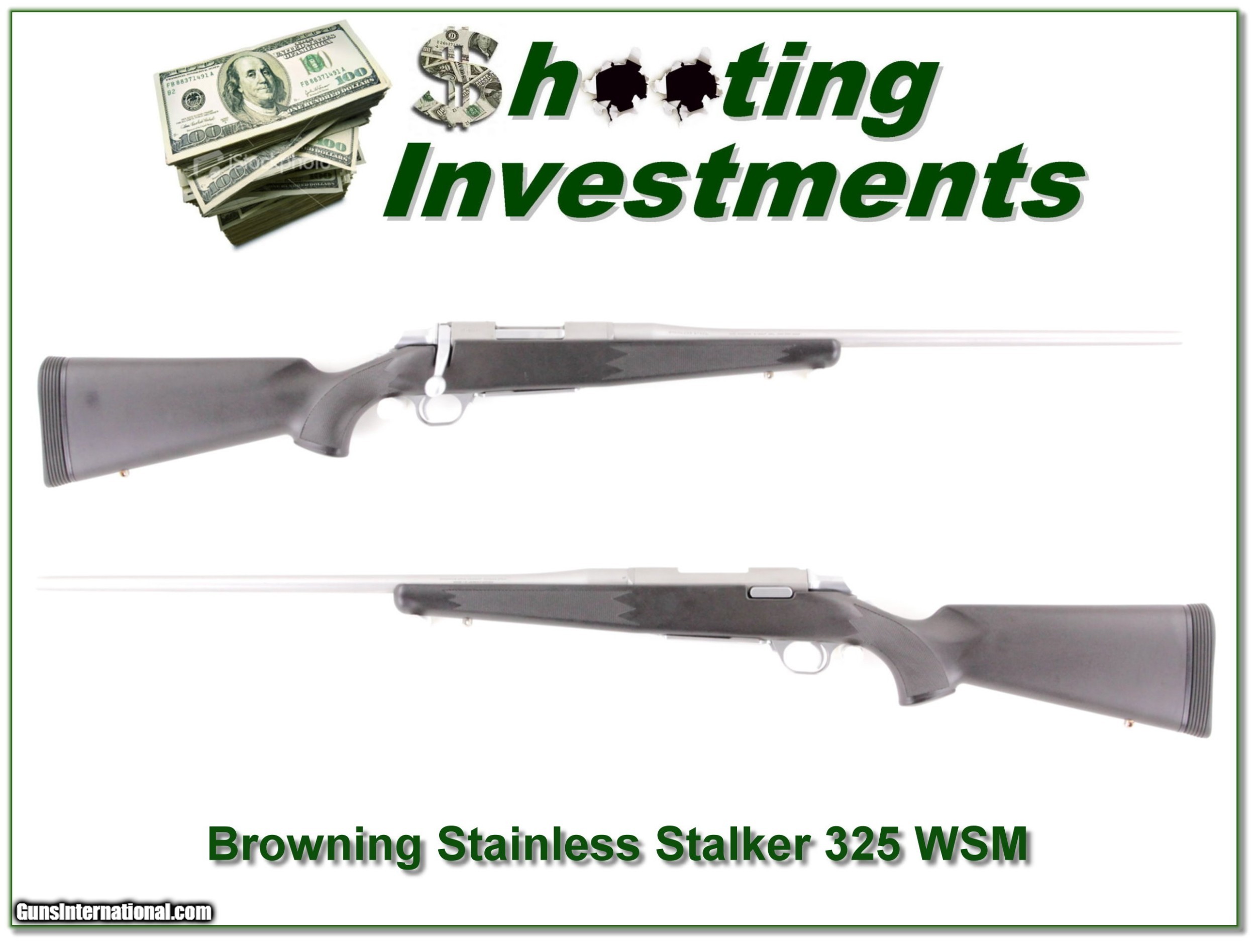 Description: This is an excellent condition Browning A-bolt Stainless Stalker in the hard-hitting 325 WSM. It has a 22in barrel and will make an excellent light wieght all-weather big game hunting gun that pack a big punch! Perfect for Moose, elk, bear or nay big game! It has no marks of note and these are hard to find in this caliber. I’m sure never fired many rounds! Shipping with insurance is $39. Please email me with any questions or larger pictures. (Consign your quality firearms with Shooting Investments for only 12%! Let me know if you have any you would like to sell!) 18-0889 Payment: Payment is by Money Order, Cashiers Check or Personal Check. I can now also accept MasterCard and Visa with a 3% convenience fee. PayPal can be used for some items but never firearms. Please let us know if you would like to pay via PayPal. Shipping: The shipping charge will be listed in each description. It is $39 for most long guns and $29 for most handguns. Some heavy guns or those insured for over $2000 will be higher. Shipments to Alaska and Hawaii are higher because air shipment is required. Most firearms are shipped on Tuesday and Thursday and usually in 5 days of receipt of payment. We package all shipments carefully and insure them. For long guns you can purchase a new Plano case for $19. They now cost us $22 when buying 100 at a time. Optics are shipped Priority Mail and most other non-firearm shipments are shipped First Class. Returns: Our return policy is simple. If for any reason you are not pleased with your purchase, you may return your item for a full refund of purchase price. Ammunition cannot be returned. It is important to us that you are happy. Guns cannot be fired or dissembled before returning them and they must be returned in the same condition as received. Notification of a return must occur with-in 3 days of receipt at your dealer. Shipping, convenience and dealer fees are not refundable and are the responsibility of the buyer. Lay-a-way: If needed, we offer a 60 day lay-a-way option on most firearms. It is 1/3 now, 1/3 in 30 days and 1/3 in 60 days. Lay-a-way firearm sales are final and if not completed the first payment cannot be returned. Consigning your firearms with Shooting Investments: We will help you get top dollar for your firearms. While most local guns shops charge 20% or more, our fee is only 12% with a minimum of $75. At your local gun shop it might take months to sell. Selling on-line provides instant access to thousands of interested buyers. You won’t find any other on-line dealer willing to sell your firearms for only 12% or listing every gun on 3 separate s. Selling through an House typically costs the seller 15% and the buyer an addition 15% (so 30%) and you have to wait several months to sell and longer to receive funds. If properly priced, we will sell your firearms in a few weeks. Send us an email or give us a call and we’ll explain how easy it is for you to get top dollar. Trading: Trading for use is really just buying your gun to re-sell. If you have a gun you want to trade, please email a picture and we will let you know what we can give or it. You will always get more if we sell it for you on consignment. Help for California Buyers: We are happy to ship to California. It is the buyer’s responsibility to make sure any item you buy is legal in your state. We are also happy to help with your purchase of a firearm from someone other than us. If you see a gun you would like to buy but the seller can’t or won’t ship to California they can ship to use and we’ll then ship it to your California dealer. The cost for this service is only $30 + shipping. Let us know if we can help! SOLD |