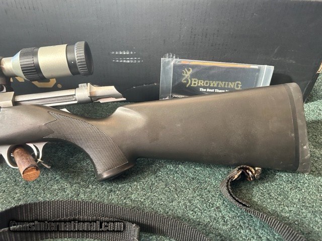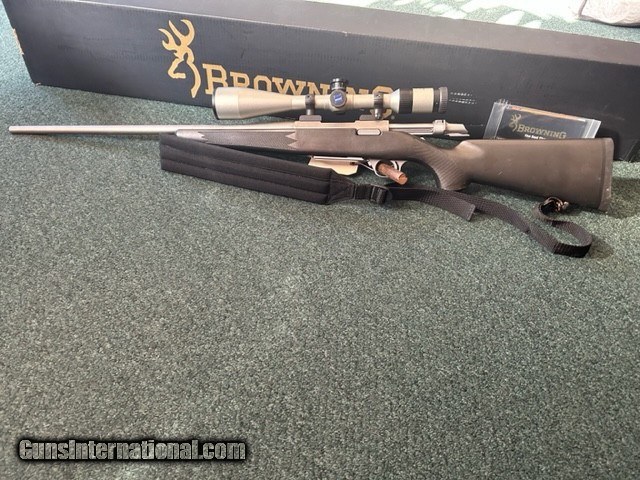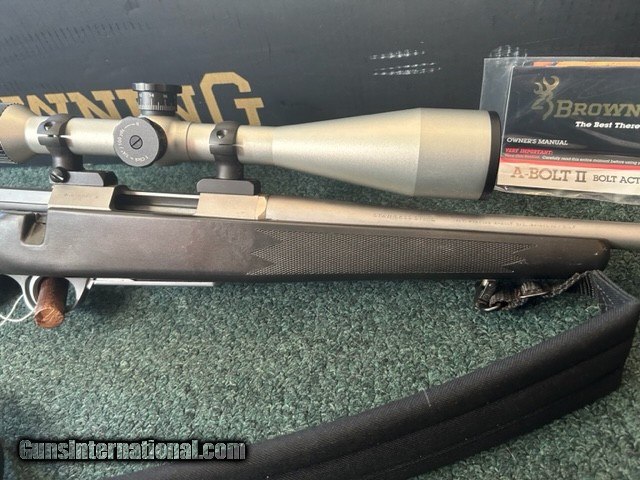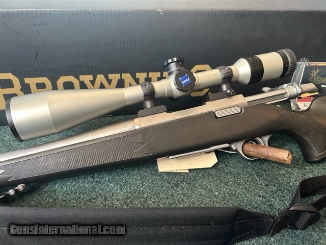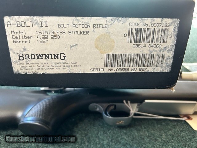 Description: Browning, Stainless Stalker, A Bolt, .22-250, Made in Japan, 22" barrel, Zeiss Conquest 6,5-20x50 MC scope, with box and papers, 98% condition, NO SLING or SLING SWIVELS only studs. Serial Number 05688NV8S7. For further information and faster service call John at 941-224-5563. SOLD |