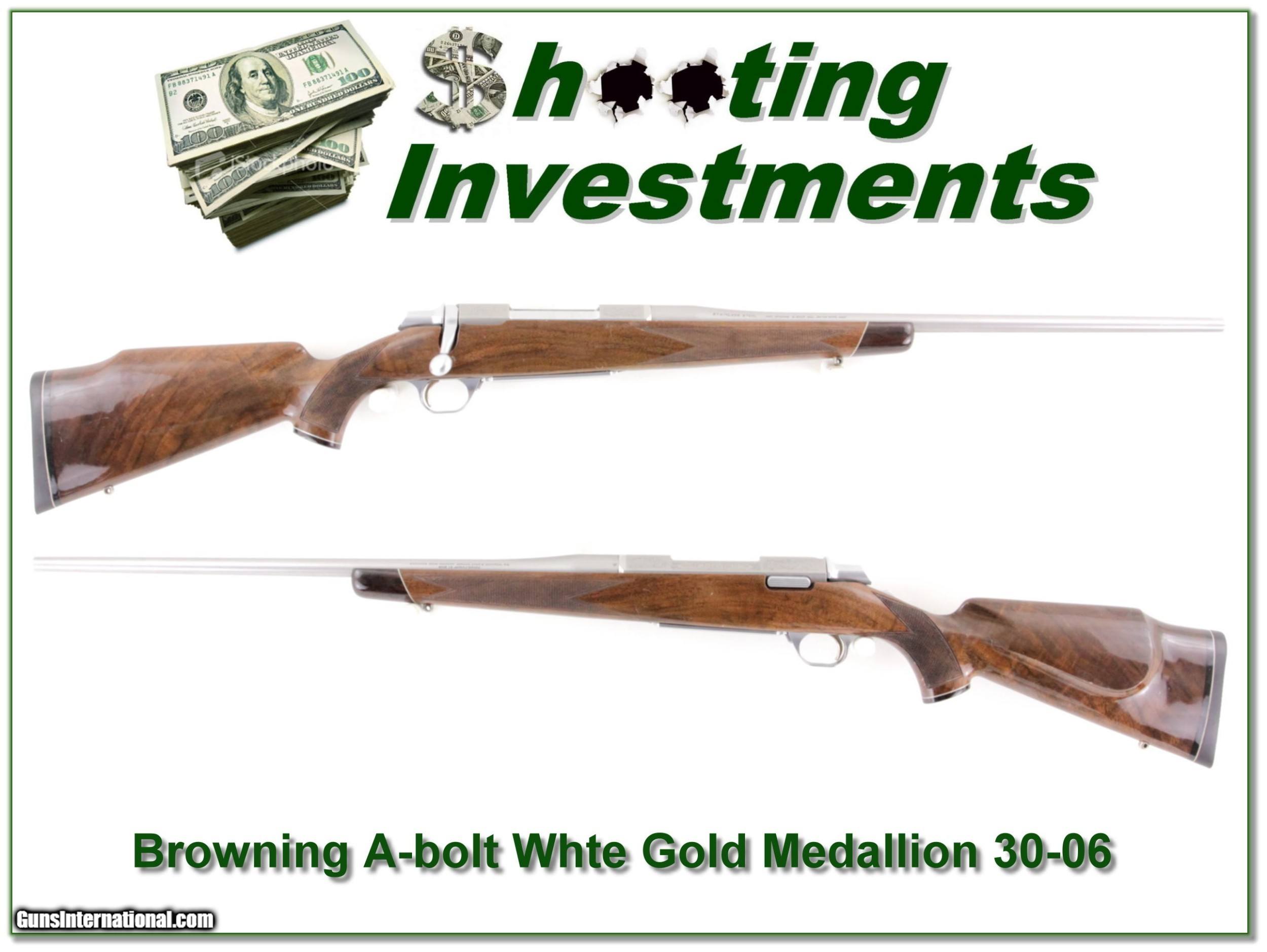Description: This is a beautiful High-Grade Browning A-bolt White Gold Medallion 30-60. It is stainless with XX Walnut. The metal is excellent with 22in barrel. The wood has a few marks from use. It will make an impressive hunting gun! Shipping and insurance is $39. Please email me with any questions or larger pictures. (Consign your quality firearms with Shooting Investments for only 12%! Let me know if you have any you would like to sell!) 19-0339 Payment: Payment is by Money Order, Cashiers Check or Personal Check. I can now also accept Credit Cards (MasterCard, Visa, Discover & American Express) with a 3% convenience fee. PayPal can be used for some items but never for firearms. Shipping: The shipping charge will be listed in each description. It is $39 for most firearms. Some heavy guns or those insured for over $2000 will be higher. Shipments to Alaska and Hawaii are higher because air shipment is required. Most firearms are shipped on Tuesday and Thursday and usually in 5 days of receipt of payment. We package all shipments carefully and insure them. Optics are shipped Priority Mail and most other non-firearm shipments are shipped First Class. Returns: Our return policy is simple. If for any reason you are not pleased with your purchase, you may return your item for a full refund of purchase price. Ammunition cannot be returned. It is important to us that you are happy. Guns cannot be fired or dissembled before returning them and they must be returned in the same condition as received. Notification of a return must occur with-in 3 days of receipt at your dealer. Shipping, convenience and dealer fees are not refundable and are the responsibility of the buyer. Lay-a-way: If needed, we offer a 60 day lay-a-way option on most firearms. It is 1/3 now, 1/3 in 30 days and 1/3 in 60 days. Lay-a-way firearm sales are final and if not completed the first payment cannot be returned. Consigning your firearms with Shooting Investments: We will help you get top dollar for your firearms. While most local guns shops charge 20% or more, our fee is only 12% with a minimum of $75. At your local gun shop it might take months to sell. Selling on-line provides instant access to thousands of interested buyers. You won’t find any other on-line dealer willing to sell your firearms for only 12% or listing every gun on 3 separate s. Selling through an House typically costs the seller 15% and the buyer an addition 15% (so 30%) and you have to wait several months to sell and longer to receive funds. If properly priced, we will sell your firearms in a few weeks. Send us an email or give us a call and we’ll explain how easy it is for you to get top dollar. Trading: Trading for use is really just buying your gun to re-sell. If you have a gun you want to trade, please email a picture and we will let you know what we can give or it. You will always get more if we sell it for you on consignment. Help for California Buyers: We are happy to ship to California. It is the buyer’s responsibility to make sure any item you buy is legal in your state. We are also happy to help with your purchase of a firearm from someone other than us. If you see a gun you would like to buy but the seller can’t or won’t ship to California they can ship to use and we’ll then ship it to your California dealer. The cost for this service is only $30 + shipping. Let us know if we can help! SOLD |