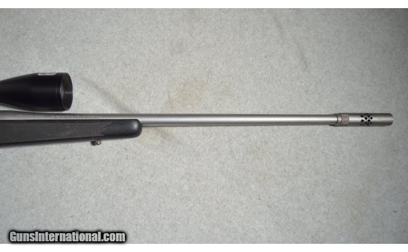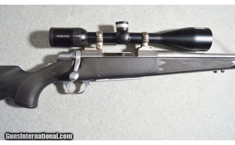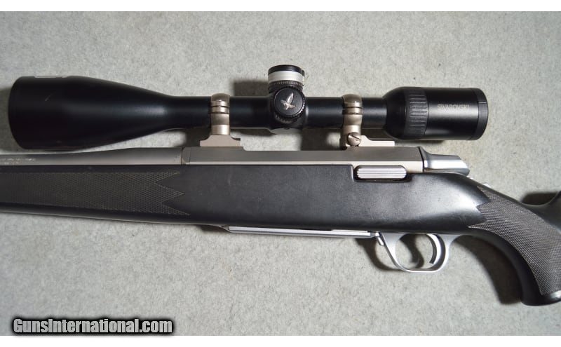 Description: Browning A-Bolt bolt-action rifle chambered in the powerful .338 Winchester Magnum. The bolt assembly utilizes Browning's anti-bind bolt with 3 locking lug. 3 locking lugs allow a short 60° bolt handle lift for fast cycling and increased scope clearance. Stainless finish with threaded barrel and attached Browning Ballistic Optimizing Shooting System (BOSS) muzzle brake. Also comes with a mounted Swarovski Z-series Riflescope. .338 Winchester Magnum SOLD Metal Condition: Good with minor handling marks Wood Condition: Some minor scuffs as well as wear and handling marks Bore Condition: Bright and clear with good rifling Barrels: Compensator attached Weight: 7 Lbs 8 OZ Sights: Mounted Swarovski Z-series Riflescope Item Location: Fort Worth, TX |