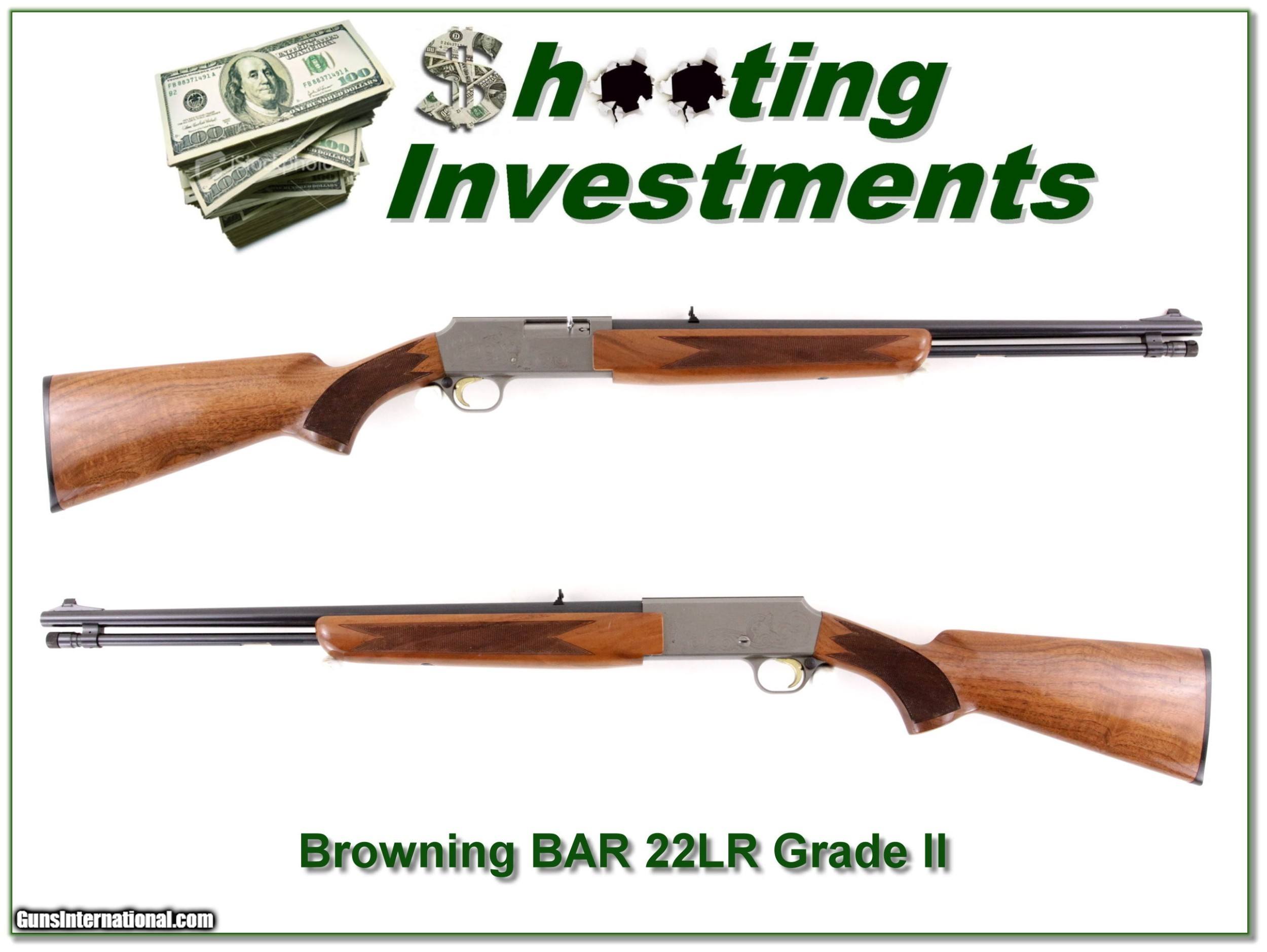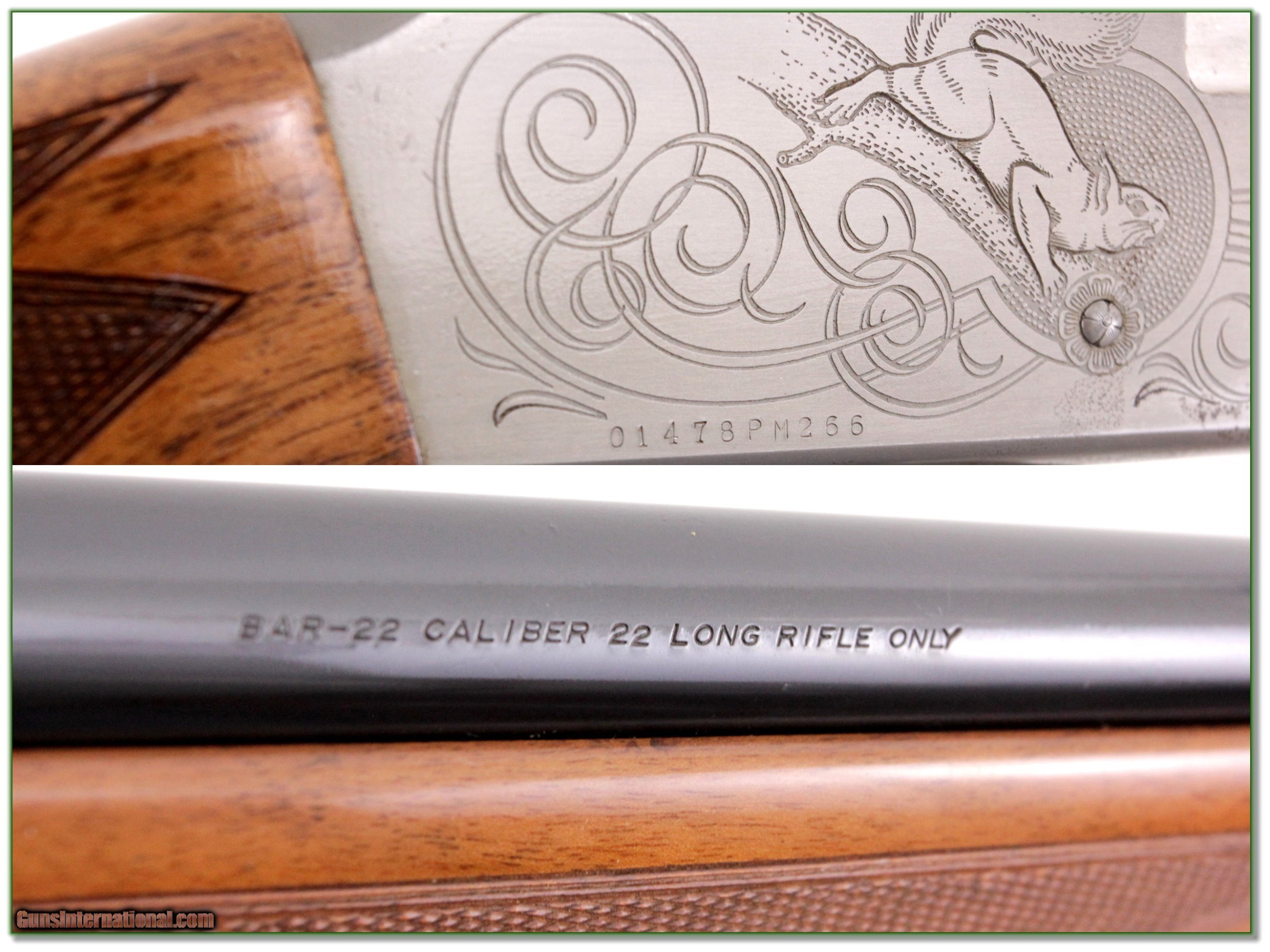 Description: Collectors, this is a VERY hard to find Browning BAR Grade II 22 rimfire. These are nicely engraved with rabbit and squirrel. It has beautiful wood with just a few minor marks. The barrel blue is excellent and I’m sure this one hasn’t fired many rounds. There a few freckles on the grey receiver. Shipping with insurance is $39. Please email me with any questions or larger pictures. (Consign your quality firearms with Shooting Investments for only 12%! Let me know if you have any you would like to sell!) 19-1347 Payment: Payment is by Money Order, Cashiers Check or Personal Check. I can now also accept MasterCard and Visa with a 3% convenience fee. PayPal can be used for some items but never firearms. Please let us know if you would like to pay via PayPal. Shipping: The shipping charge will be listed in each description. It is $39 for most long guns and $29 for most handguns. Some heavy guns or those insured for over $2000 will be higher. Shipments to Alaska and Hawaii are higher because air shipment is required. Most firearms are shipped on Tuesday and Thursday and usually in 5 days of receipt of payment. We package all shipments carefully and insure them. For long guns you can purchase a new Plano case for $19. They now cost us $22 when buying 100 at a time. Optics are shipped Priority Mail and most other non-firearm shipments are shipped First Class. Returns: Our return policy is simple. If for any reason you are not pleased with your purchase, you may return your item for a full refund of purchase price. Ammunition cannot be returned. It is important to us that you are happy. Guns cannot be fired or dissembled before returning them and they must be returned in the same condition as received. Notification of a return must occur with-in 3 days of receipt at your dealer. Shipping, convenience and dealer fees are not refundable and are the responsibility of the buyer. Lay-a-way: If needed, we offer a 60 day lay-a-way option on most firearms. It is 1/3 now, 1/3 in 30 days and 1/3 in 60 days. Lay-a-way firearm sales are final and if not completed the first payment cannot be returned. Consigning your firearms with Shooting Investments: We will help you get top dollar for your firearms. While most local guns shops charge 20% or more, our fee is only 12% with a minimum of $75. At your local gun shop it might take months to sell. Selling on-line provides instant access to thousands of interested buyers. You won’t find any other on-line dealer willing to sell your firearms for only 12% or listing every gun on 3 separate s. Selling through an House typically costs the seller 15% and the buyer an addition 15% (so 30%) and you have to wait several months to sell and longer to receive funds. If properly priced, we will sell your firearms in a few weeks. Send us an email or give us a call and we’ll explain how easy it is for you to get top dollar. Trading: Trading for use is really just buying your gun to re-sell. If you have a gun you want to trade, please email a picture and we will let you know what we can give or it. You will always get more if we sell it for you on consignment. Help for California Buyers: We are happy to ship to California. It is the buyer’s responsibility to make sure any item you buy is legal in your state. We are also happy to help with your purchase of a firearm from someone other than us. If you see a gun you would like to buy but the seller can’t or won’t ship to California they can ship to use and we’ll then ship it to your California dealer. The cost for this service is only $30 + shipping. Let us know if we can help! SOLD |