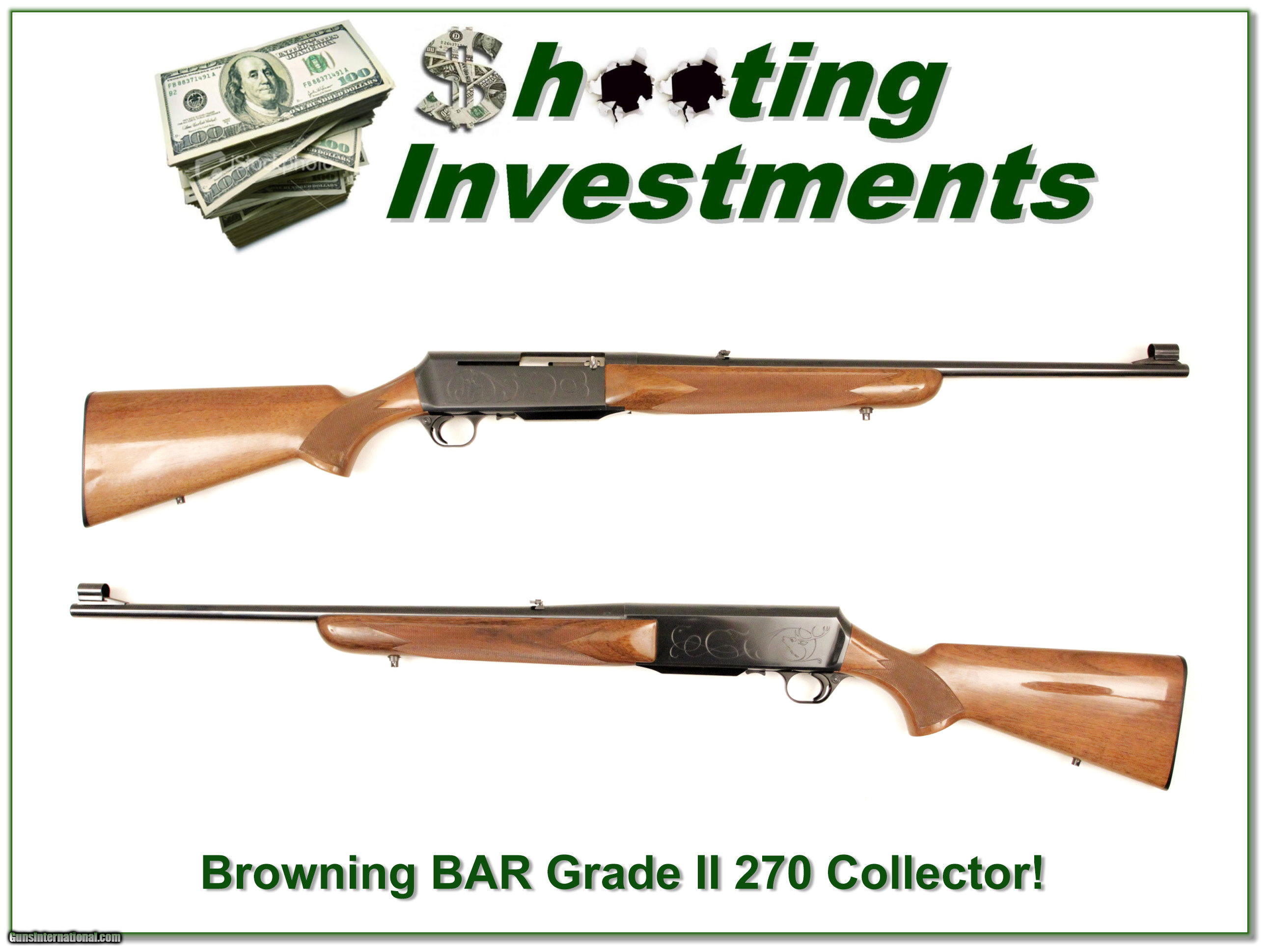 Description: This is an excellent condition and harder to find Browning BAR Grade II 270 Winchester. It is a full Belgium gun made in 1970. The blue is about new and the wood has only a couple storage marks. This will make a fine addition to your collection or be an impressive classic hunting gun! Shipping and insurance is $35 or $15 more if you want it shipped in a new Plano hard case. Please email me with any questions or larger pictures. (I now consign quality firearms only 10%! Let me know if you have any you would like to sell!) [16-0740] Payment: Payment is by Money Order, Cashiers Check or Personal Check. I can now also accept MasterCard and Visa with a 3% convenience fee. PayPal can be used for some items but never firearms. Please let us know if you would like to pay via PayPal. Shipping: The shipping charge will be listed in each description. It is $35 for most guns. Some heavy guns or those insured for over $2000 will be higher. Shipments to Alaska and Hawaii are higher because air shipment is required. Most firearms are shipped within 5 days of receipt of payment. We prefer shipping at the beginning of the week to avoid firearms in transit over weekends. We package all shipments carefully and insure them for the full purchase price, rounded up to the next $100. In the unlikely event that damage occurs, it is important that you save all packaging material for the claims process. Optics are shipped Priority Mail and most other non-firearm shipments are shipped First Class. Returns: Our return policy is simple. If for any reason you are not pleased with your purchase, you may return your item for a refund. The only exception is ammunition, it cannot be returned. It is important to us that you are happy. Guns cannot be fired or dissembled before returning them and must be returned in the same condition as received. Notification of a return must occur with-in 3 days of receipt at your dealer. Shipping, convenience and dealer fees are not refundable and are the responsibility of the buyer. Lay-a-way: If needed, we offer a 60 day lay-a-way option on most firearms. It is 1/3 now, 1/3 in 30 days and 1/3 in 60 days. Lay-a-way firearm sales are final. Consigning your firearms with Shooting Investments: We will help you get top dollar for your firearms. While most local guns shops charge 20% or more, our fee is only 10% with a minimum of $50. At your local gun shop it might take months to sell. Selling on-line provides instant access to thousands of interested buyers. You won’t find any other on-line dealer willing to sell your firearms for only 10% or listing every gun on 4 separate s. Selling through an House typically costs the seller 15% and the buyer an addition 15% (so 30%) and you have to wait several months to sell and longer to receive funds. If properly priced, we will sell your firearms in a week or two. Send us an email or give us a call and we’ll explain how easy it is for you to get top dollar. Trading: We collect guns and usually just trade for guns we want to add to our collections. We often sell guns for others wanting to purchase one of ours. We find this the most fair to both of us. Our Commission is only 10% and we hold the gun you want until yours sells. Please contact us if you want to sell one of yours to buy one of ours. Help for California Buyers: We are happy to ship to California. It is the buyer’s responsibility to make sure any item you buy is legal in your state. We are also happy to help with your purchase of a firearm from someone other than us. If you see a gun you would like to buy but the seller can’t or won’t ship to California we can help. You buy the gun and have it shipped to us. We’ll then ship it to your California dealer. The cost for this service is only $30 + shipping. Let me know if we can help! SOLD |