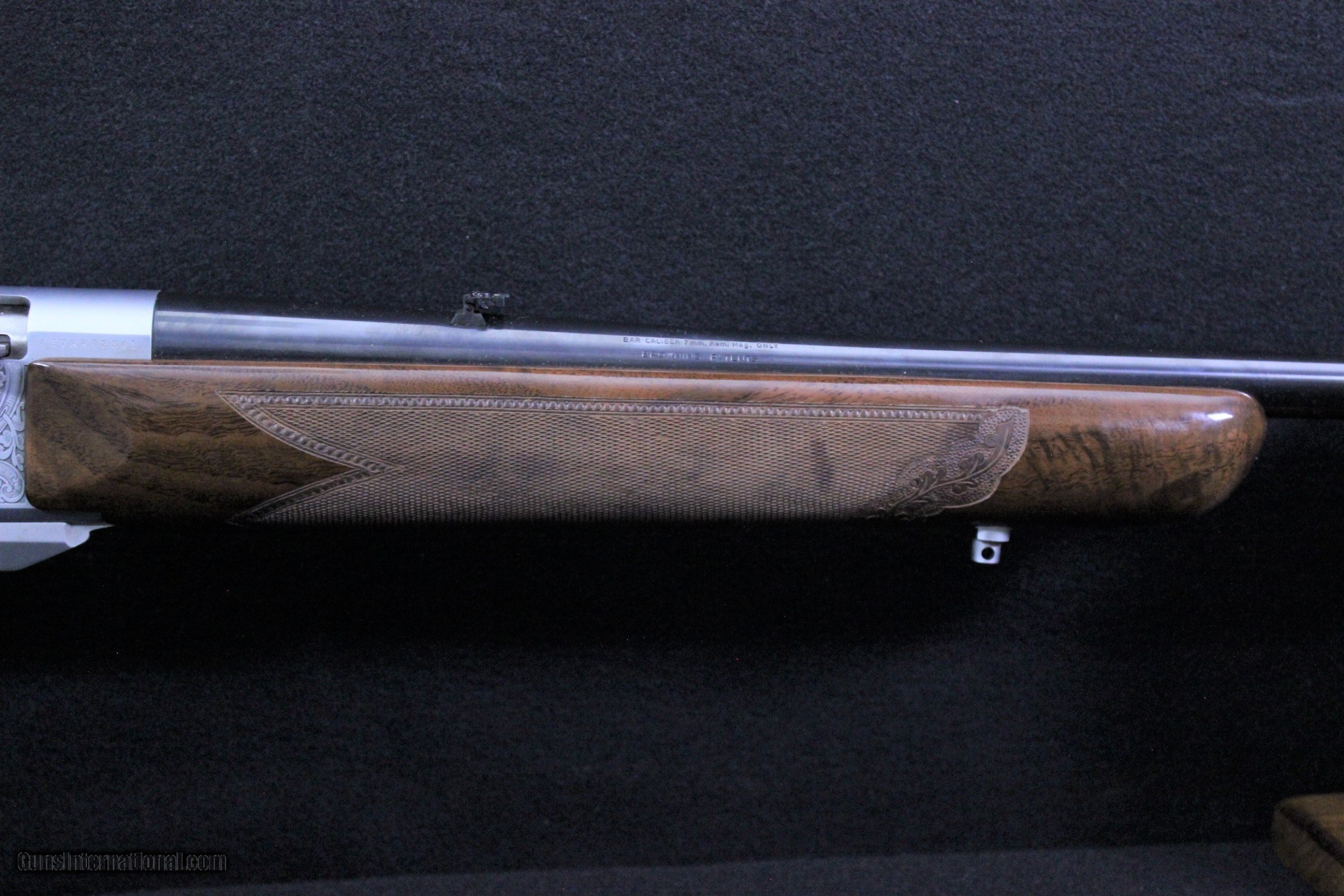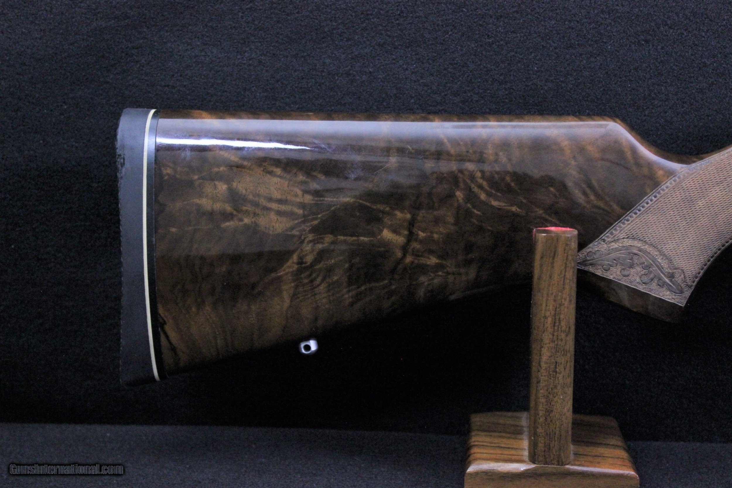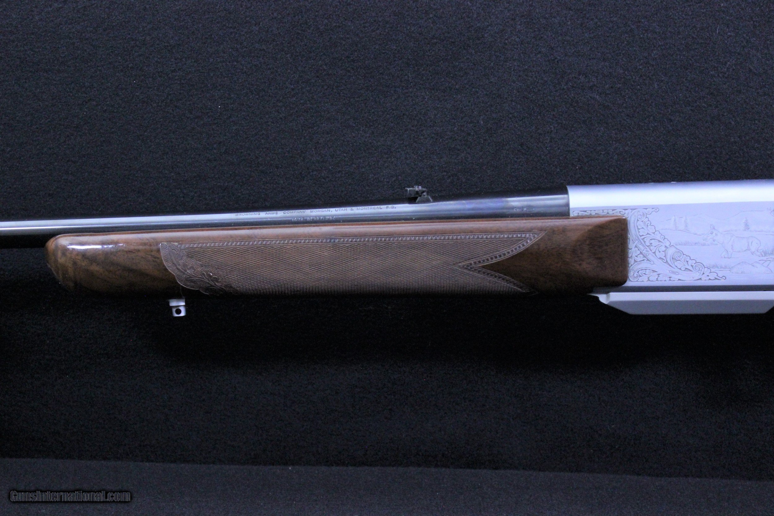 Description: Browning BAR Grade IV chambered in 7MM Rem. Mag. manufactured in 1977. This is a gorgeous rifle with amazing wood. Some minor handling marks but no scratches, chips or missing pieces. Checkering on pistol grip and forearm have remained crisp. Receiver has been floral and game scene engraved by L. Bague. Bore is excellent. Made in Belgium. Dimensions are as follows; BBL. 24" WT. 8lb. 8oz. DIM. 13 7/8" L.O.P. SOLD |