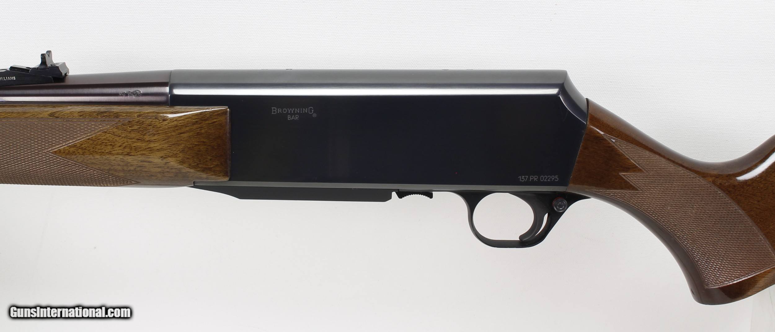 Description: Browning BAR High Power Semi-Auto Rifle in .270. SN #137PR02295. Made in Belgium in 1987. 22" Barrel with an EXCELLENT Bright Bore with STRONG RIFLING. The High Gloss Checkered Pistol Grip Stock and Forend is in VERY GOOD condition with just a couple of light handling marks. The Blued Metal is also in VERY GOOD to EXCELLENT condition. Open sights with a Williams rear sight. Tapped for a Scope. Plastic Buttplate with Browning Logo. Box magazine with hinged floorplate. Weight: 7.6 lbs. Trigger Pull: 3 1/2 lbs. More photos available upon request. Ships to Lower 48 W/ Insurance $50.00. SOLD Rifle Caliber: .270 Winchester Manufacturer: Browning Model: BAR Serial Number: 137PR02295 Barrel Length: 22 Condition: Excellent Metal Condition: VG to Excellent Wood Condition: VG Bore Condition: Excellent Action: Semi-Auto LOP: 14 Finish: Blue Weight: 7.6 lbs. Manufacture Date: 1987 |