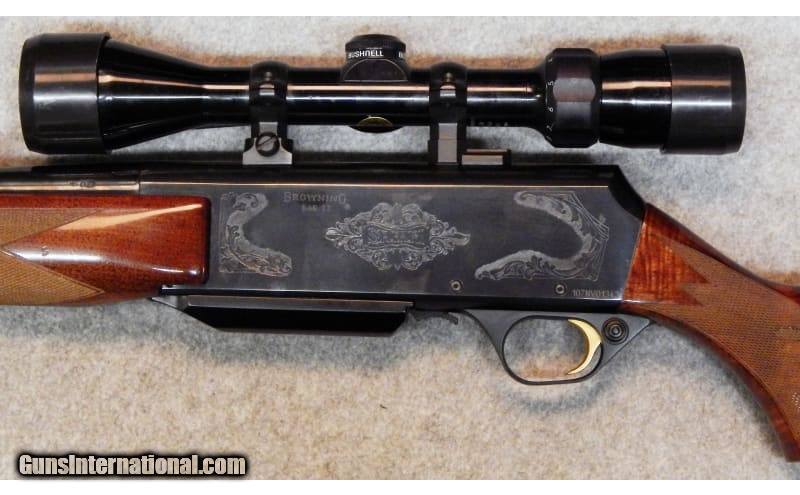 Description: Browning ~ BAR Safari ~ Chambered in .30-06 Springfield. Is a semiautomatic sporting rifle with a 4 + 1 capacity internalized magazine. Features a 22" barrel paired with a Bushnell 3-9x40 mm scope. Blued receiver is ornately engraved and complimented with checkered walnut furnishings. Comes with factory box. .30-06 Springfield SOLD Chambers: .30-06 Springfield. Metal Condition: Very good condition. Wood Condition: Very good condition. Bore Condition: Good condition. Stock Dimensions: 13.75" LOP. Fore End: Walnut. Butt Pad: Rubber. Weight: 9 pounds Sights: Bushnell 3-9x40 mm. Item Location: Acworth, GA |
