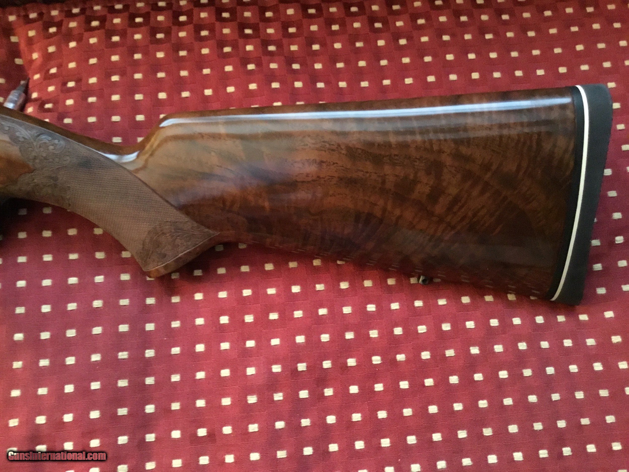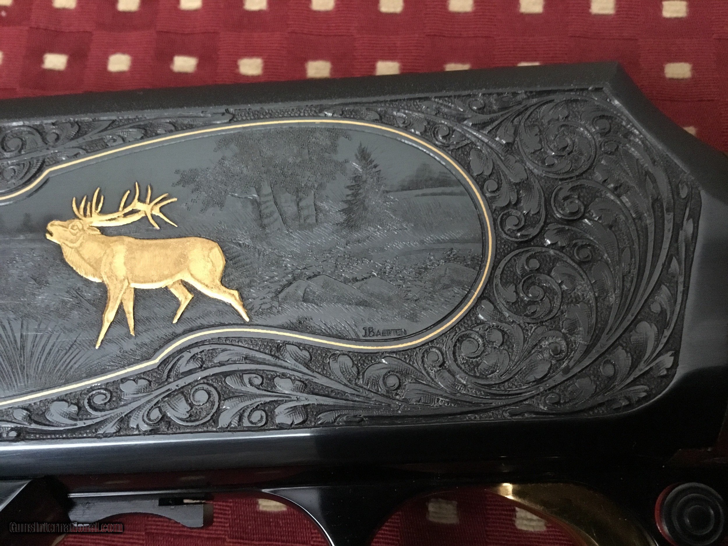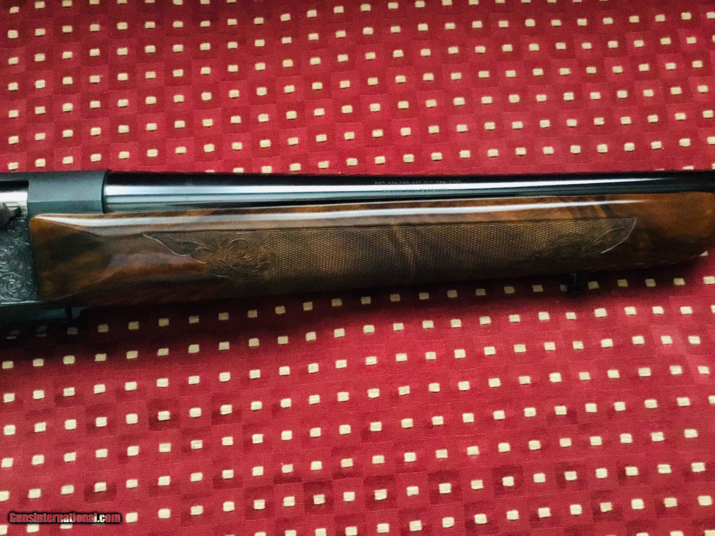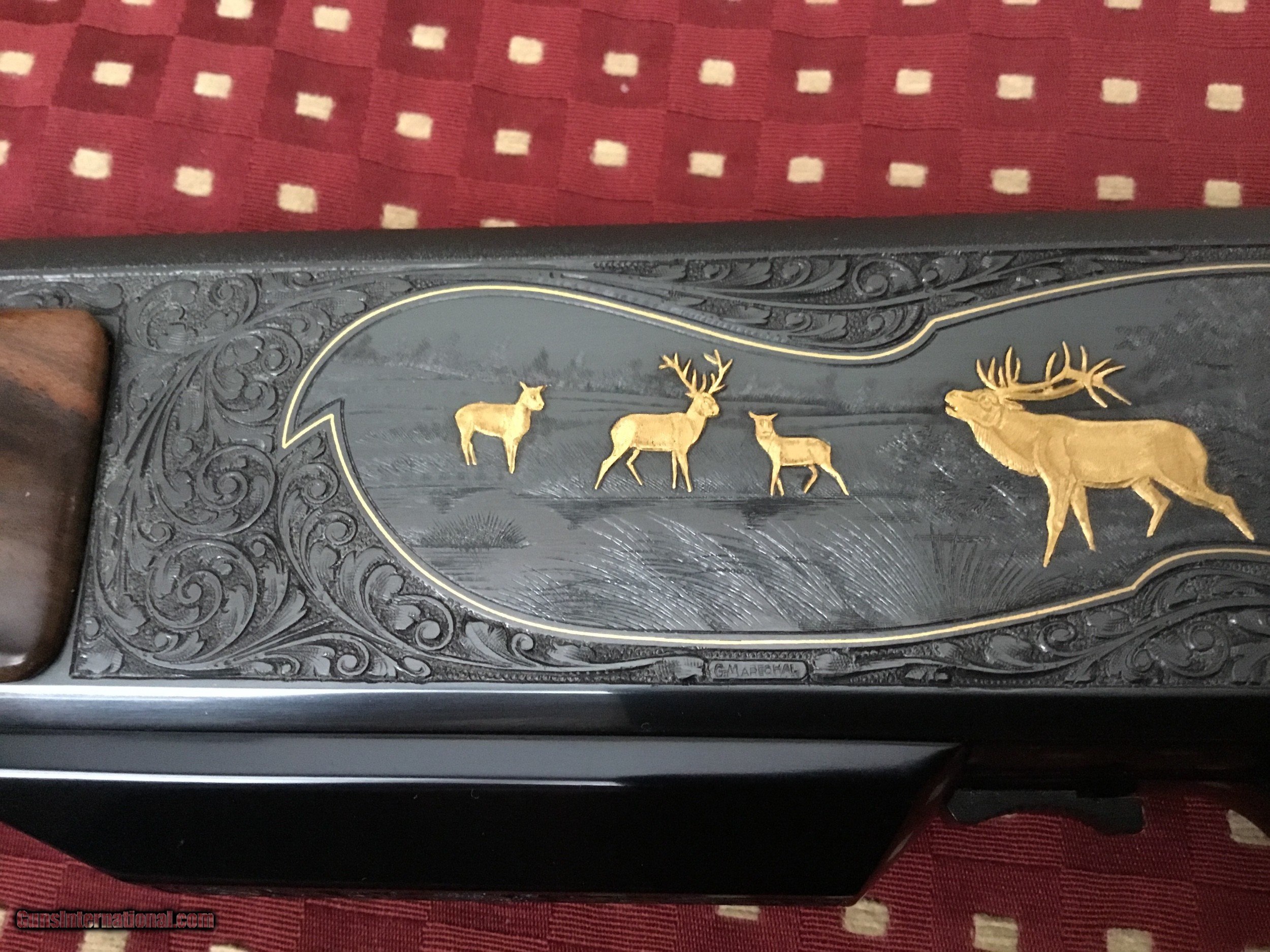 Description: Outstanding top of the line grade 5 BAR in the very rare 338 Win. Mag. Made in 1971, this rifle is engraved by the master J Baerten on the game scenes and G Marachal on the scroll work. Beautiful wood expertly carved on the grip and forearm. Perfect condition, probably unfired. SOLD |
