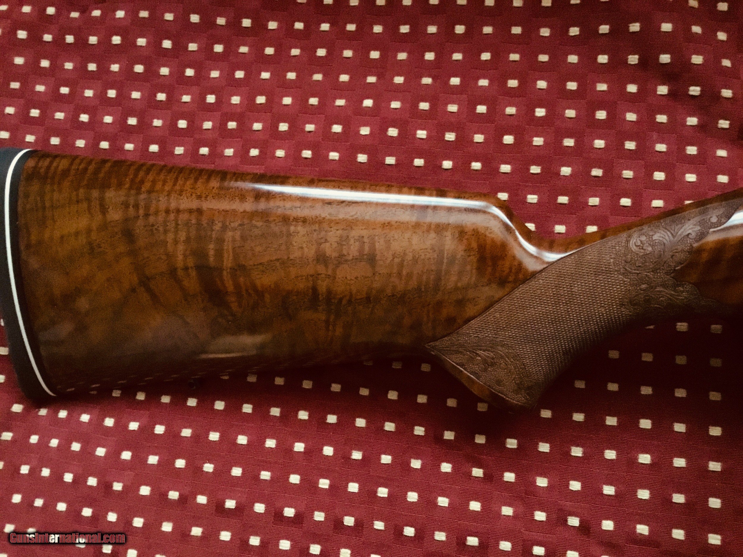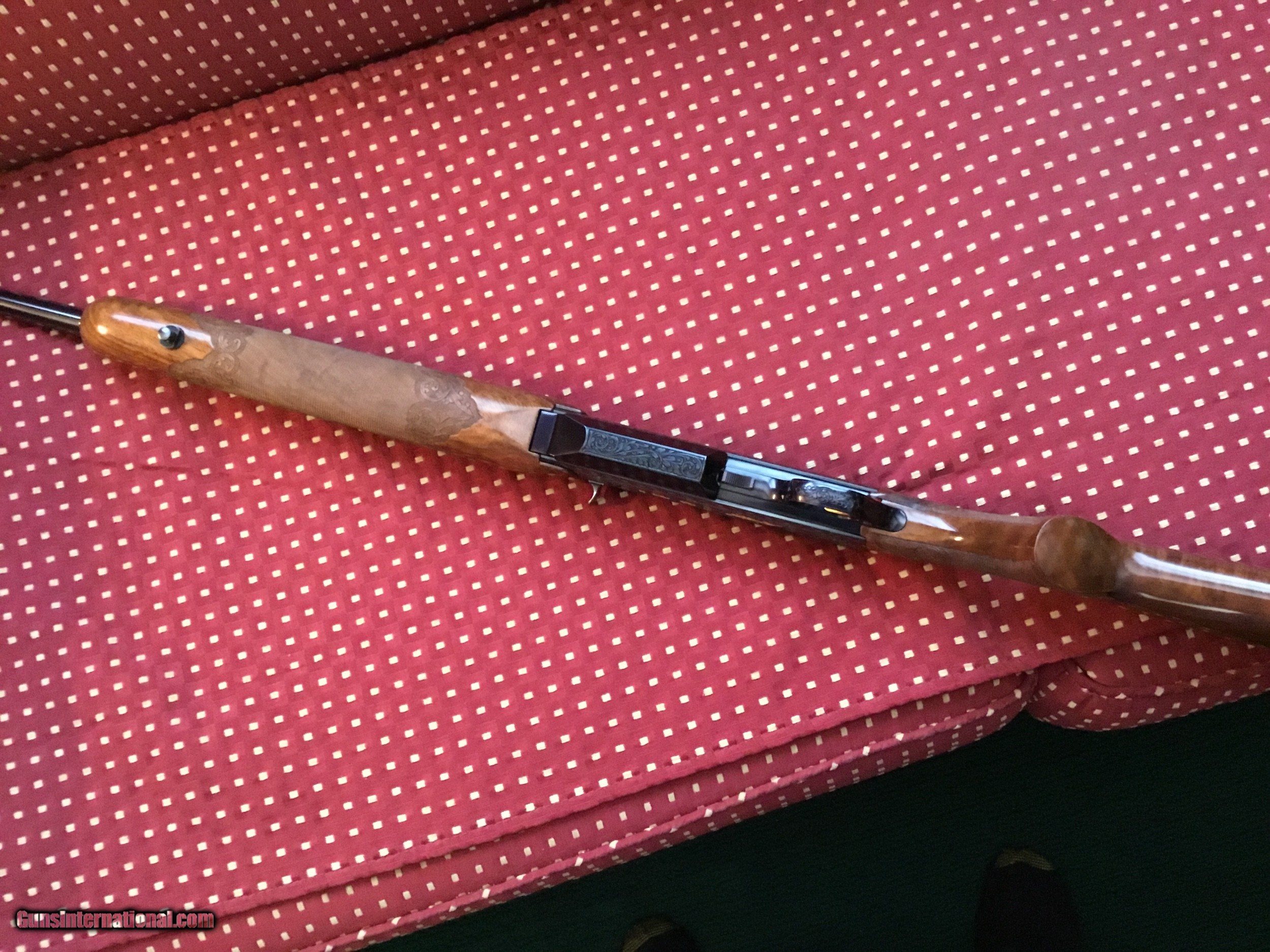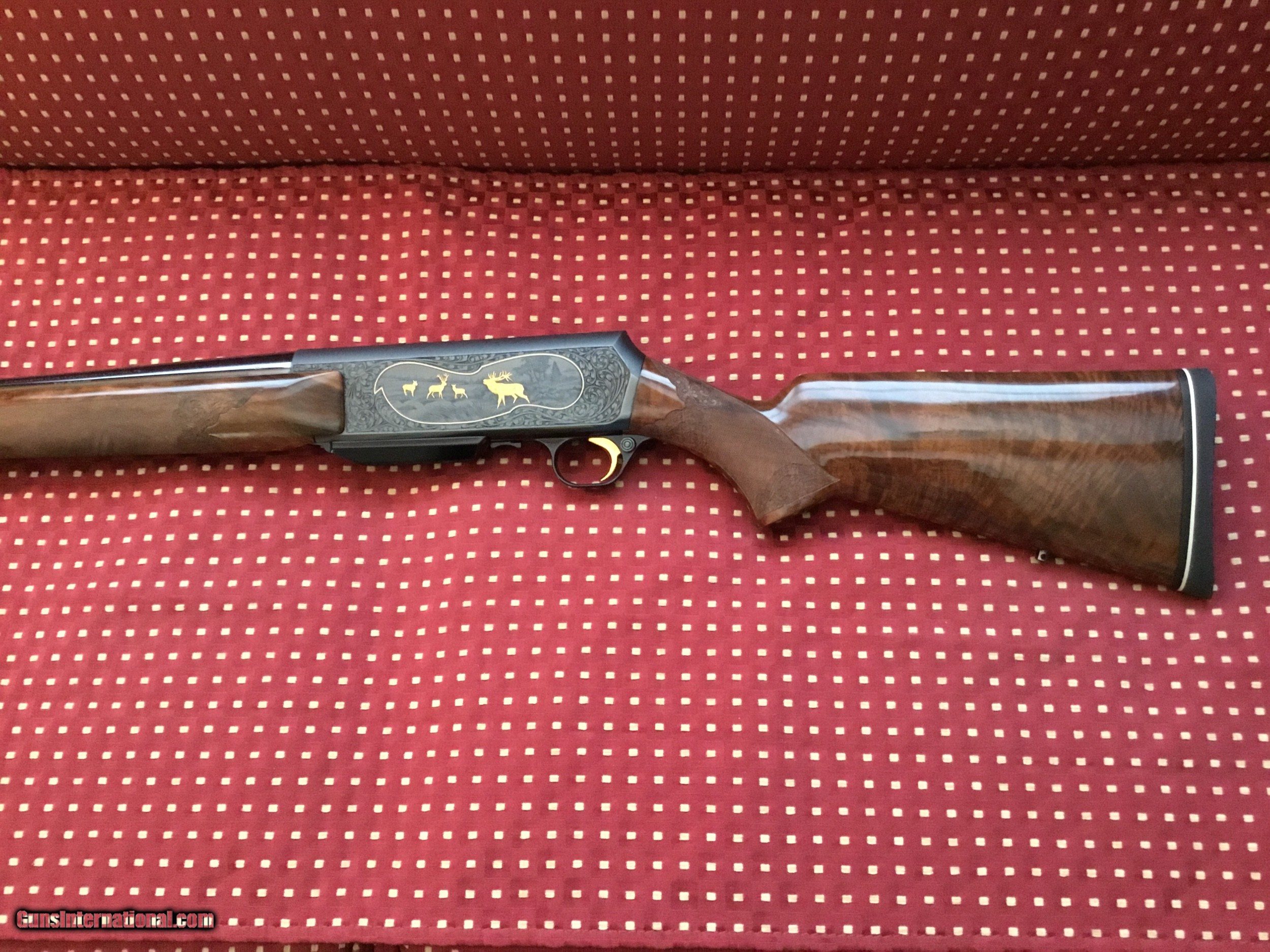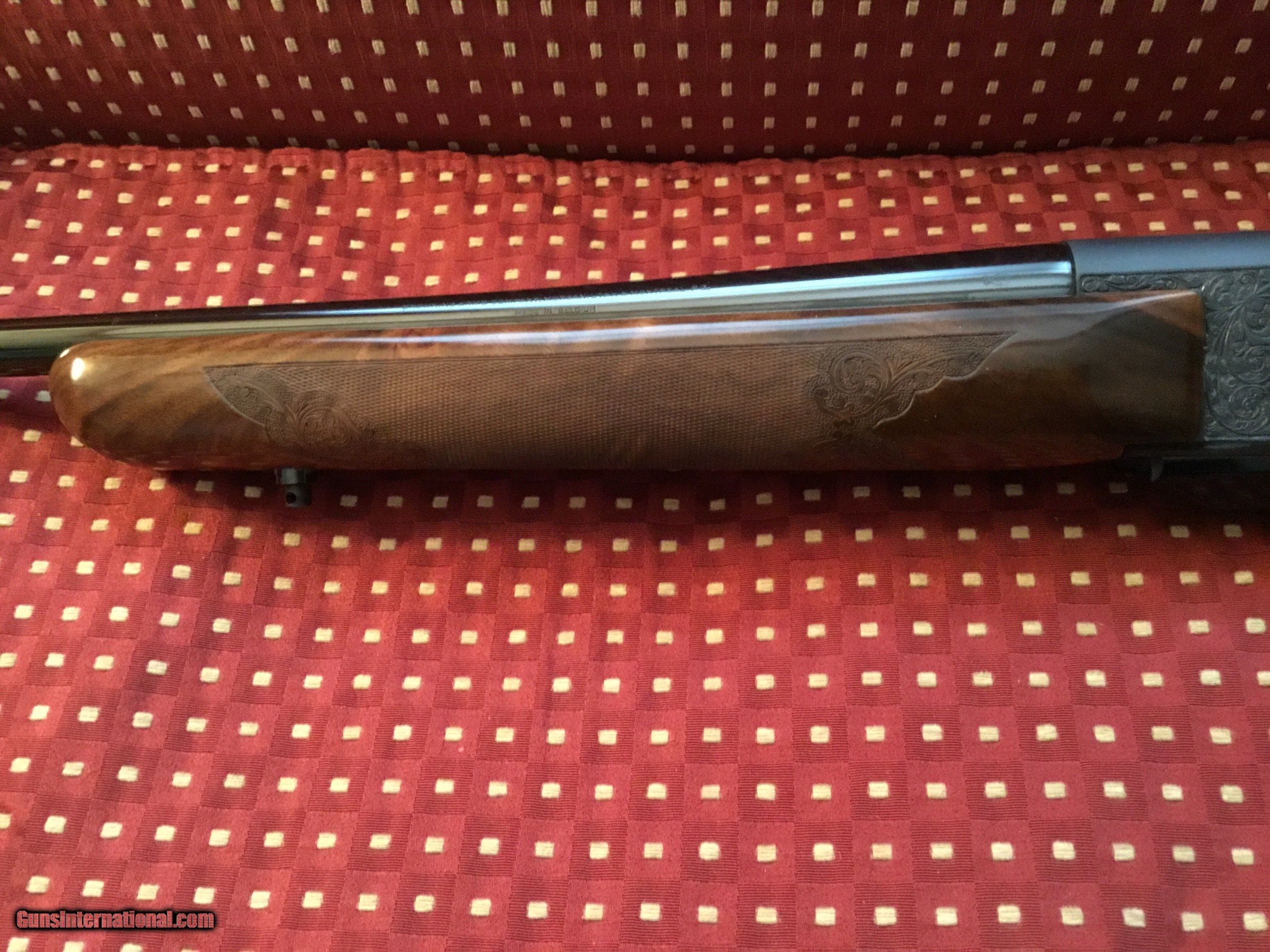 Description: Outstanding top of the line grade 5 BAR in the very rare 338 Win. Mag. Made in 1971, this rifle is engraved by the master J Baerten on the game scenes and G Marachal on the scroll work. Beautiful wood expertly carved on the grip and forearm. Perfect condition, probably unfired. SOLD |
