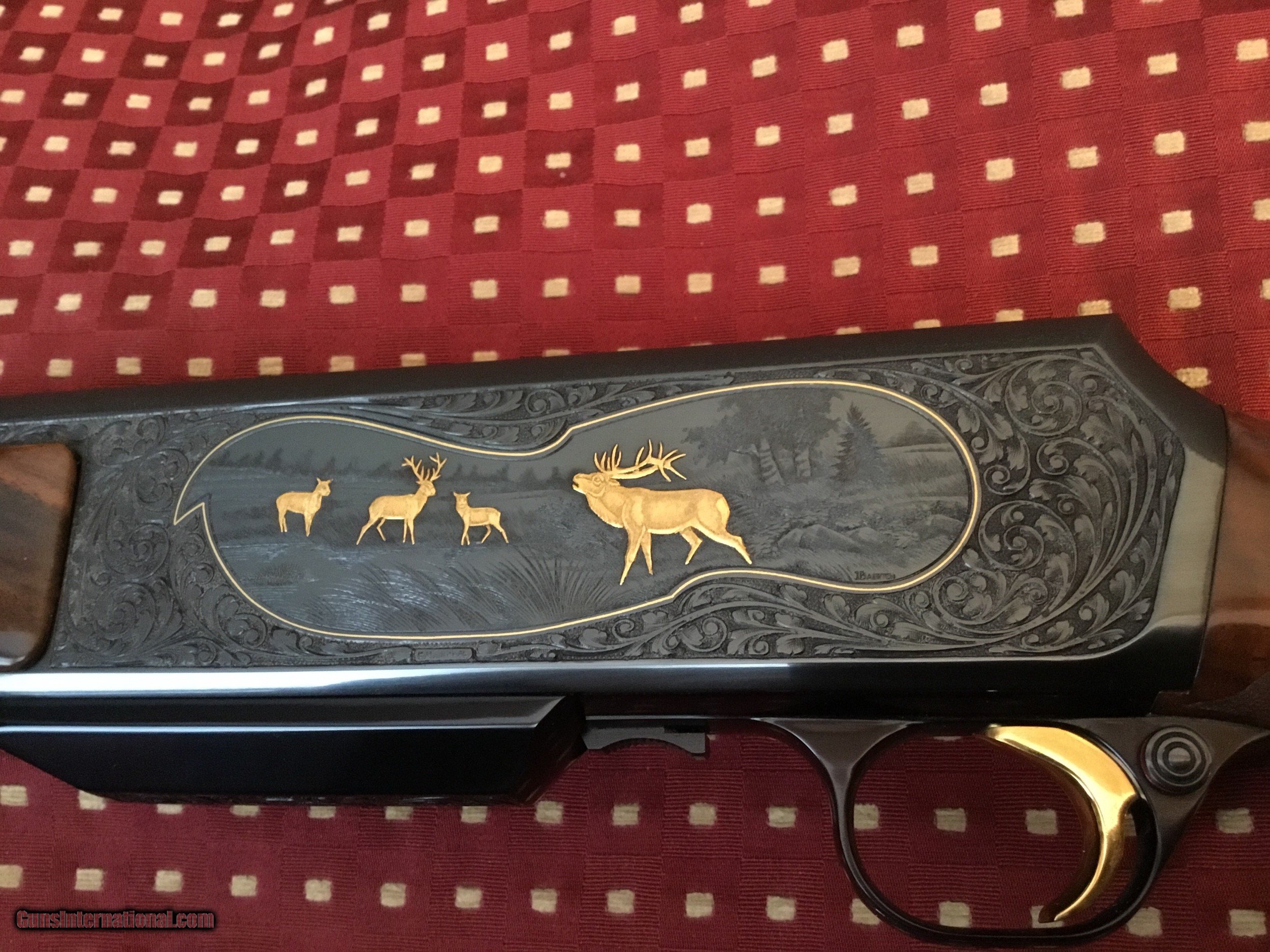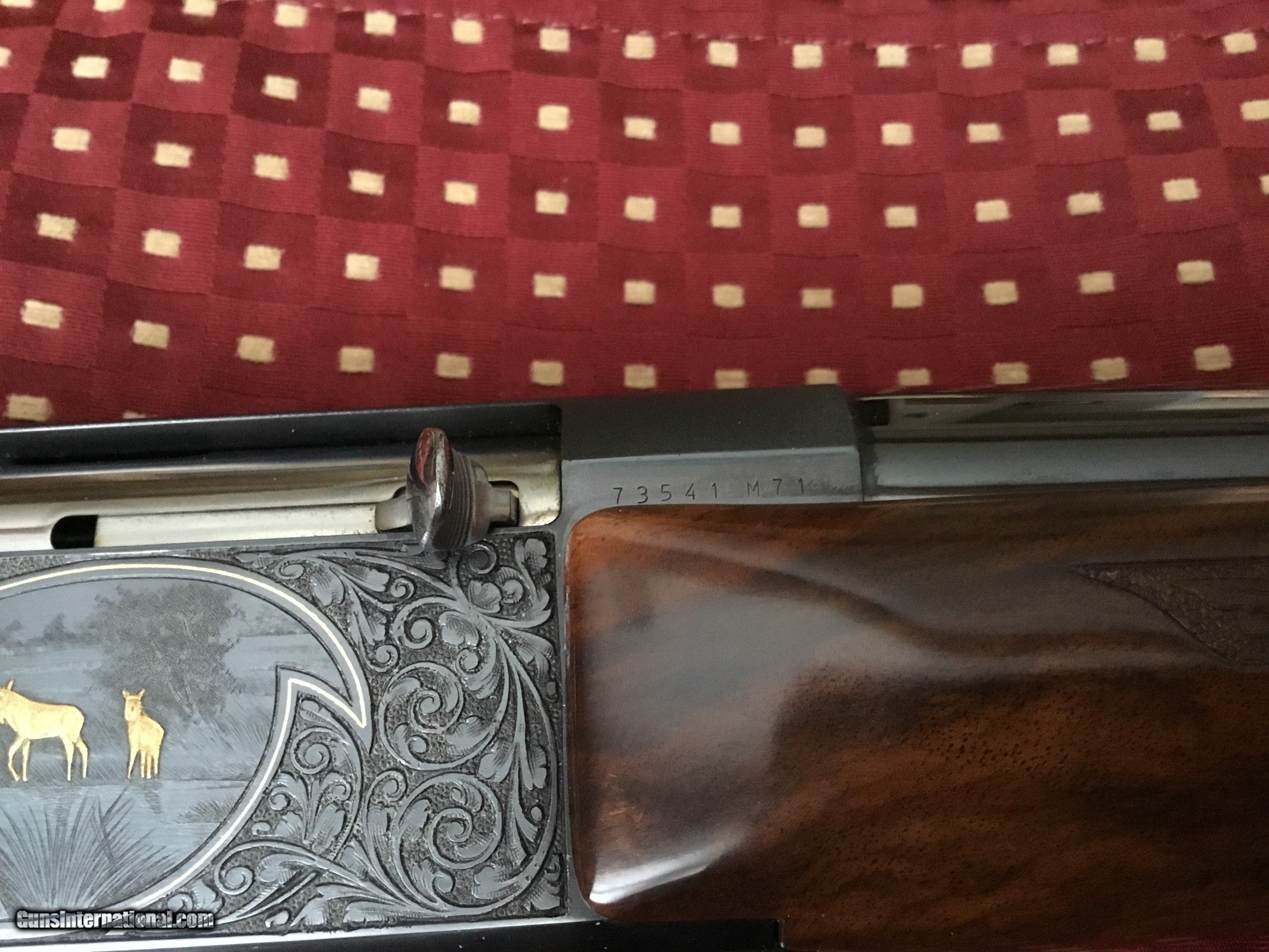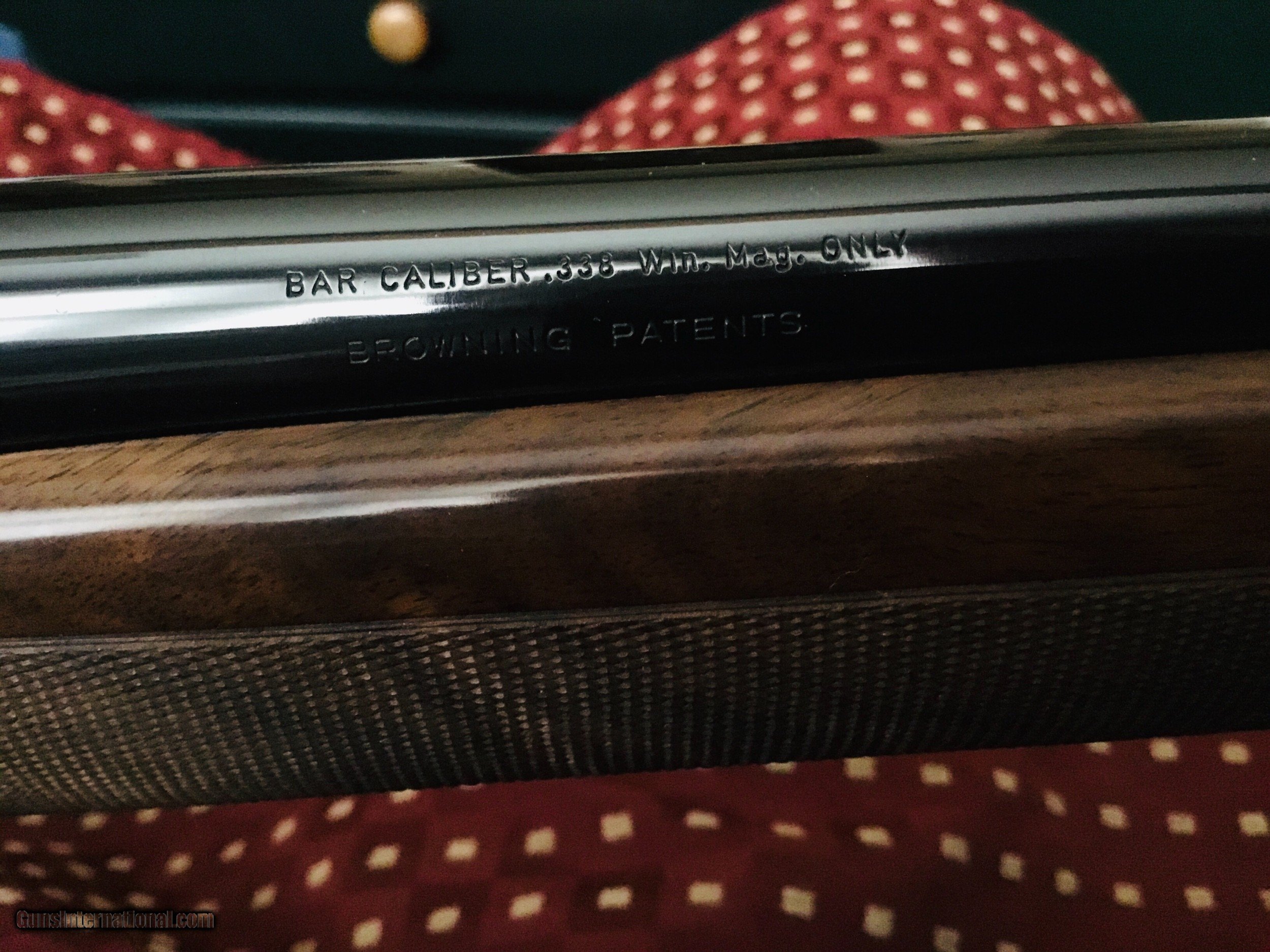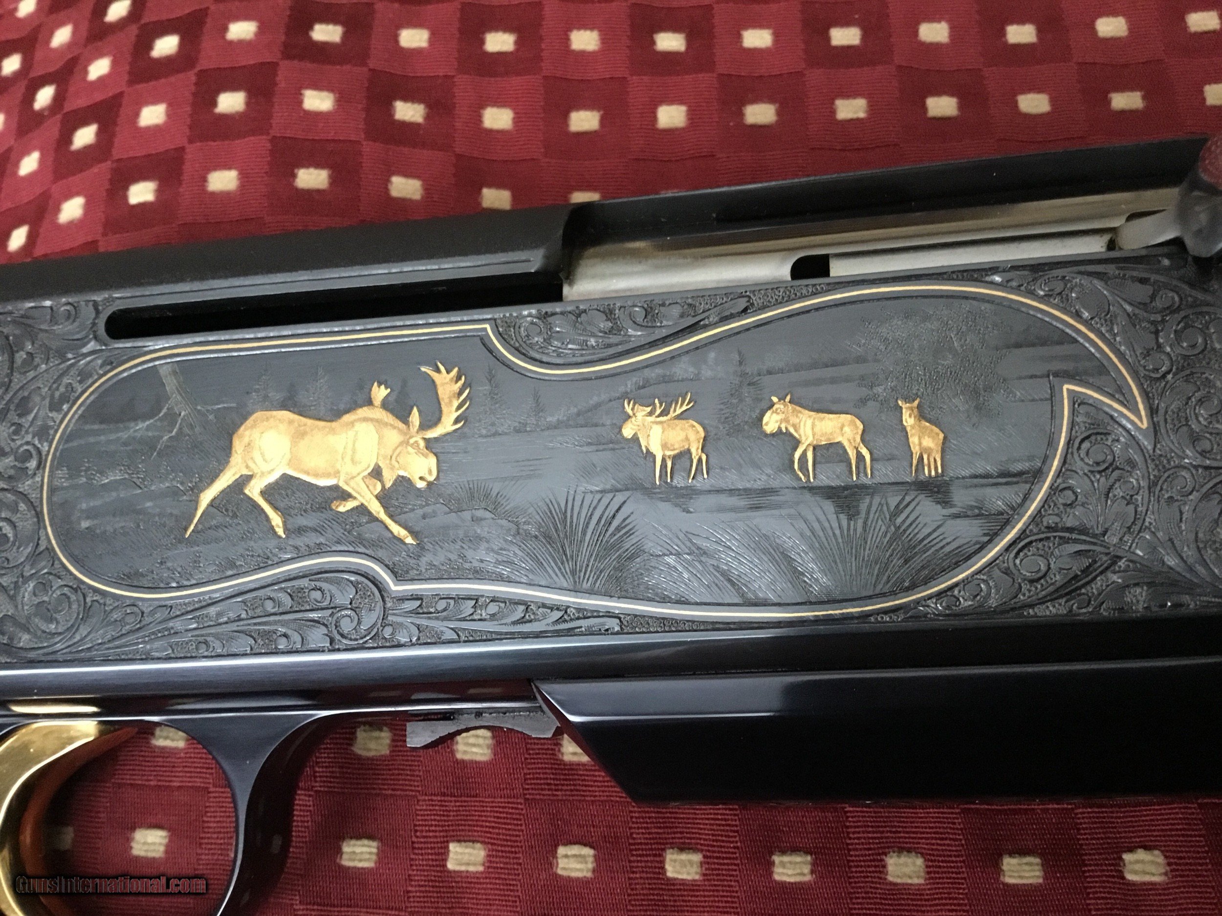 Description: Outstanding top of the line grade 5 BAR in the very rare 338 Win. Mag. Made in 1971, this rifle is engraved by the master J Baerten on the game scenes and G Marachal on the scroll work. Beautiful wood expertly carved on the grip and forearm. Perfect condition, probably unfired. SOLD |