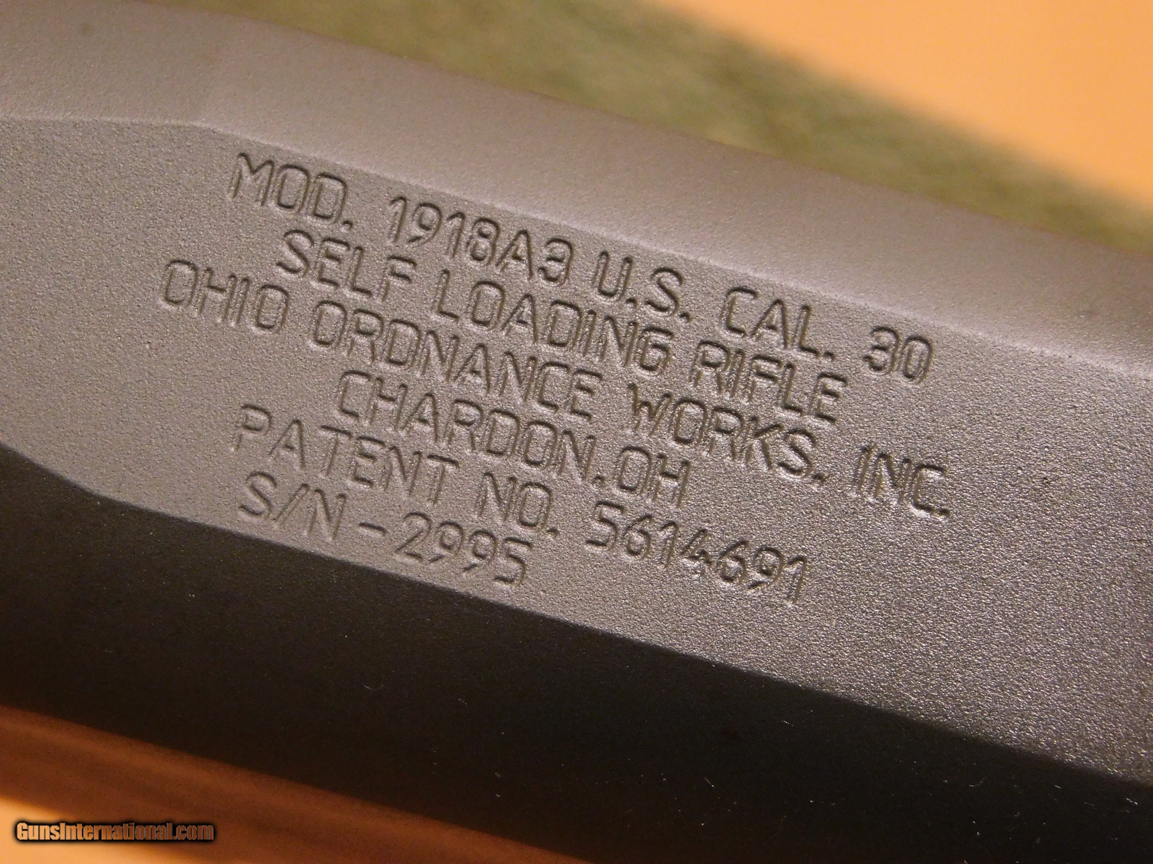 Description: Introduced in 1996, the Ohio Ordnance 1918A3 uses a combination of a new-made receiver and GI-surplus components to make a semi-automatic closed bolt copy of the signature Browning Automatic Rifle. The top of the receiver bears the model and caliber markings, with the "CHARDON, OH" address over the patent and four-digit serial number. This BAR features: