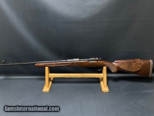 Description: Weighs 8lbs 14oz with a 15" LOP. Engraved and gold inlayed with a big horn sheep. This is a Browning custom shop rifle probably made around 2000. Beautiful piece of Turkish walnut with a long extraction and 3 position model 70 style safetly. Island style rear sight & banded front sight. This is as rare rifle and a beautiful rifle. Serial number is 330CS01101. Bolt action. Blue finish. 22" bbl. 270 win cal. SOLD Manufacturer: Browning Model: 98 Serial Number: 330CS01101 Caliber Info: 270 Condition: Great Finish: Blue |
