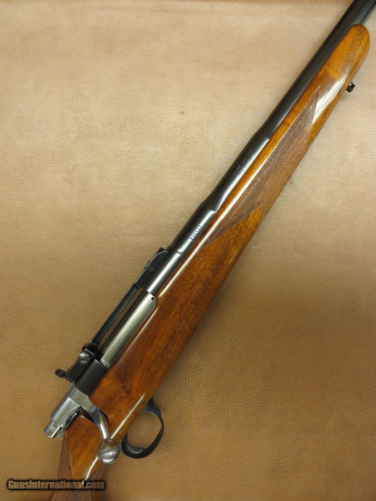 Description: .243 Winchester has 24 inch stepped heavy barrel. Made in Finland in 1967 on Sako roundtop action. Redfield scope mounting base with flip up peep sight. Engraved triggerguard and floorplate. Nicely figured high gloss checkered walnut stock has sling swivel studs, cheekpiece, and Pachmayr recoil pad with 14 1/2 inch length of pull. Blue is 98-99%. The wood is 95%. The magazine follower has been replaced with a single shot adaptor. SOLD Rifle Caliber: .243 Winchester |
