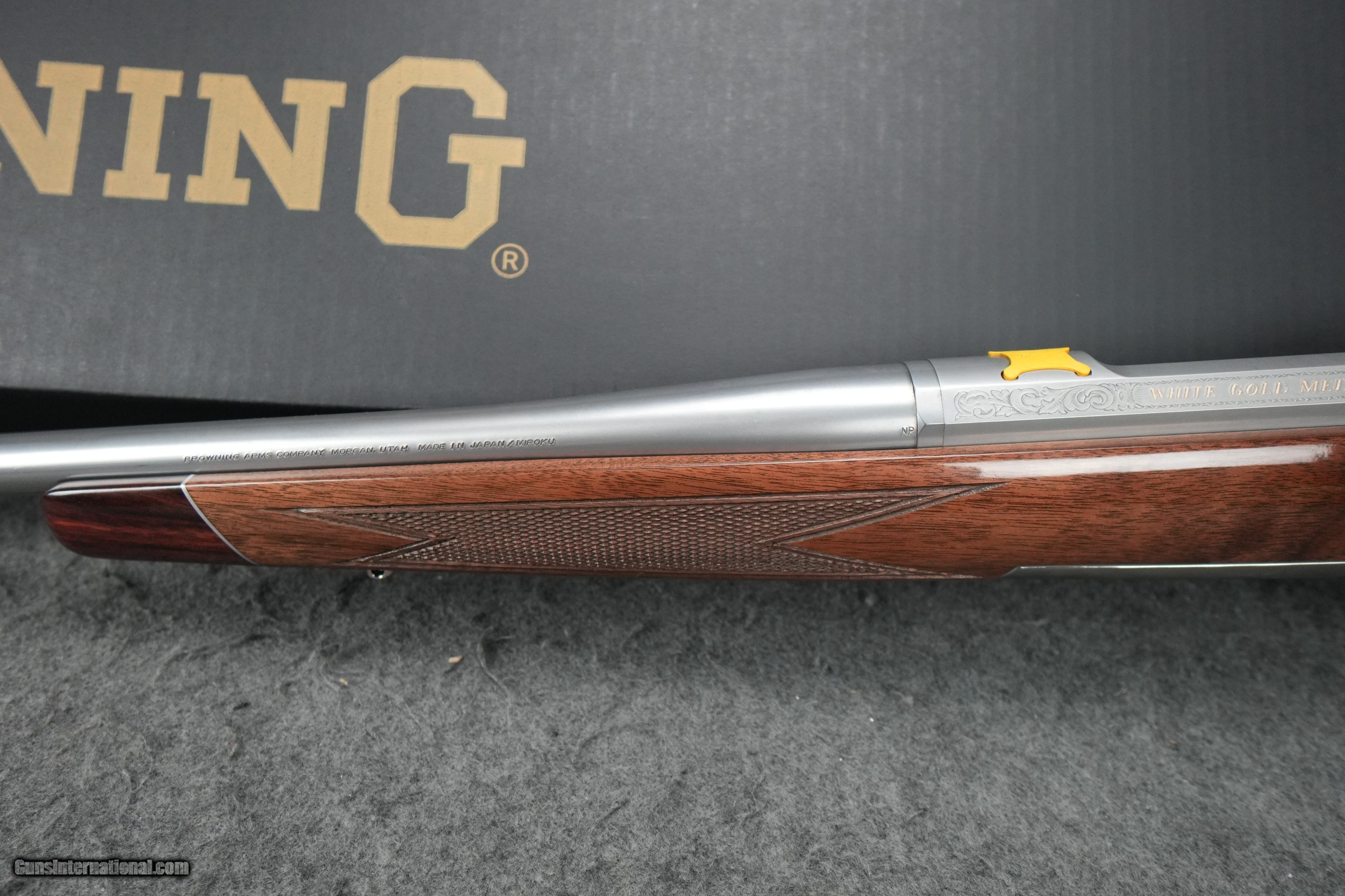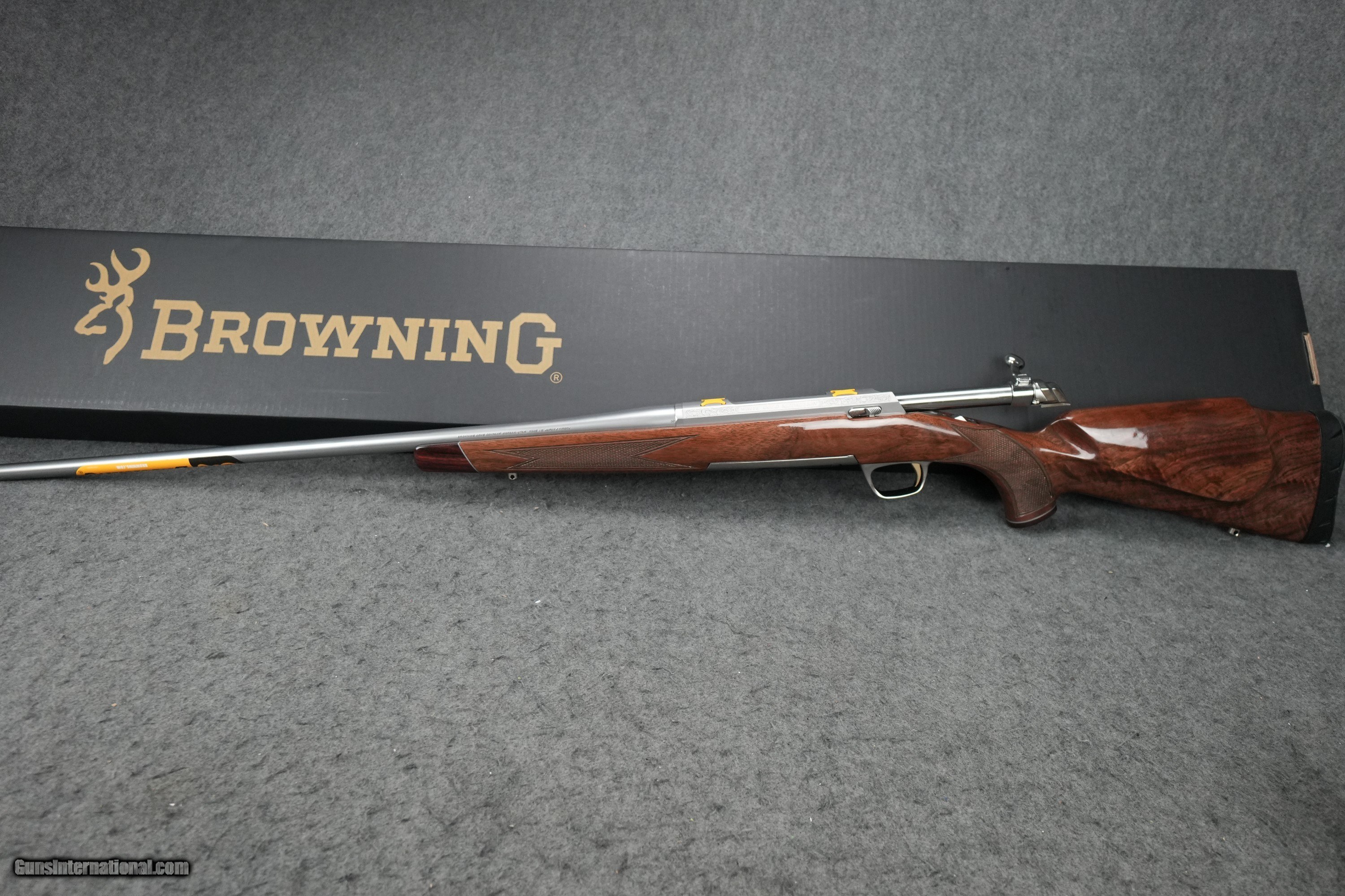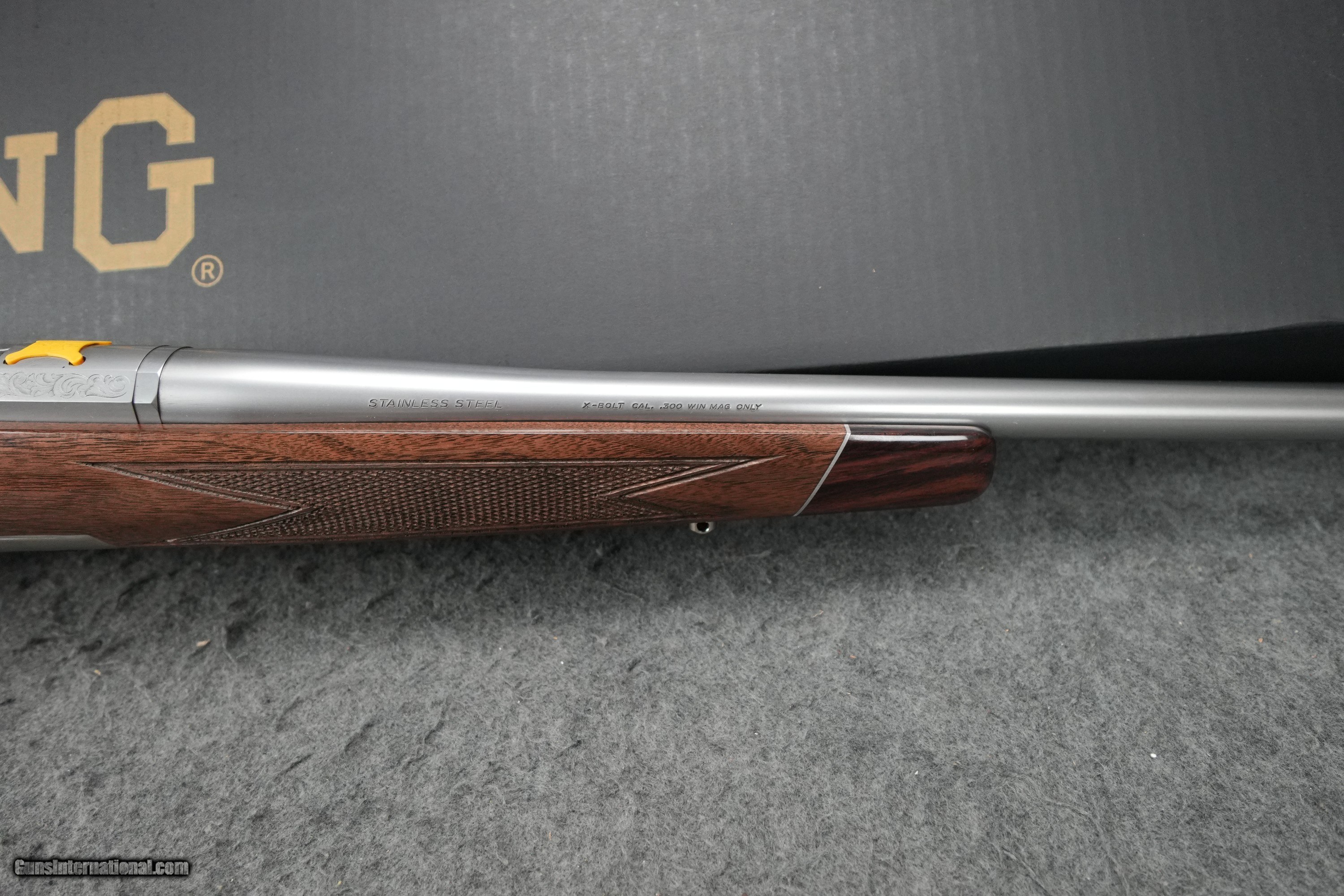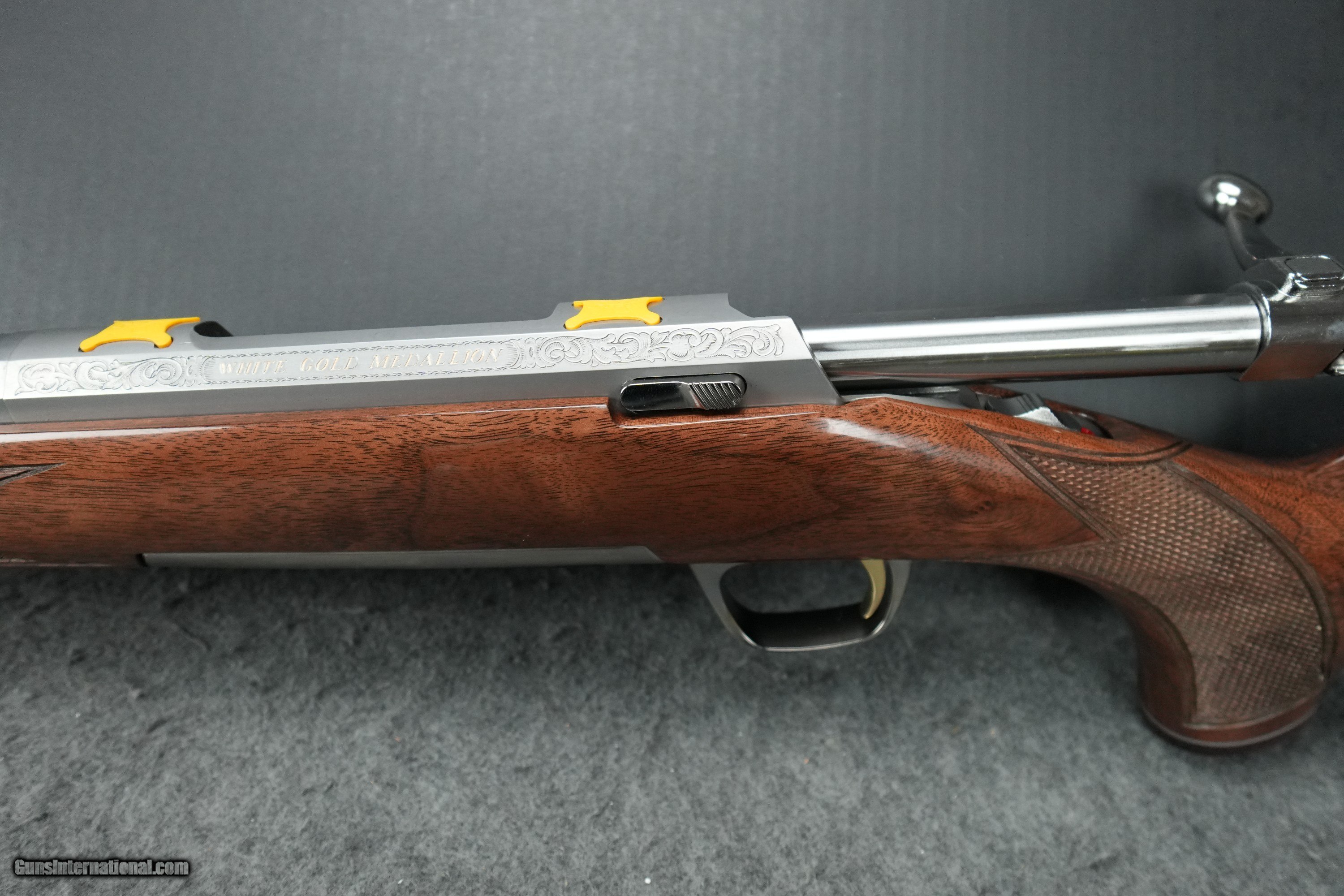 Description: Action: Bolt Caliber: 300 Win Mag Barrel Length: 26" Overall Length: 46 3/4" Length of Pull: 13 5/8" Drop at Comb: 3/4" Drop at Heel: 1 7/16" Weight: 7 lbs Capacity: 3 Twist Rate: 1 in 10 Barrel Finish: Satin Stock Finish: Gloss Wood Grade: Grade IV/V Receiver Finish: Satin Chamber Finish: Polished Barrel Material: Stainless Barrel Contour: Sporter Stock Material: Black Walnut Recoil Pad: Inflex 1, Small Pistol Grip Cap: Rosewood Checkering: Cut 18 LPI Sling Swivel Studs: Nickel Forend Cap: Rosewood Receiver Material: Stainless Trigger Finish: Gold Plated Trigger Guard Finish: Polished Sliver Bolt Slide Finish: High Gloss Magazine Type: Detachable Trigger Material: Alloy Trigger Guard Material: Alloy Trigger Guard Engraving: Buck Mark in Gold Receiver Engraving: Roll Floor Plate Material: Composite Drilled and Tapped for Scope: Yes SOLD Rifle Caliber: .300 Winchester Magnum |