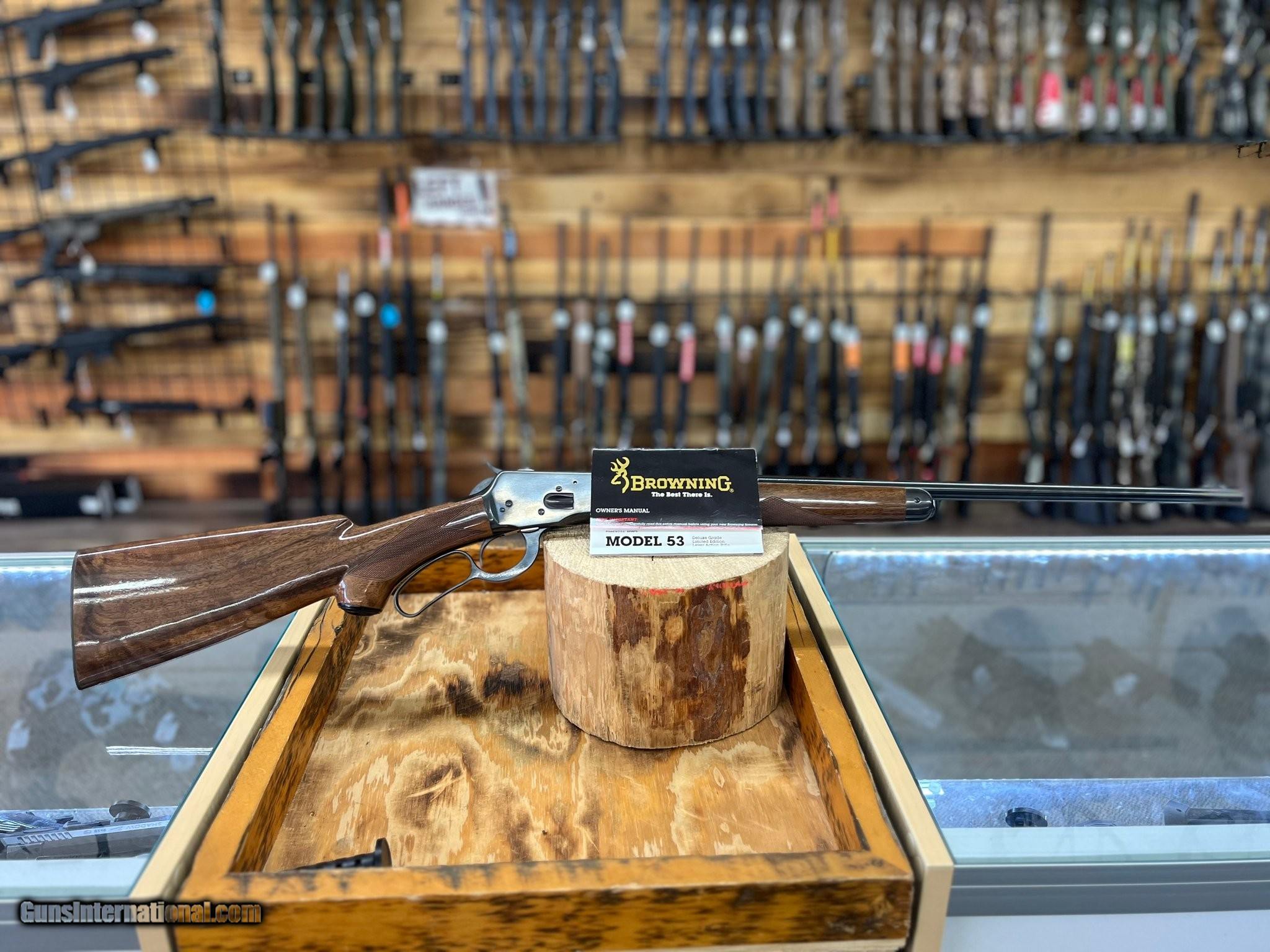 Description: Guns Listing ID: 563811 What‚s the best decision you‚ll make today? Buying this wonderful Browning 32-20 Rifle. Not only is this gun beautiful, but it is in spectacular condition. This gun is a Browning model 53 chambered in 32-20 Winchester. Not only is this gun in amazing condition, but has the perfect stock and fore-end to match. The fore-end and stock are matching with dark walnut. This gun has the perfect bluing to match it. This gun was made in Japan by Miroku. It was built as a lever action with the capacity of 7. This gun is 4052 out of 5000. There were 5,000 of these models made in 1990. Browning model 53 was only made for one year which was 1990. This gun has a 22-inch barrel along with a U sight. It also comes with the original manual. SOLD Manufacturer: BROWNING Model: 53 Caliber Info: .32-20 WIN Condition: Used - Non-Certified Barrels: 22" BARREL Action: LEVER ACTION Finish: black & blued |