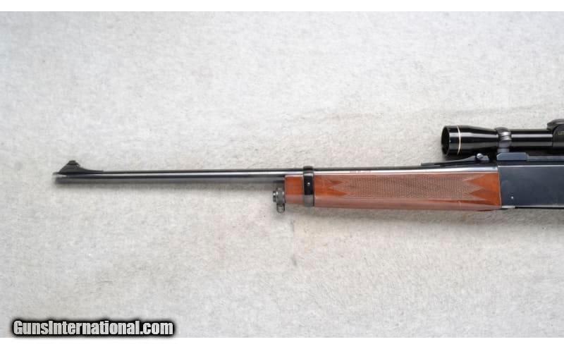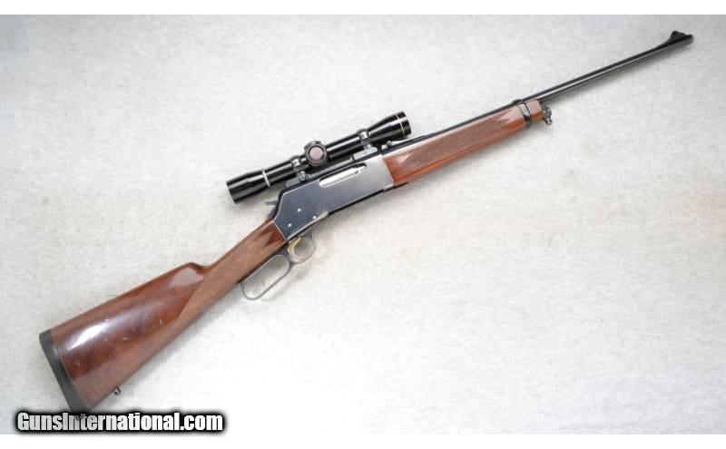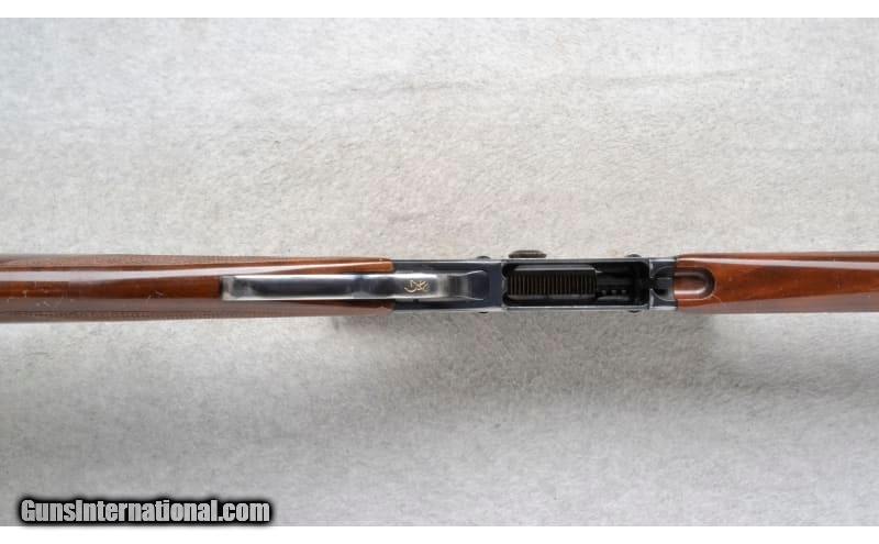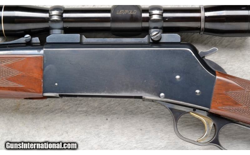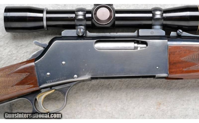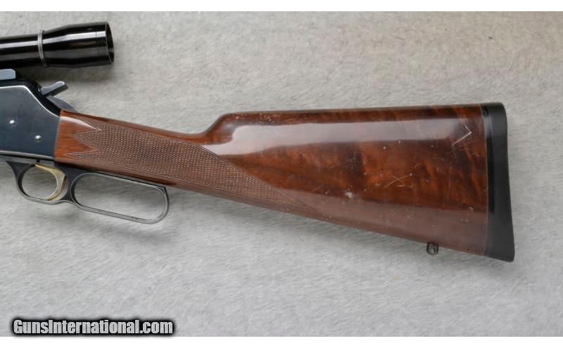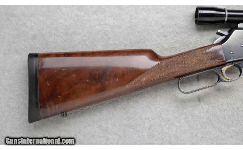 Description: This Browning Model 81 BLR is a right hand lever action rifle in .308 Win. Cal. It has a 20 inch barrel. A raised blade front sight and an adjustable notch middle sight. It is outfitted with a Leupold Scope. The butt stock is a checkered grip walnut straight grip. The forearm is a checkered grip walnut with a barrel band. .308 Winchester SOLD Chambers: Detachable Magazine. Metal Condition: "Fair. Has some blue wear, light handling marks and minor freckling. Wood Condition: Fair. Has many light handling marks. Bore Condition: Excellent. Barrels: 20 inch. Stock Dimensions: LOP 14 inches. Fore End: Checkered grip walnut with a barrel band. Butt Pad: Browning black rubber pad. Weight: 7 Lb. 14 Oz. Sights: Raised blade front. Adjustable notch middle. Leupold M8-4X Compact Scope. Item Location: Richfield, WI |