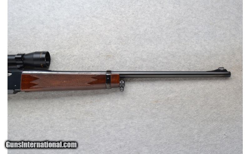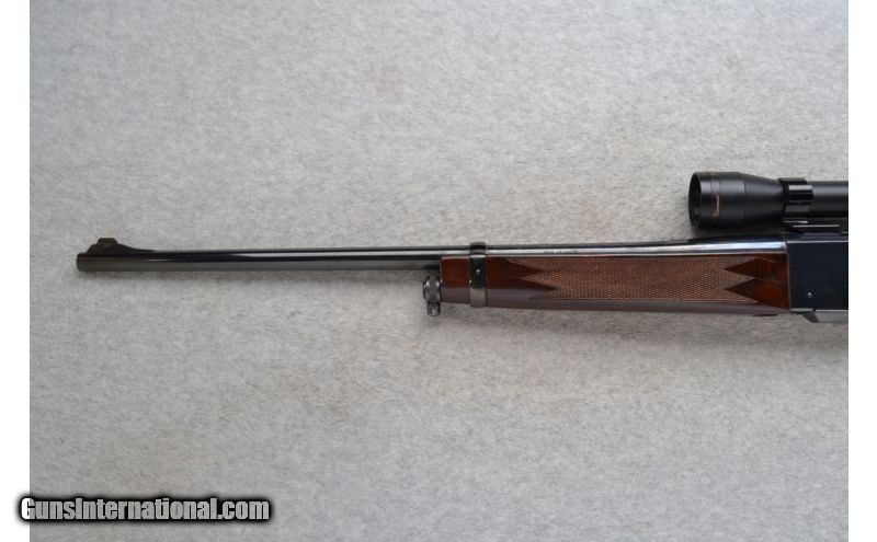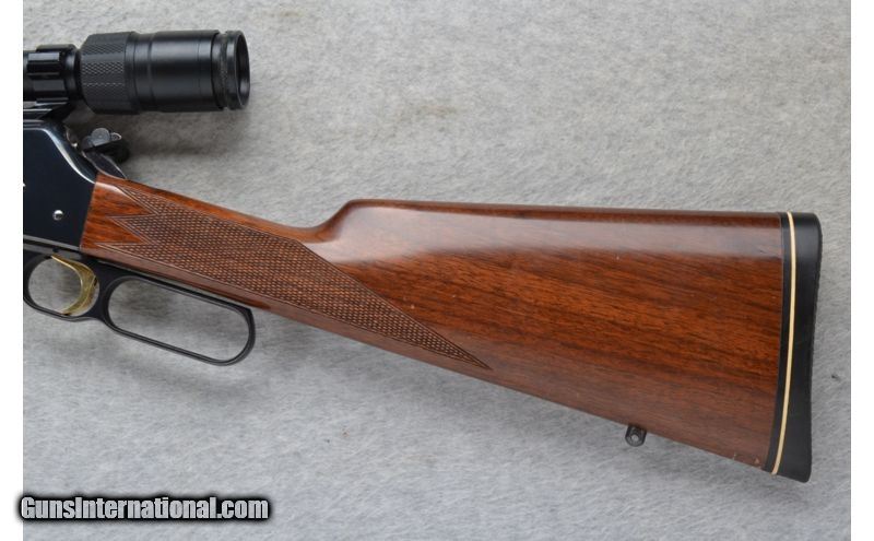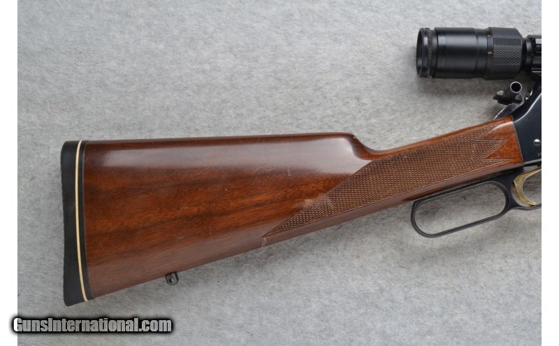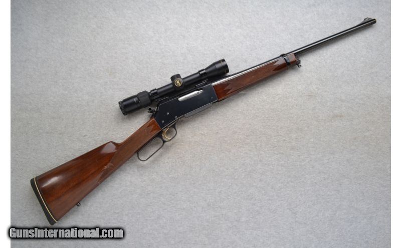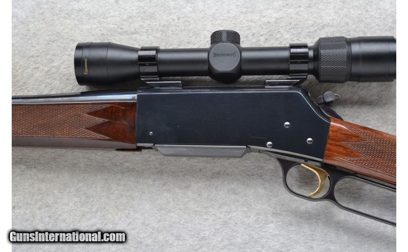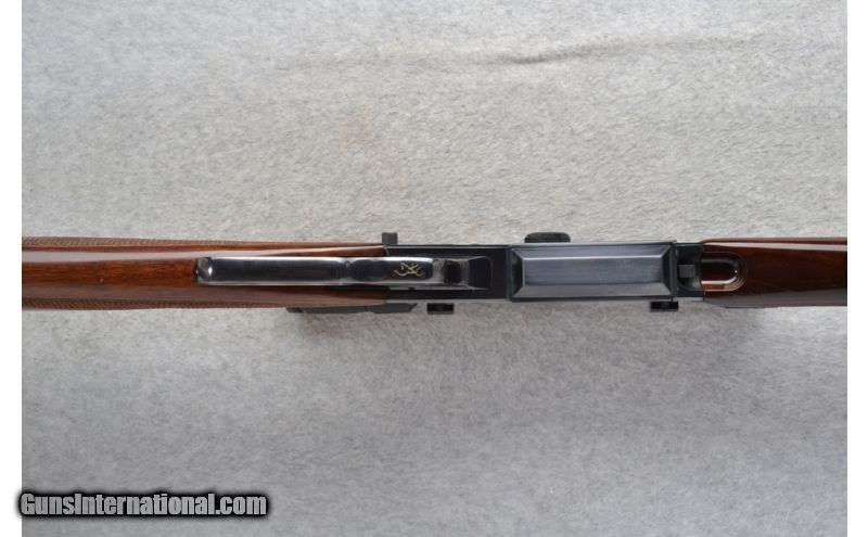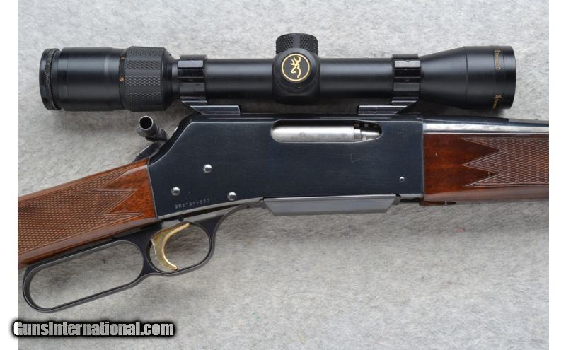 Description: This Browning Model 81 BLR is a lever action repeating rifle in .358 Win. Cal. Only. It has a 20 inch barrel with a front blade sight. The stock is a checkered walnut straight grip and it has a forearm barrel band. It is outfitted with a Browning 2-7x32 Scope. Has a rack and pinion gear slide with rotating breech head, fold down hammer and the trigger travels with the hammer. This rifle is in good condition. SOLD Manufacturer: Made in Japan. Caliber Info: .358 Win. Only Chambers: 3 shot detachable magazine. Metal Condition: Very good. Minor handling marks. Wood Condition: Good with light handling marks. The forearm has what appears to be surface cracks. Bore Condition: Excellent. Barrels: 20 inch blued with front sight. Triggers: Grooved Golden. Stock: Checkered walnut straight grip stock. Stock Dimensions: LOP 13 3/4 inches. Fore End: Checkered grip walnut with a barrel band. Butt Pad: Browning black rubber pad. Weight: 8 lbs. 0 oz. Sights: Raised blade front. Browning 2-7x32 Scope. Item Location: Richfield, WI |