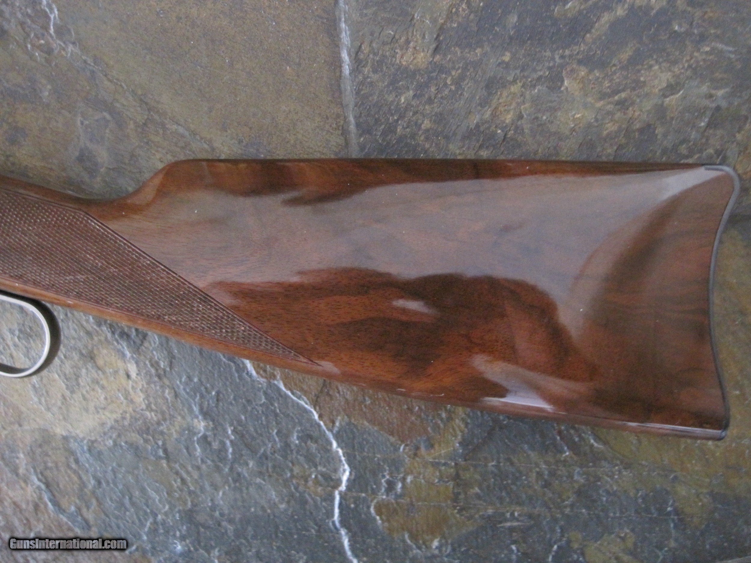 Description: SALE PENDING--Browning 1886 limited edition high grade carbine. .45-70 Govt caliber, saddle ring carbine, 22 inch round barrel, 7 shot full magazine, crescent buttplate, open sights. Checkered high grade walnut stock and forearm, greyed steel receiver featuring engraved gold inlay game scenes of deer and bear. Signed by the engraver. Only 3,000 manufactured 1992-1993. Very good, unfired condition, no box. Very light, hard to photograph (due to the high gloss finish and glare) handing marks. None the less, this is a beautiful high grade 1886 with highly figured walnut. Must ship to an FFL, no sales to CA. SALE PRICE! Reduced from $2,750.00. SOLD |