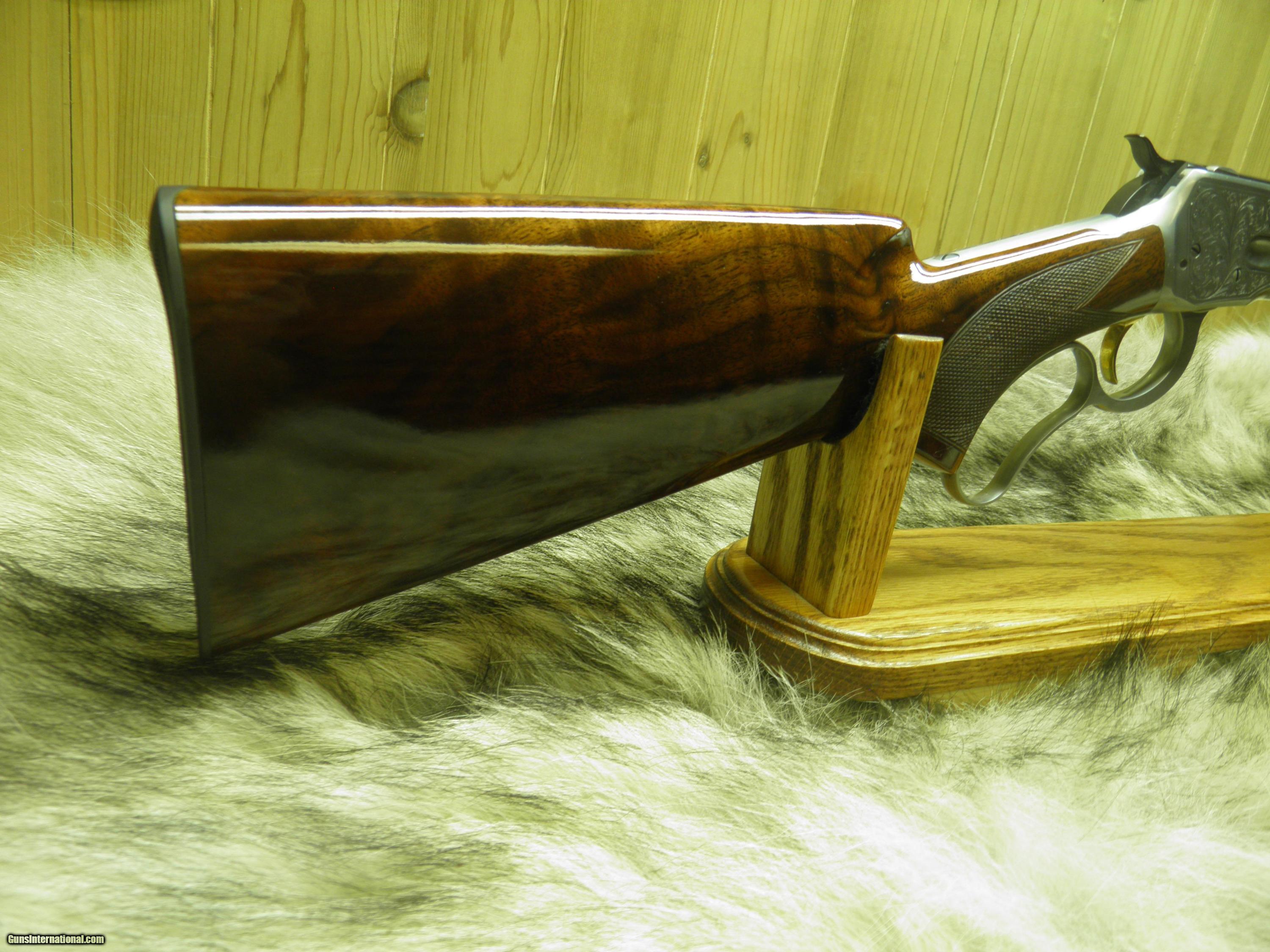 Description: BROWNING MODEL 65 HIGH GRADE CAL: 218 BEE MANF: 1989 1 OF 1500, LEVER ACTION WITH VERTICAL LOCKS, BARREL LENGTH 24" , SIGHTS, OPEN, REAR BUCKHORN STYLE ADJUSTABLE, FRONT_ HOODED RAMP STYLE, OVERALL LENGTH 41 3/4", APPROX: WEIGHT 6 LBS. 12 OZ, LENGTH OF PULL 13 1/2", TUBULAR MAGAZINE HOLDS SEVEN ROUNDS, RECEIVER AND LEVER GRAYED STEEL WITH SCROLL ENGRAVING ENCOMPASSING BOTH SIDES, SERVES AS A SETTING FOR THE GAME SCENES COYOTE LEFT SIDE, BOBCAT ON THE RIGHT, EACH ANAMIL IS HIGHLIGHTED IN 24KT GOLD. STOCK- SELECT HIGH GRADE AMERICAN WALNUT WITH A FULL PISTOL GRIP BUTT STOCK, SEMI-BEAVERTAIL FOREARM, BEAUTIFUL HAND-CUT-CHECKERING, FINISHED IN A HIGH GLOSS, BARREL HIGHLY POLISHED AND DEEPLY BLUED FINISH. ONE BEAUTIFUL SMALL GAME RIFLE, THAT IS 100% NEW AND UNFIRED IN FACTORY BOX WITH OWNERS MANUAL!! SOLD |