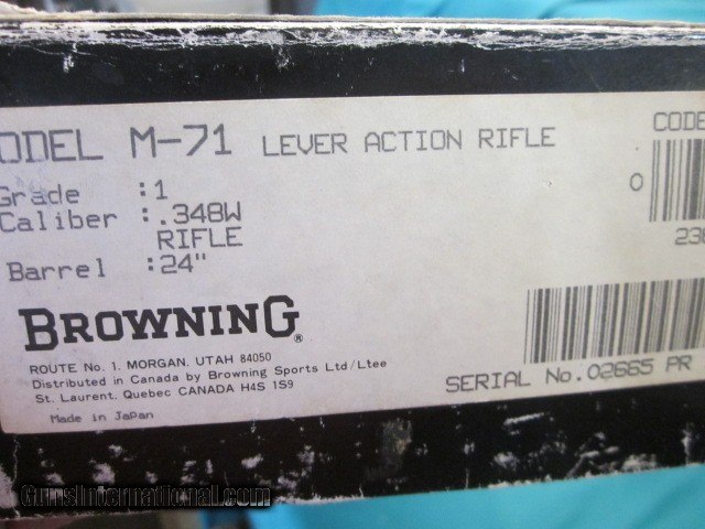 Description: Browning Model 71 grade 1 rifle new in box .348 win cal. no owners manual, forend has shallow dent on right hand side, see picture, otherwise new in box condition. ADD 3% for credit cards, shipping is 35.00. 260 409 9828 SOLD |