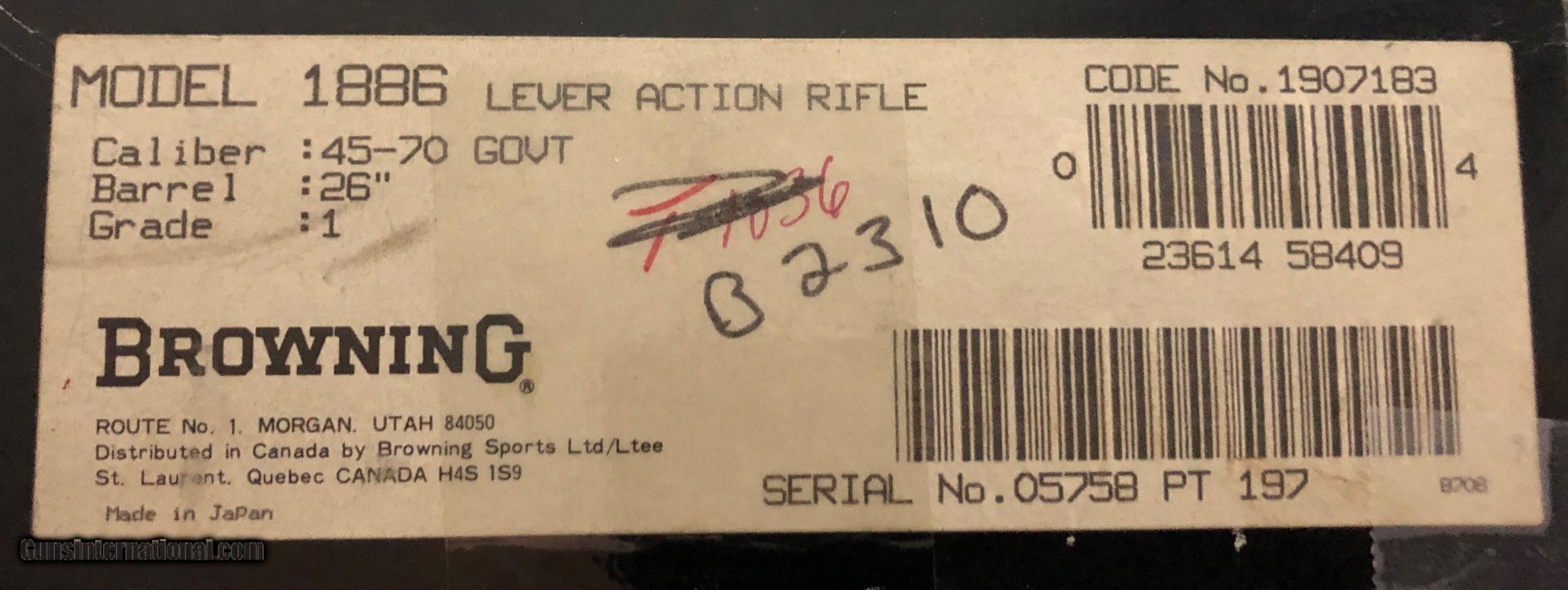 Description: SOLD !!! Unfired Browning 1886 45-70 with box. see photos! Please call Mark 715-814-1295 Pack and ship $45 LAYAWAY: Layaway is available with 1/3 down of final total price including shipping/insurance within 7 days . Balance due in 45 days. Layaway Sales and guns modified at time of sale are FINAL with no refunds, no inspections, no returns. Chokes may be opened to your choice at time of sale for $50 per barrel . SOLD Rifle Caliber: .45-70 Government Manufacturer: BROWNING Model: 1886 Condition: NEW IN BOX Manufacture Date: 1992-1993 |