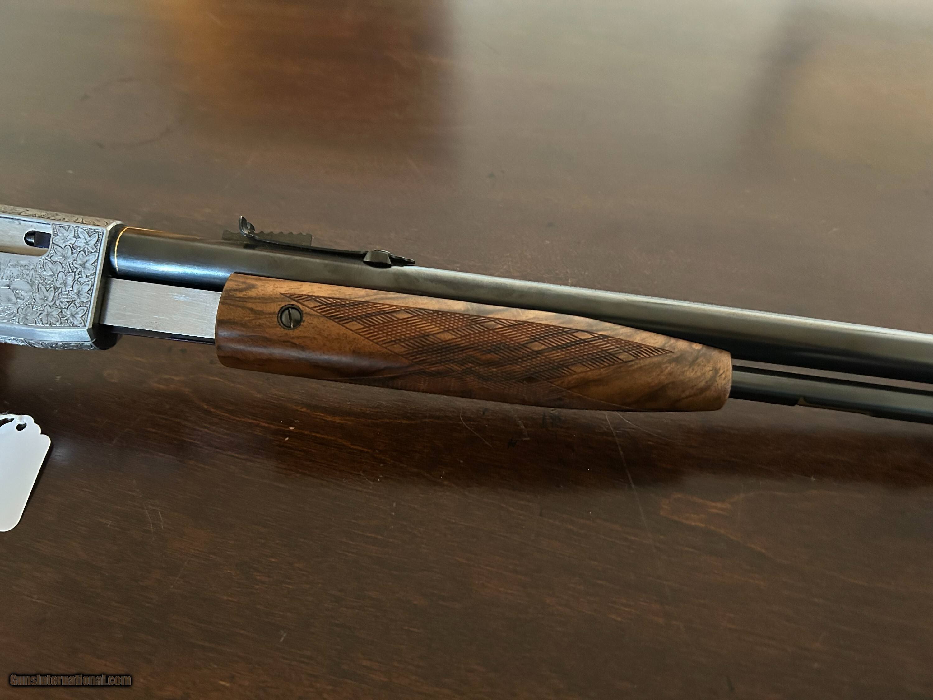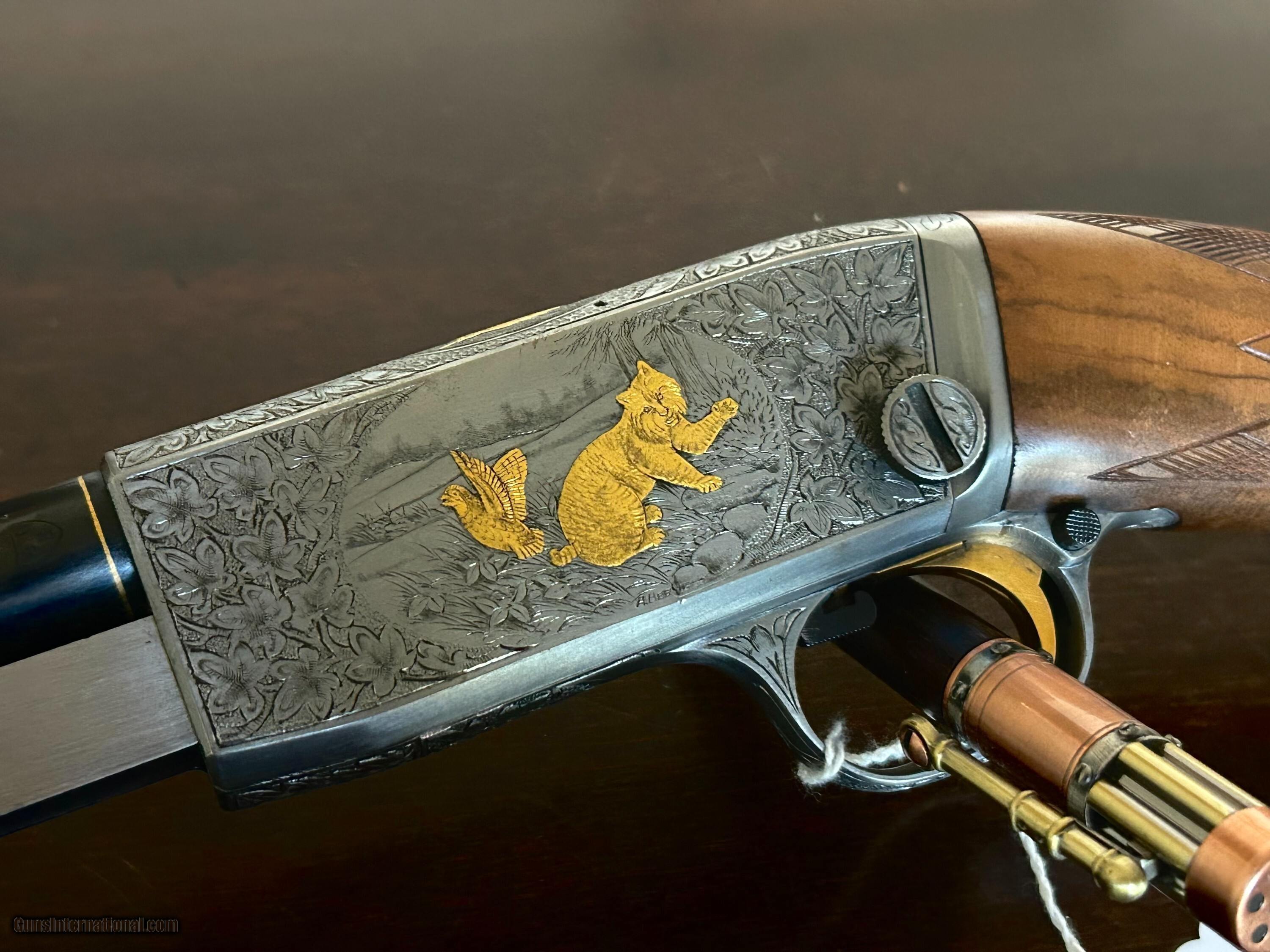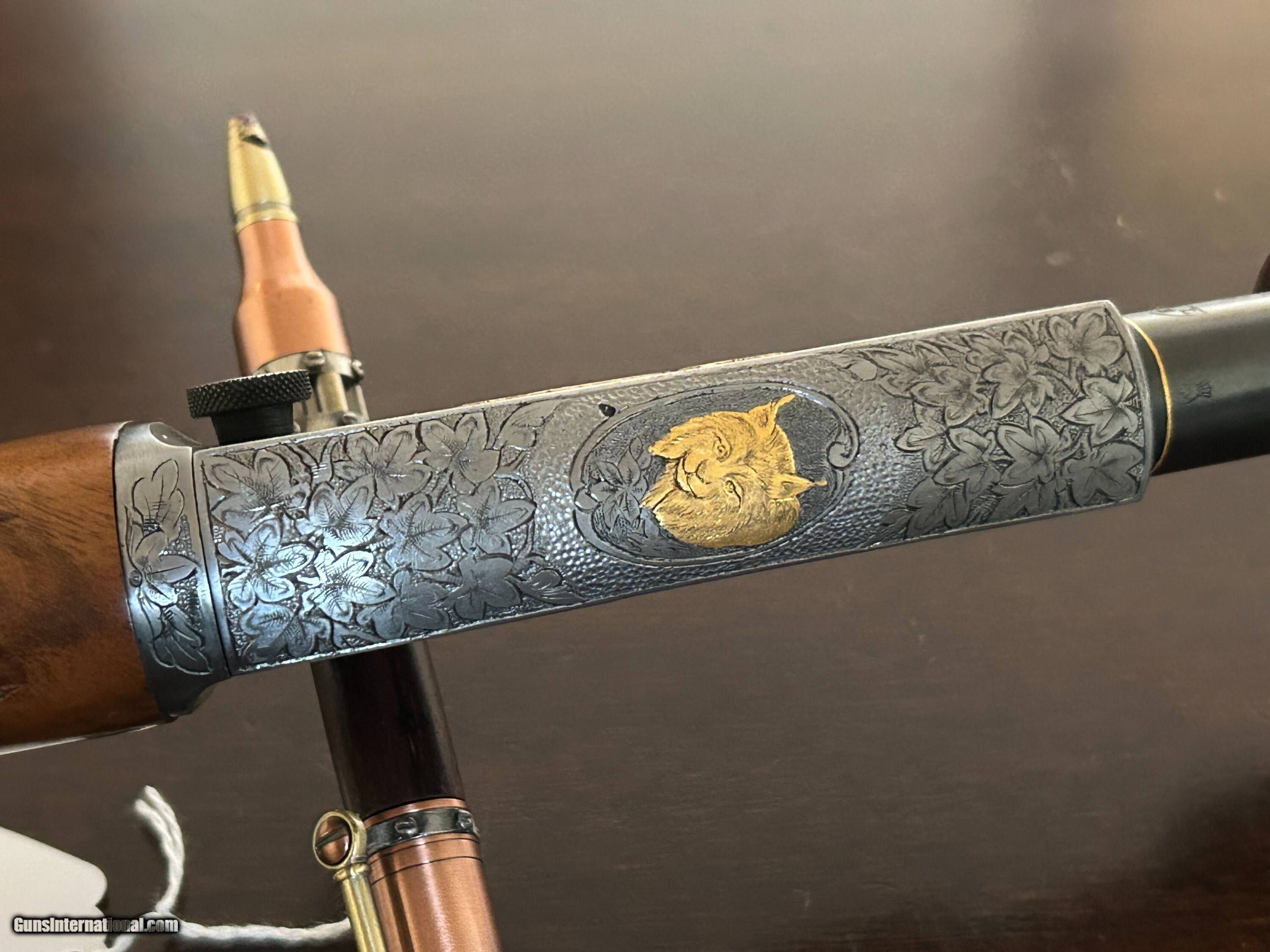 Description: Magnificent Browning Trombone .22lr Gold inlays. checkered butt Amazing wood serial # 143018 Front and rear sights. Superb oil finish Signed on both sides by Angelo Bee. Amazing deep engraving Rifle Caliber: .22 Long Rifle Manufacturer: Browning Model: Trombone Condition: Exc Metal Condition: Exc Wood Condition: Exc Bore Condition: Exc Triggers: single Stock: ROUND KNOB Price: $13,500.00 Contact Seller |